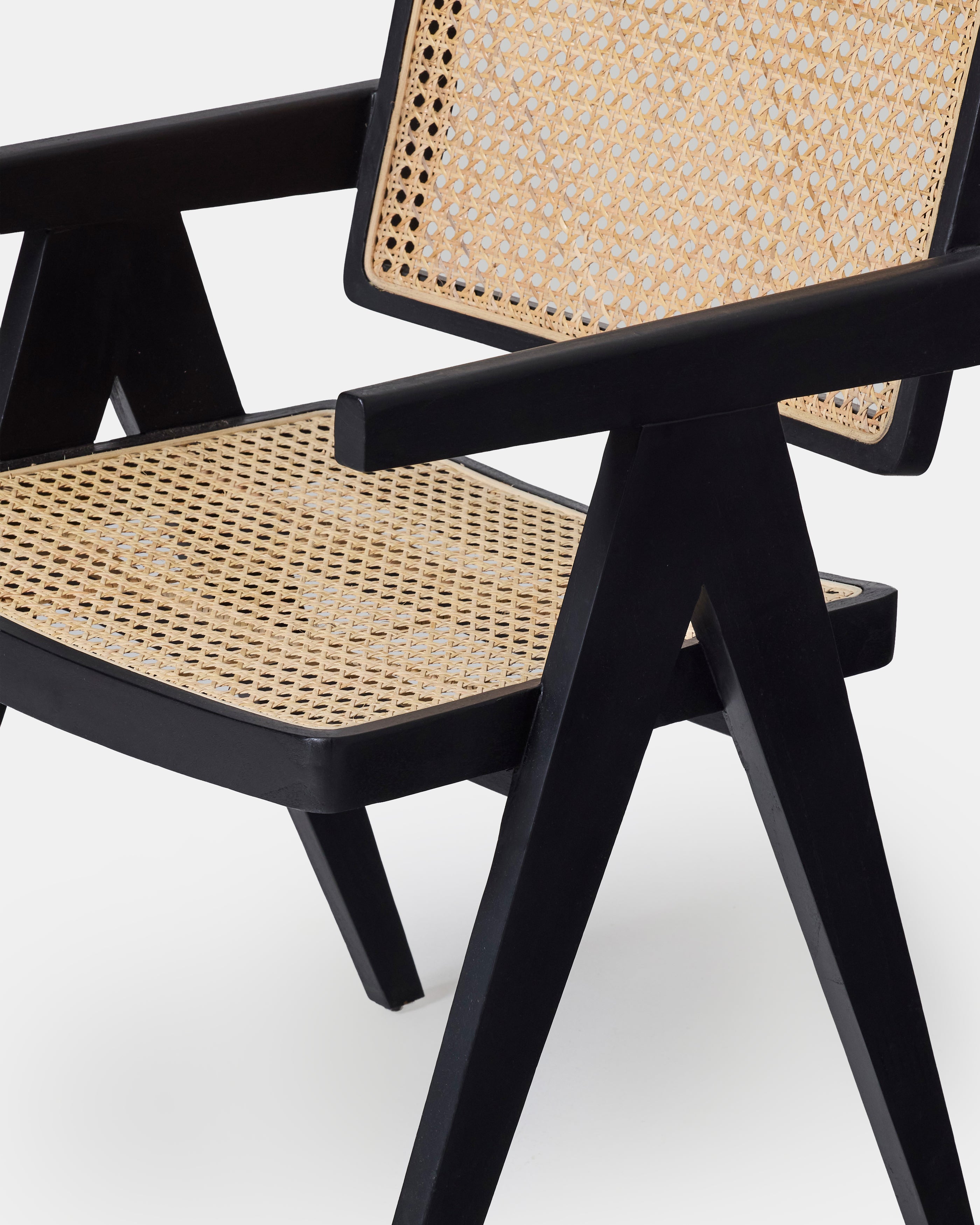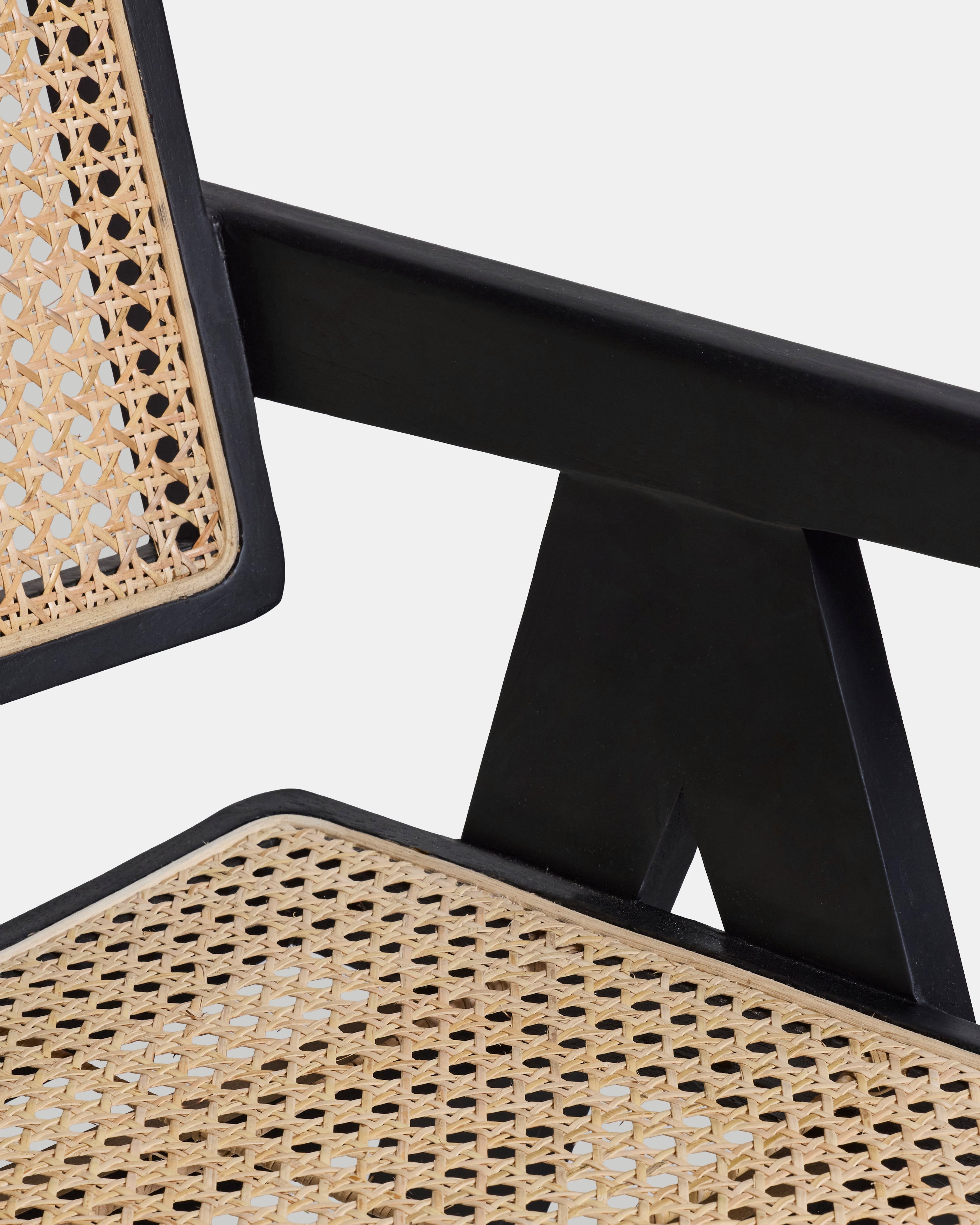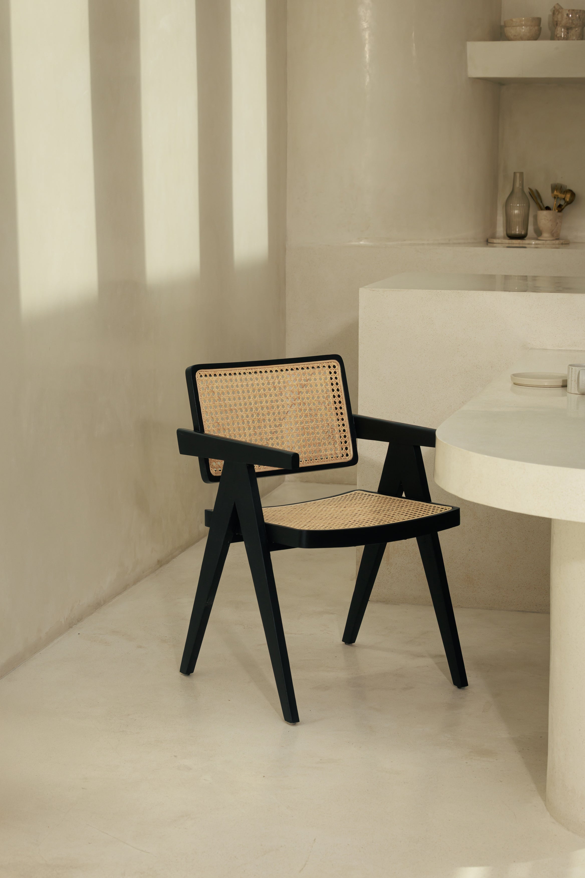 La chaise Dwi en bois de teck noir et cannage naturel trouve son équilibre dans le dialogue subtil de ses matières. Le teck teinté absorbe la lumière et affirme une présence profonde, tandis que le cannage tressé à la main laisse respirer l’espace et apporte une sensation de légèreté visuelle. Chaque ligne est pensée avec précision, chaque détail reflète le geste de l’artisan, entre rigueur graphique et douceur naturelle. Autour d’une table de salle à manger, dans un bureau ou un espace de vie contemporain, elle installe une atmosphère chaleureuse et maîtrisée, où le design s’exprime sans excès et où l’élégance naît de la simplicité des formes et de la noblesse des matières.