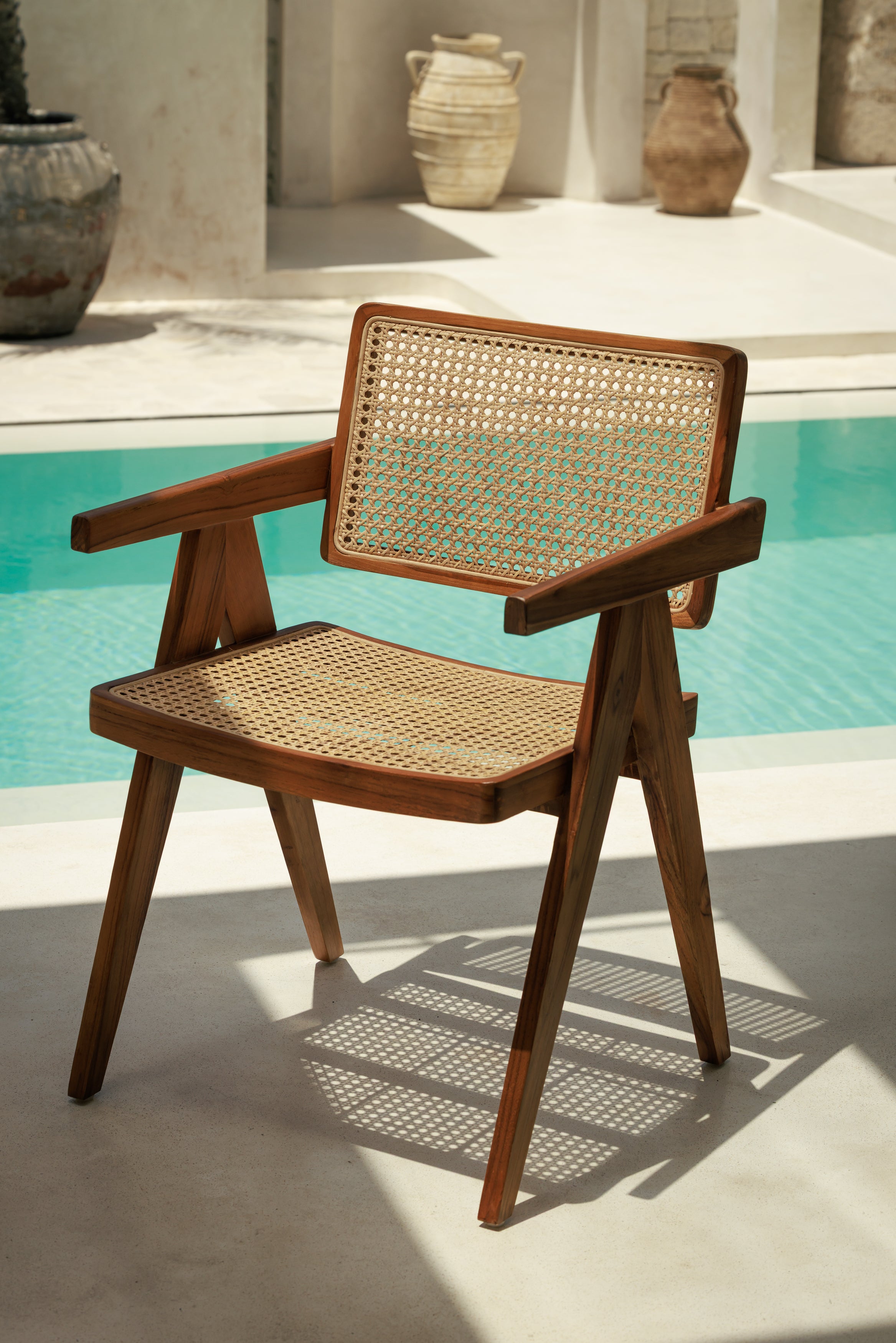 La chaise Dwi en teck naturel dessine une silhouette structurée et élégante, inspirée des grands codes du modernisme et de l’esthétique de Pierre Jeanneret dans une interprétation contemporaine. Son écriture, fidèle à l’esprit d’une imitation Jeanneret, se lit dans la rigueur de sa structure et la justesse de ses proportions, tandis que la délicatesse d’un cannage tissé à la main vient adoucir l’ensemble par un jeu de transparence et de lumière. La chaleur du bois massif dialogue avec la finesse du rotin, révélant chaque ligne, chaque angle, chaque transition de matière. Le dossier légèrement incliné et l’assise souple offrent un confort discret, pensé pour accompagner les moments passés autour d’une table ou dans un espace de travail, dans une atmosphère à la fois architecturale, chaleureuse et intemporelle.