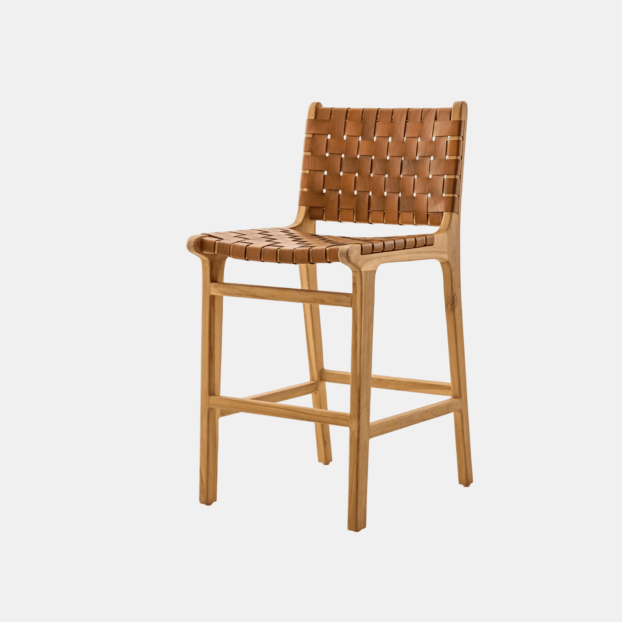 La chaise haute Oka habille un bar ou un îlot de cuisine d'une ligne sobre et artisanale. Sa structure en teck massif blanchi s'associe à une assise en cuir marron tressé main, pour une pièce à la fois naturelle, soignée et agréable au quotidien.
