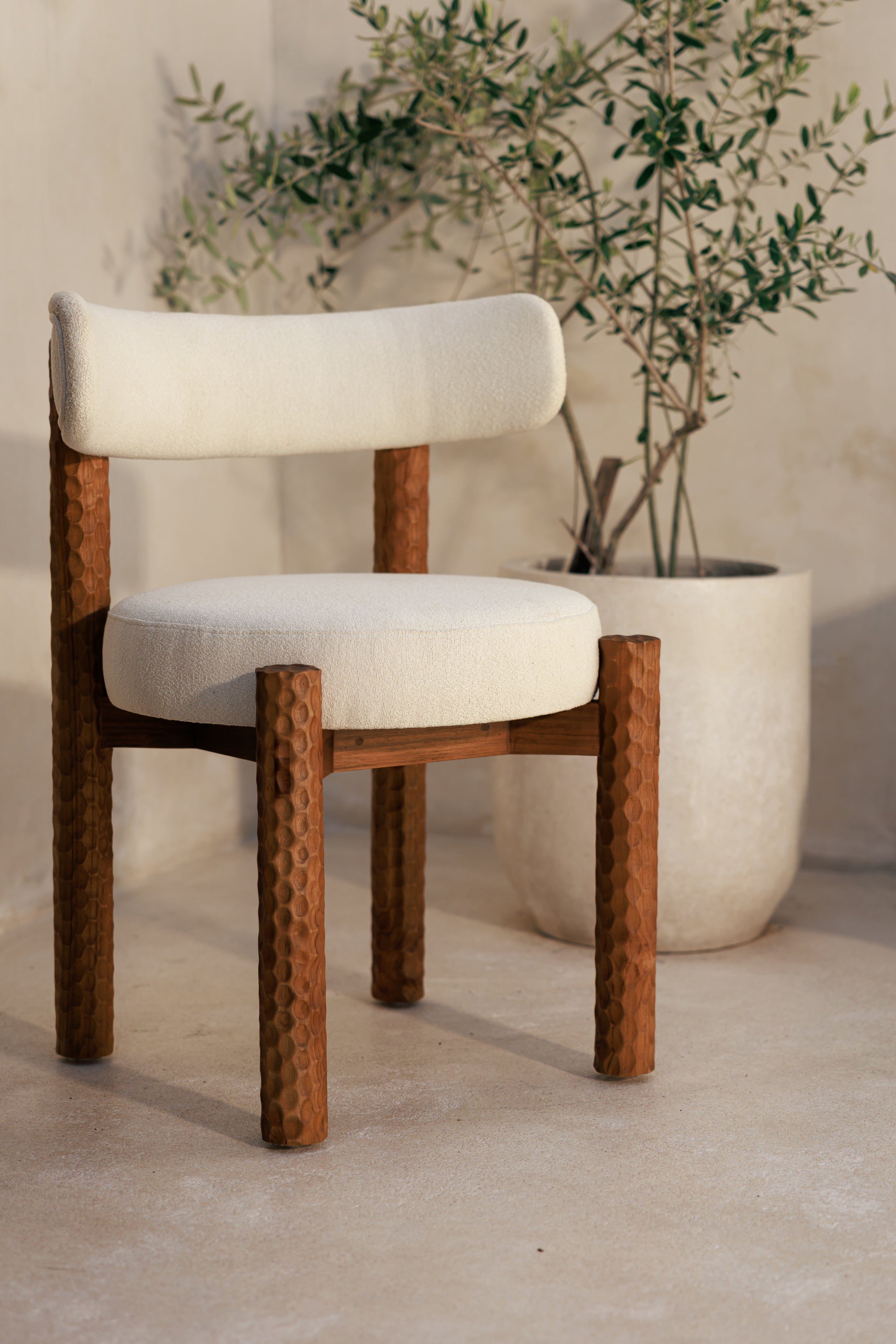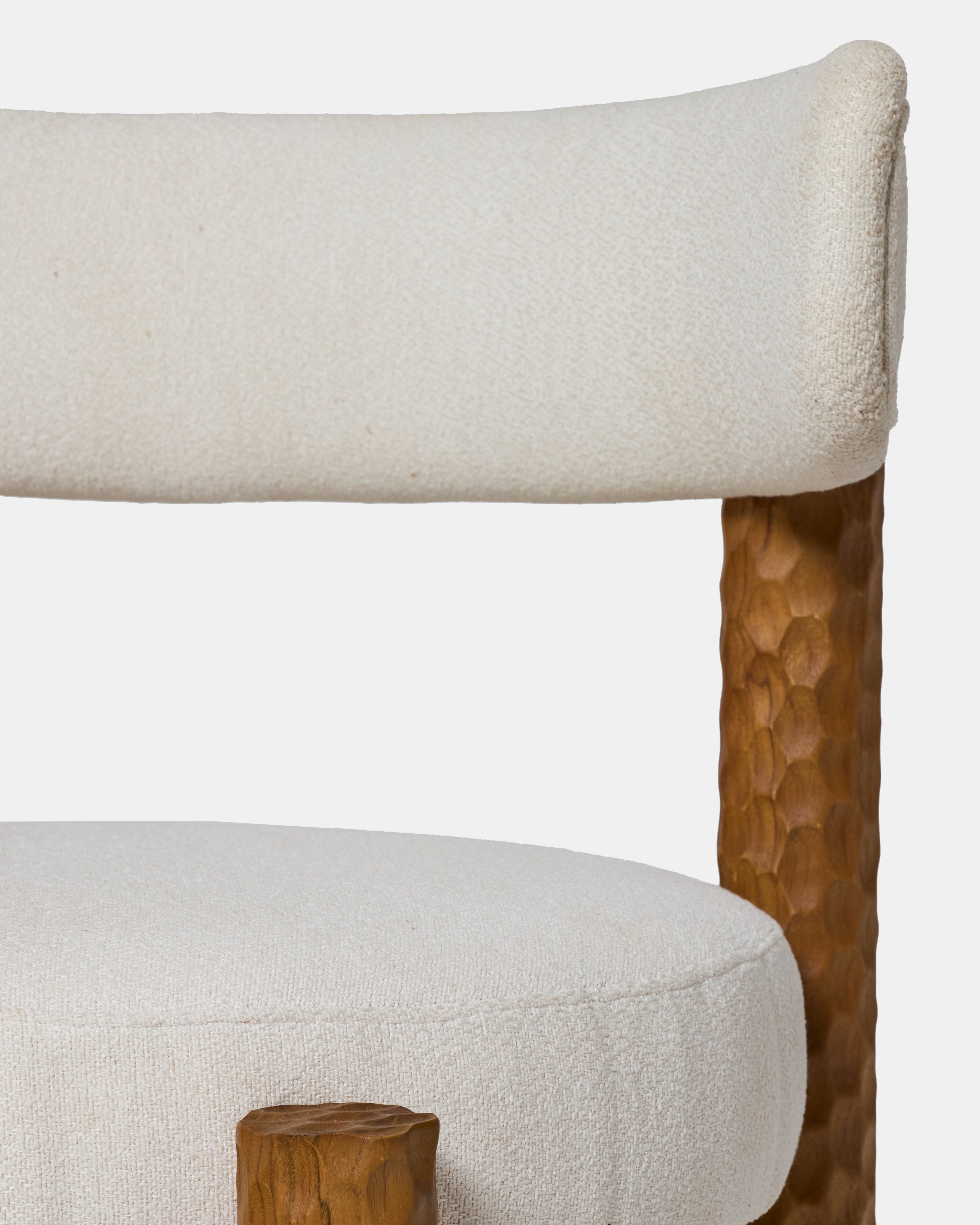 La chaise Subur blanche associe un tissu lumineux, doux et dense au toucher, à une structure en bois de teck massif sculpté à la main. Le contraste entre la clarté du textile et la profondeur du bois crée une sensation à la fois élégante et rassurante. L’assise épaisse et le dossier cylindrique enveloppent le corps avec confort, tandis que le teck texturé apporte une présence forte et stable. Une chaise pensée pour être vécue au quotidien, où la matière devient une expérience à part entière.