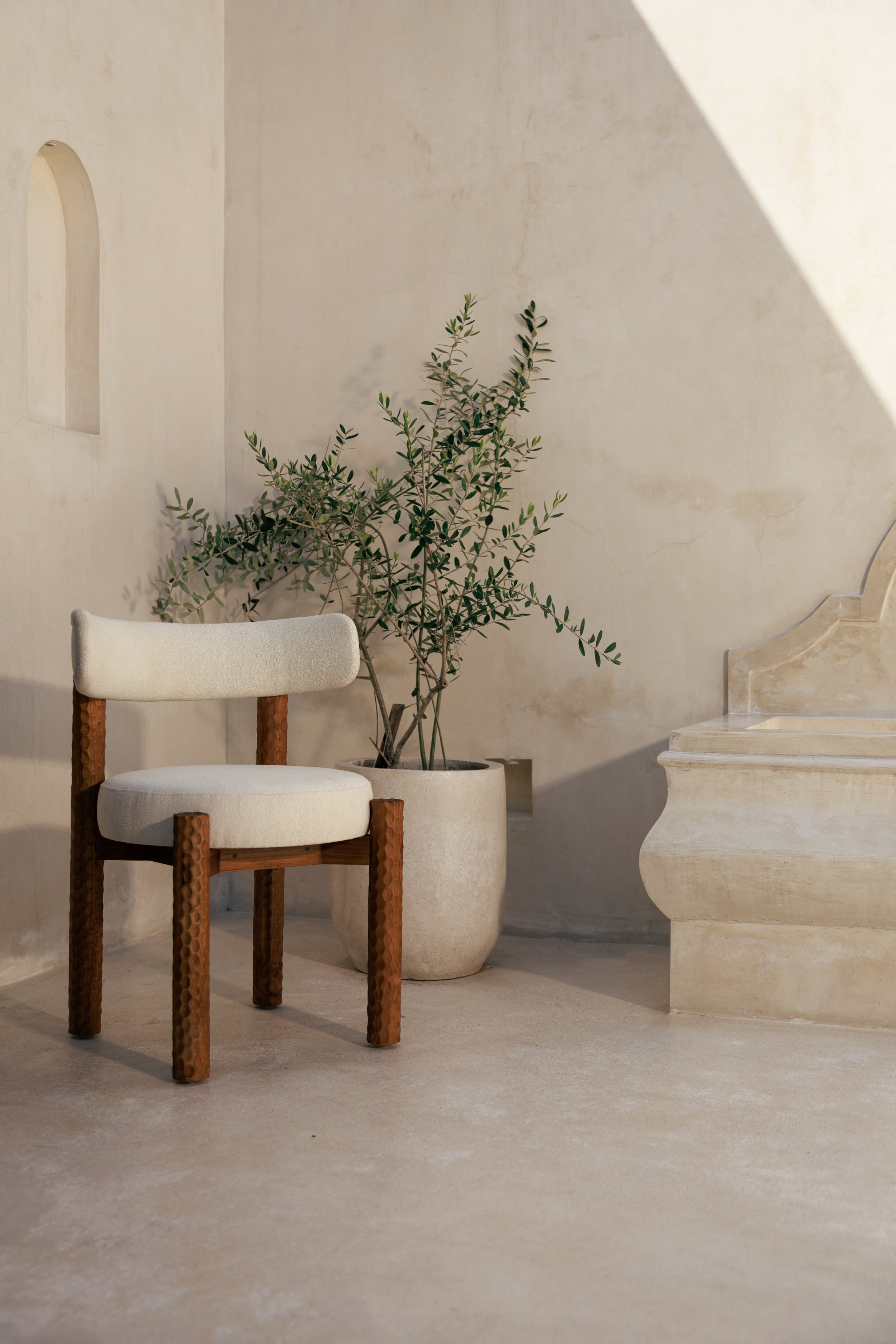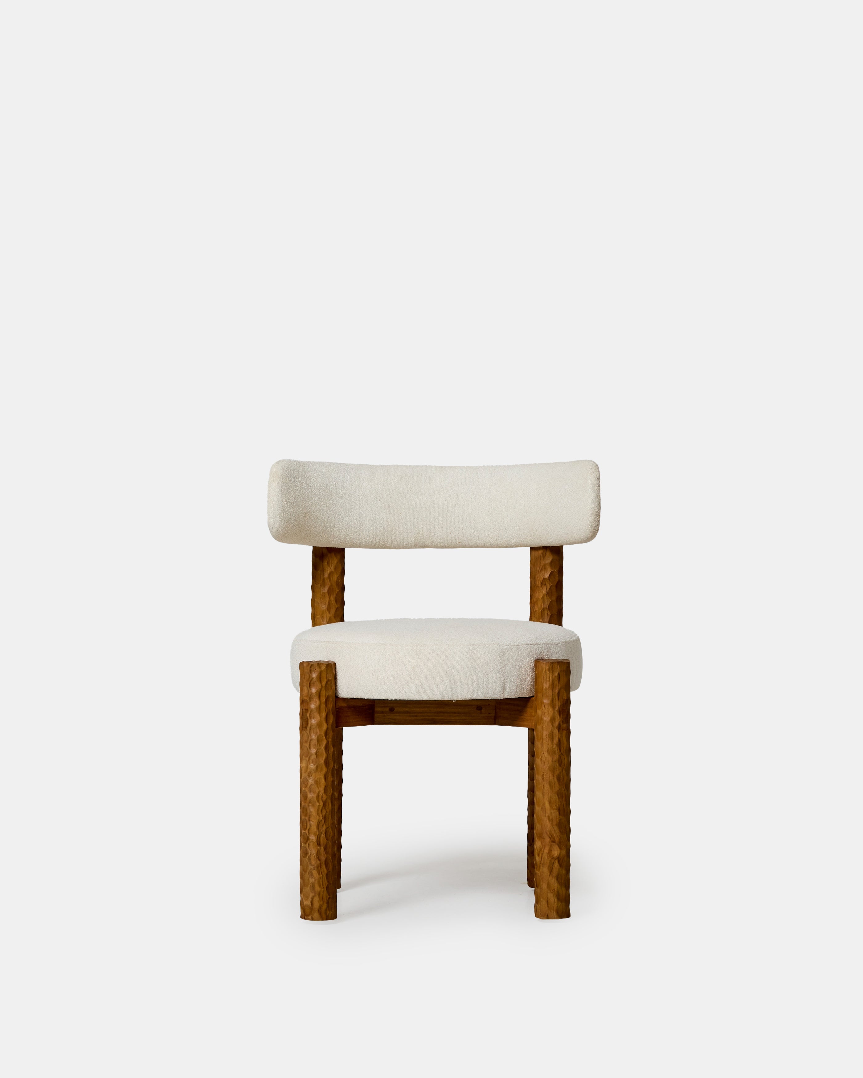 La chaise Subur blanche crée dans l’espace une impression de douceur sculpturale, portée par le contraste entre la rigueur presque architecturale de son piètement taillé et la générosité de son assise tapissée d’un textile clair au toucher feutré, une pièce où le bois révèle ses reliefs comme une matière vivante et où la lumière vient se poser avec délicatesse, composant une atmosphère à la fois graphique, chaleureuse et subtilement enveloppante, pensée pour accompagner aussi bien une table de repas qu’un espace plus intime avec la même élégance silencieuse.