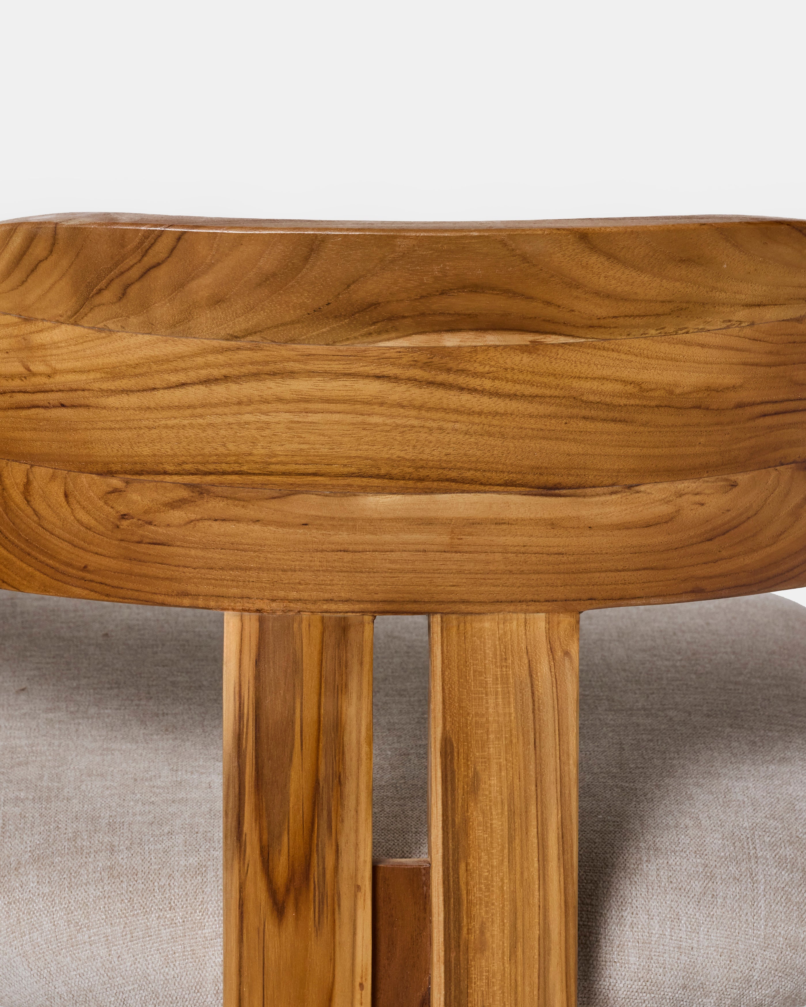 La chaise trépied Ataya beige se distingue par son élégance fluide, alliant la chaleur d'un teck massif poli à la douceur d'un textile sable. Sa structure artisanale capte la clarté du jour pour dessiner une atmosphère calme et sophistiquée, offrant un point de repos visuel aussi bien autour d'une table que devant un bureau.