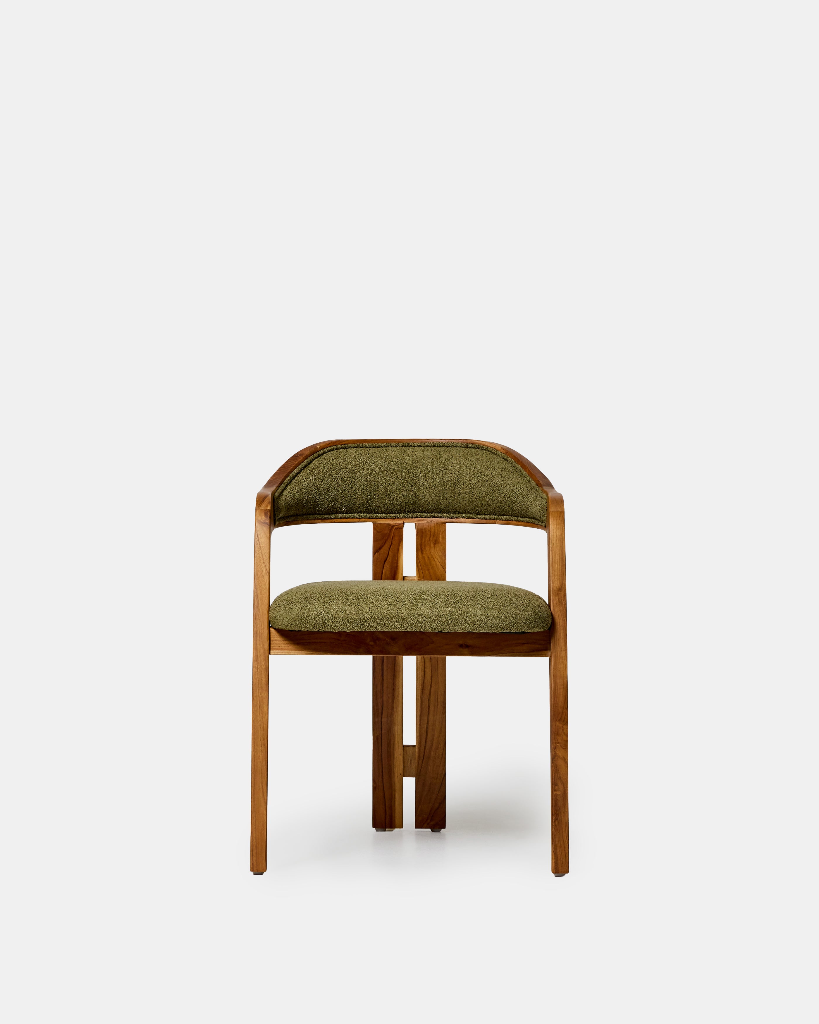 La chaise Trépied Ataya verte installe dans l’espace une sensation de calme feutré, portée par la profondeur végétale de son tissu et la chaleur naturelle de sa structure en bois, une pièce pensée pour dialoguer avec la lumière et les matières environnantes, apportant à une salle à manger ou à un bureau une élégance subtile où chaque détail participe à une atmosphère raffinée et enveloppante.