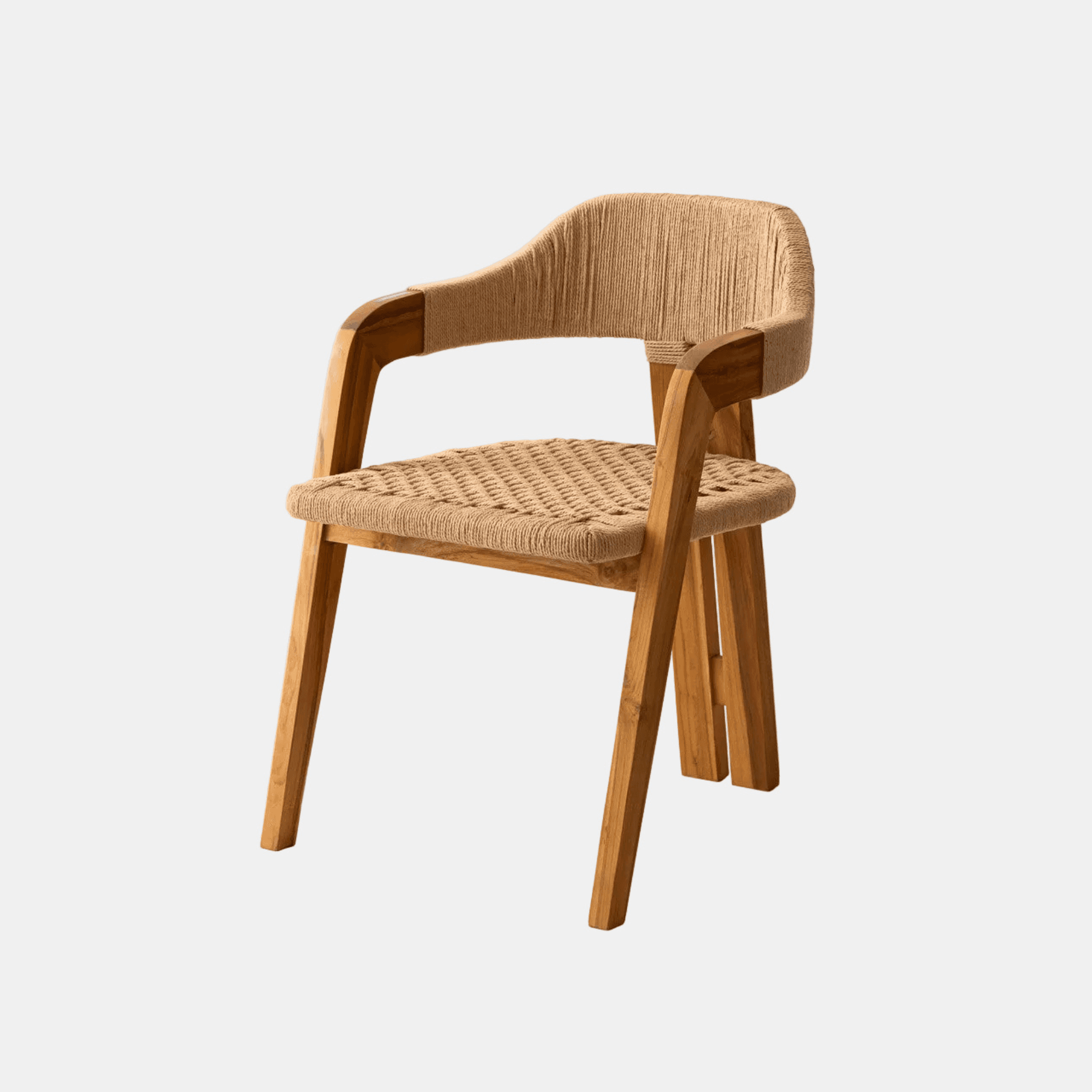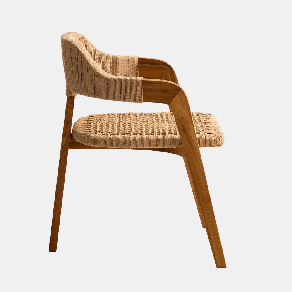 La chaise Trépied - Naturelle compose une assise de salle à manger au dessin singulier. Sa structure à trois points en teck massif de classe A s'accompagne d'un tressage en corde naturelle, réalisé à la main, pour une ligne épurée et un caractère artisanal affirmé.