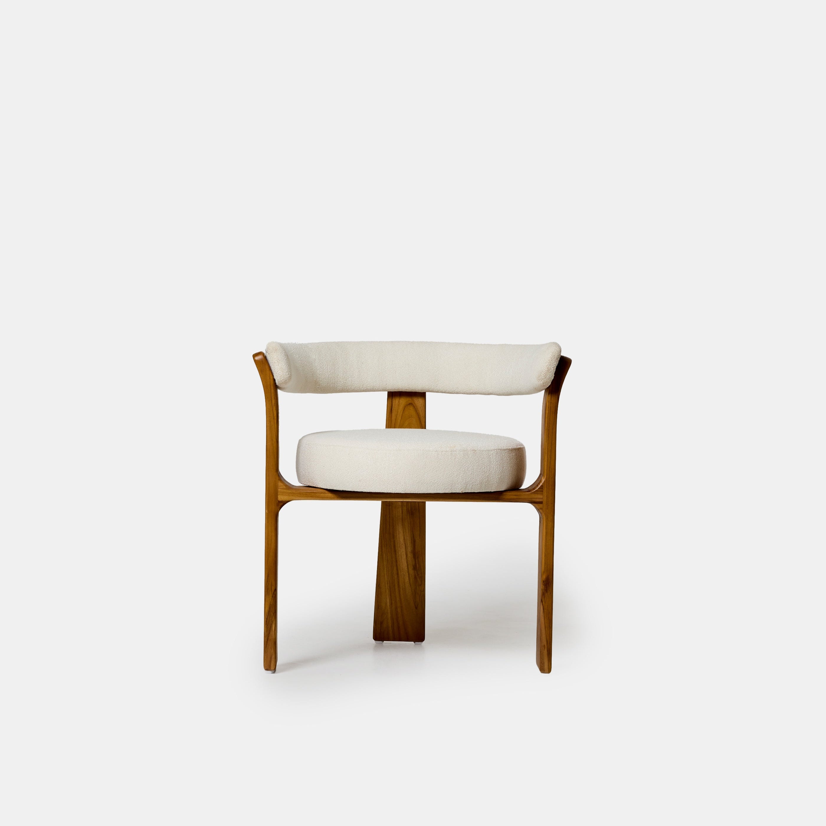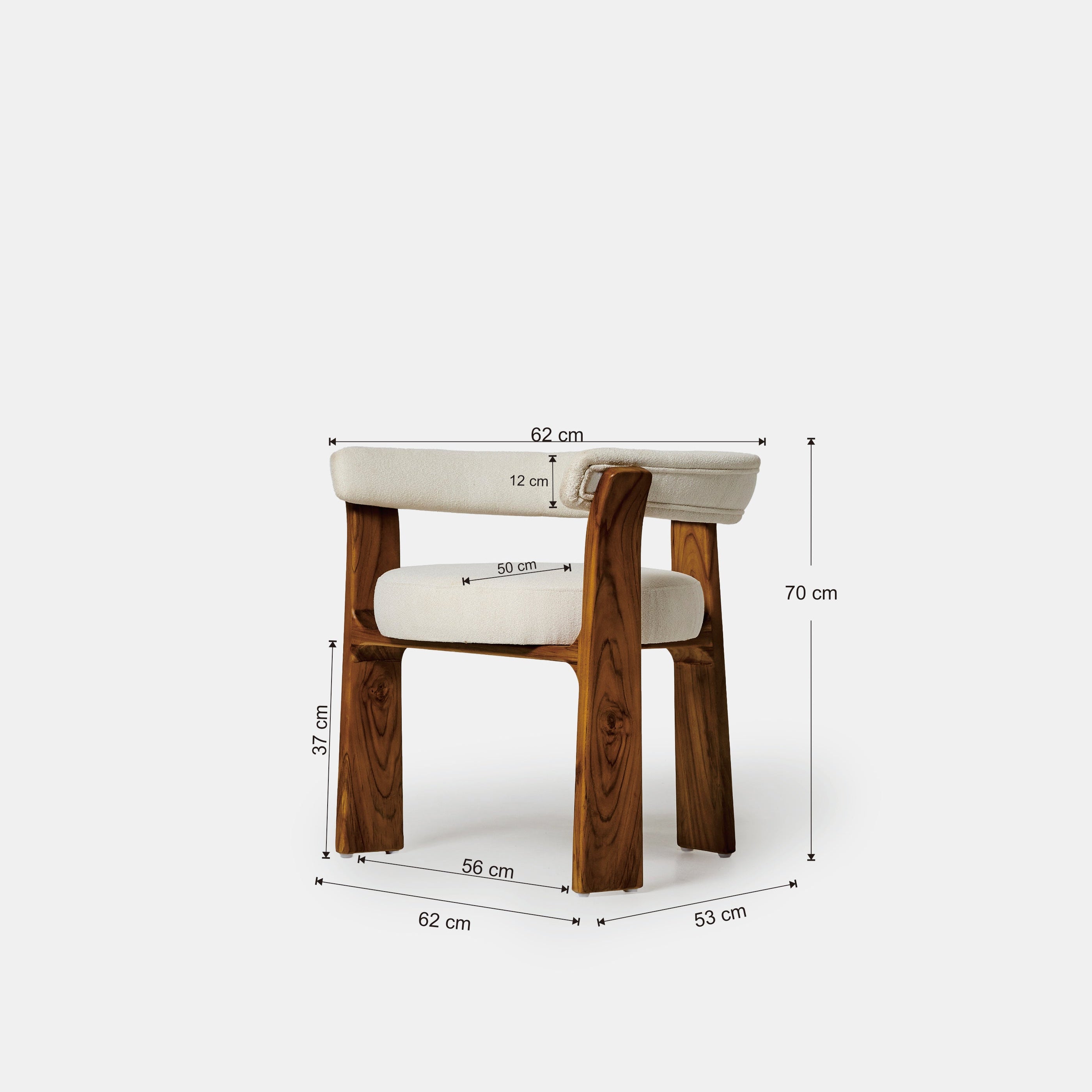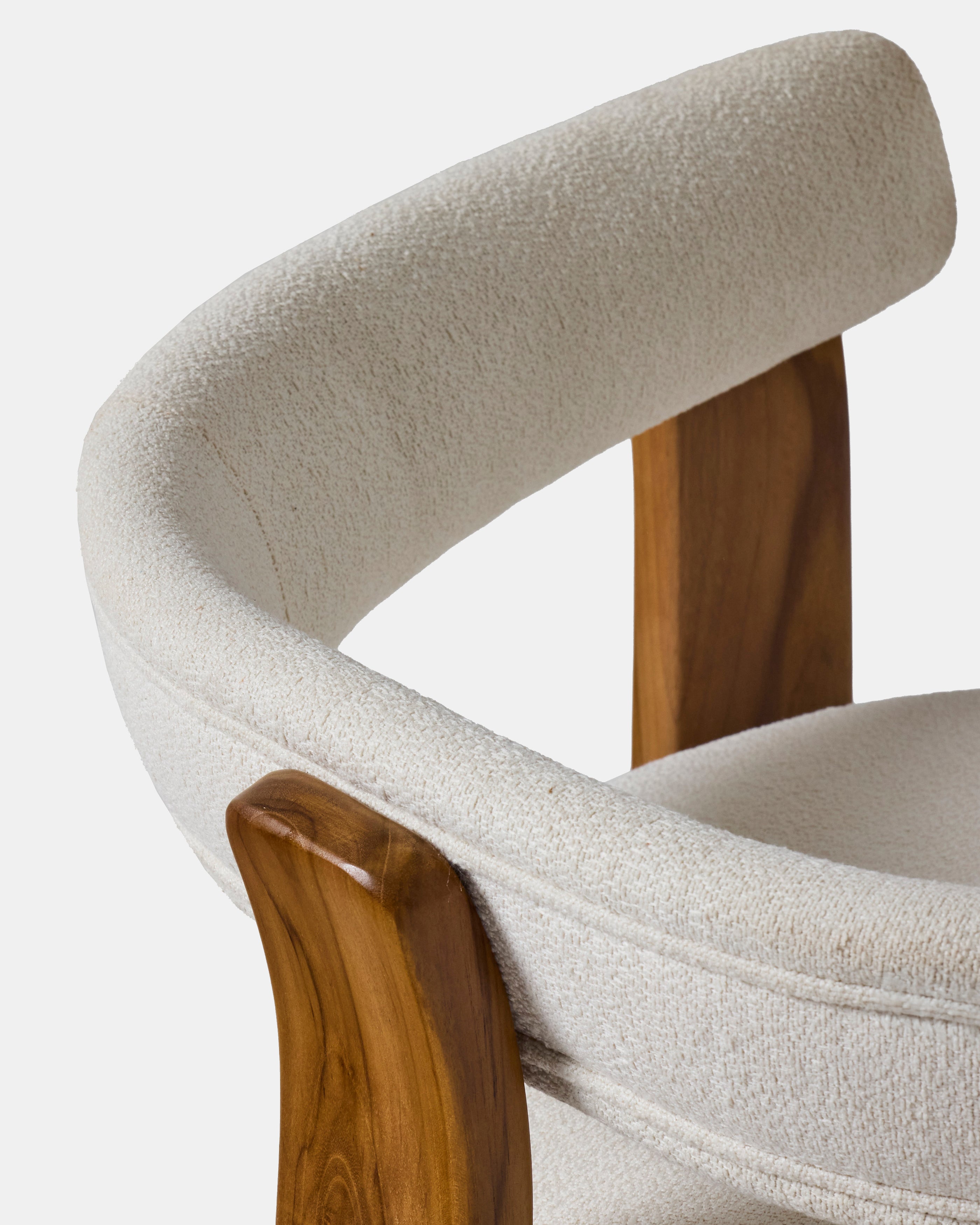 La chaise Saya blanche associe un tissu lumineux à la texture douce et épaisse avec la noblesse du bois de teck massif. Le toucher est soyeux mais structuré, offrant une sensation de confort immédiat, pendant que la chaleur du bois équilibre la clarté du textile. L’assise généreusement rembourrée soutient le corps avec naturel et stabilité, parfaite pour accompagner les moments autour de la table sans jamais fatiguer. Une chaise pensée pour durer, où chaque matière se ressent autant qu’elle se regarde.