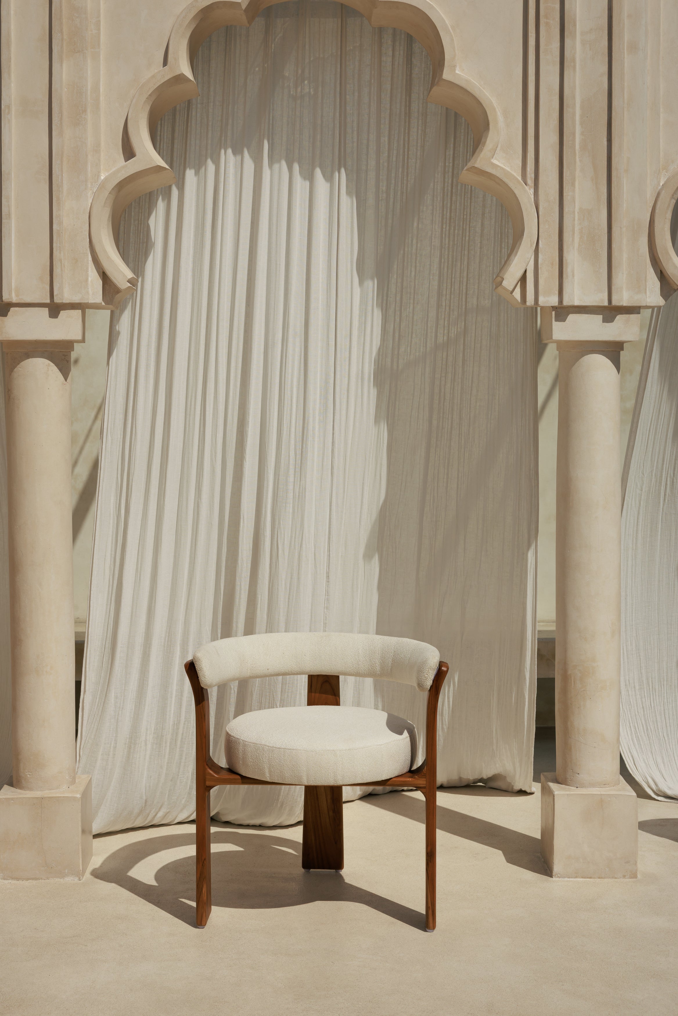 La chaise Saya blanche révèle un bois aux veines profondes et une surface doucement polie par la main. Une matière vivante qui capte la lumière et la renvoie avec une chaleur subtile. Son textile clair enveloppe l’assise et le dossier d’une douceur feutrée presque minérale, créant un contraste délicat entre densité et légèreté. La chaise devient alors un point d’ancrage dans un intérieur, apportant une sensation de calme, de confort et de sérénité naturelle, comme un lieu où l’on aime s’attarder sans y penser.