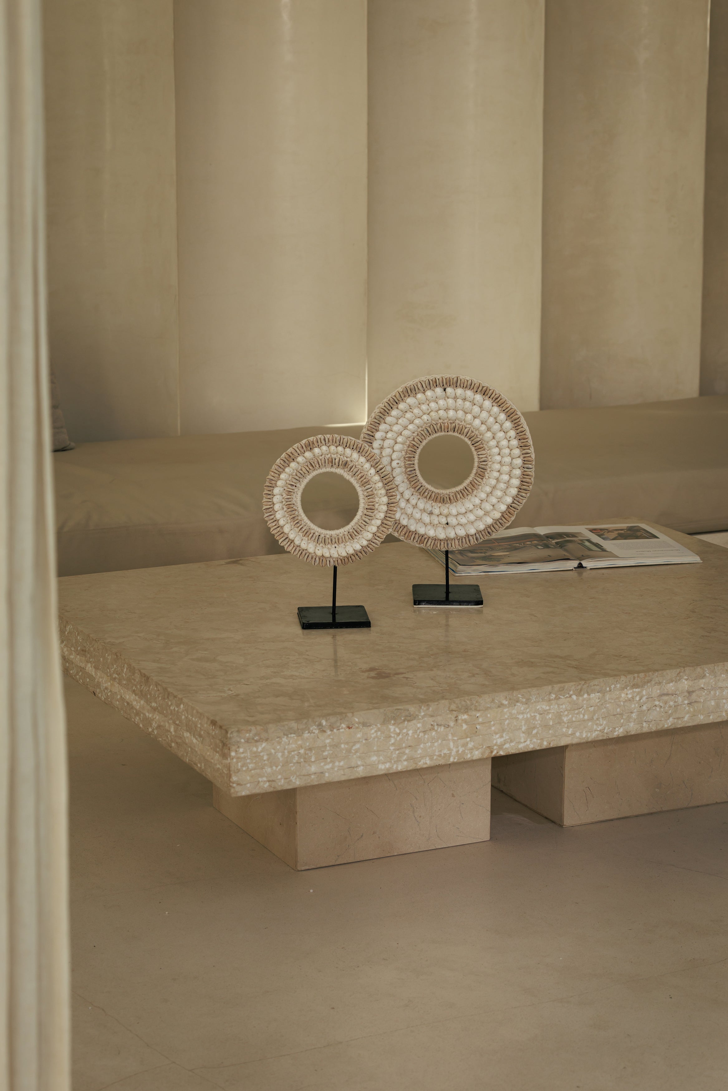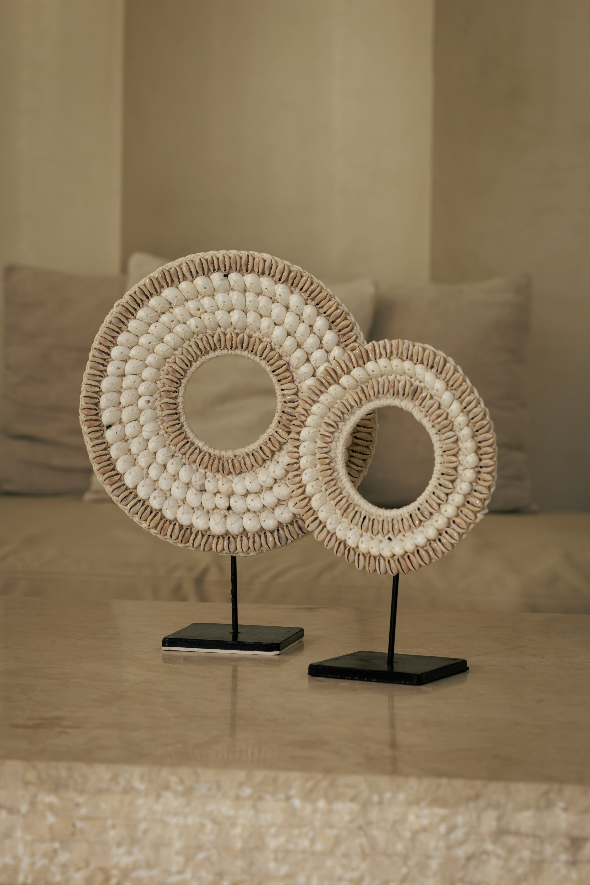Le Collier Papou Kerang évoque ces objets rapportés d’ailleurs, chargés de sens et de beauté silencieuse. Inspiré des parures traditionnelles papoues, il célèbre l’équilibre entre la matière brute et le geste minutieux. Les coquillages naturels, patiemment assemblés, dessinent un cercle presque rituel où la lumière vient se poser, révélant des nuances ivoire, sable et nacre. Présenté sur son socle en métal noir, il devient une sculpture décorative à part entière, un objet qui structure l’espace sans jamais l’alourdir. Dans un salon, une entrée ou une chambre, il insuffle une présence calme et sophistiquée, un fragment d’ailleurs qui dialogue avec les intérieurs contemporains, bohèmes ou wabi-sabi.