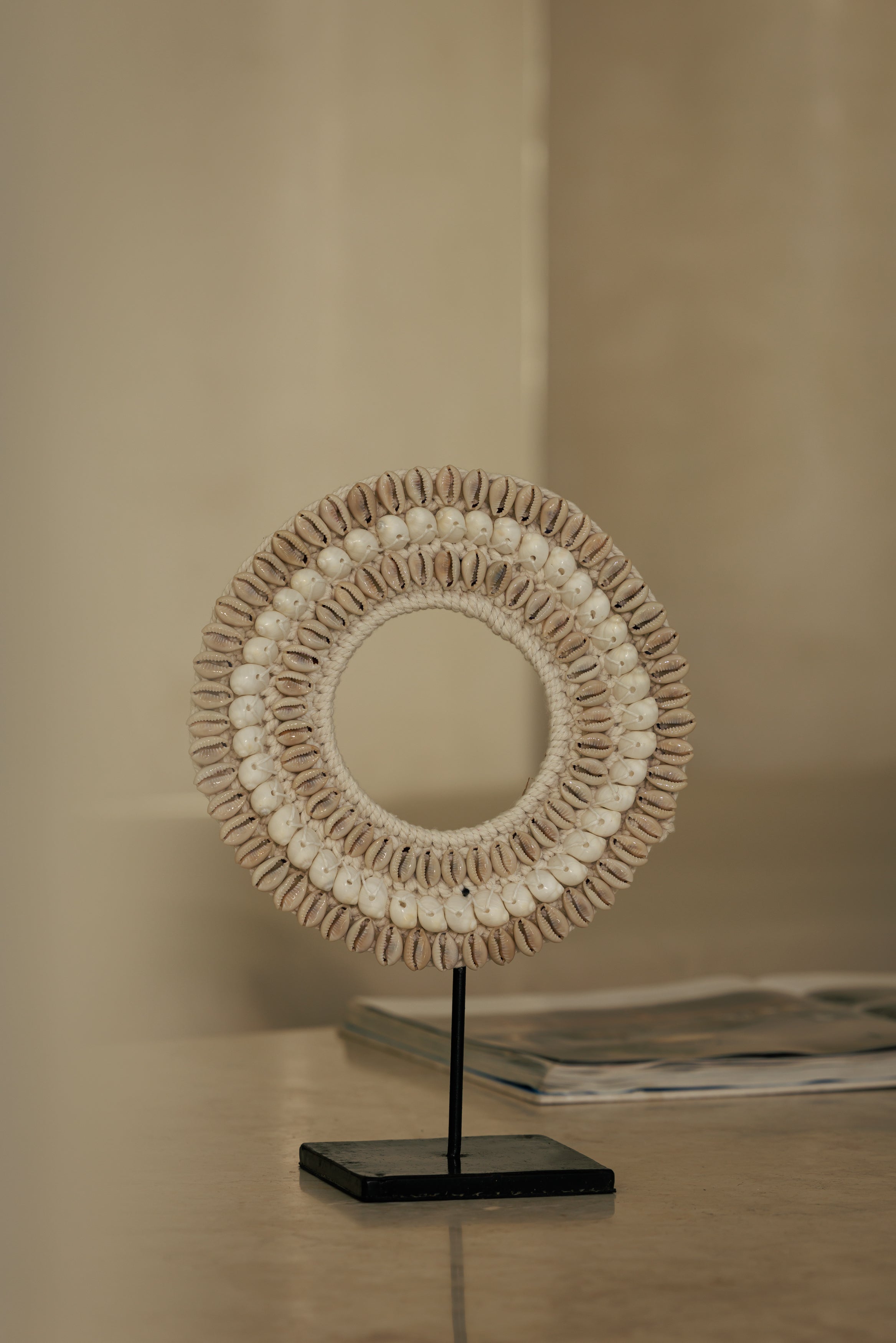 Collier Papou décoratif en coquillages naturels sur socle en métal, inspiré des parures traditionnelles indonésiennes, idéal pour apporter une touche ethnique chic et artisanale à un intérieur bohème, contemporain ou wabi-sabi. Objet décoratif sculptural parfait pour une console, un buffet ou une étagère, créant un accent de voyage élégant et authentique.
