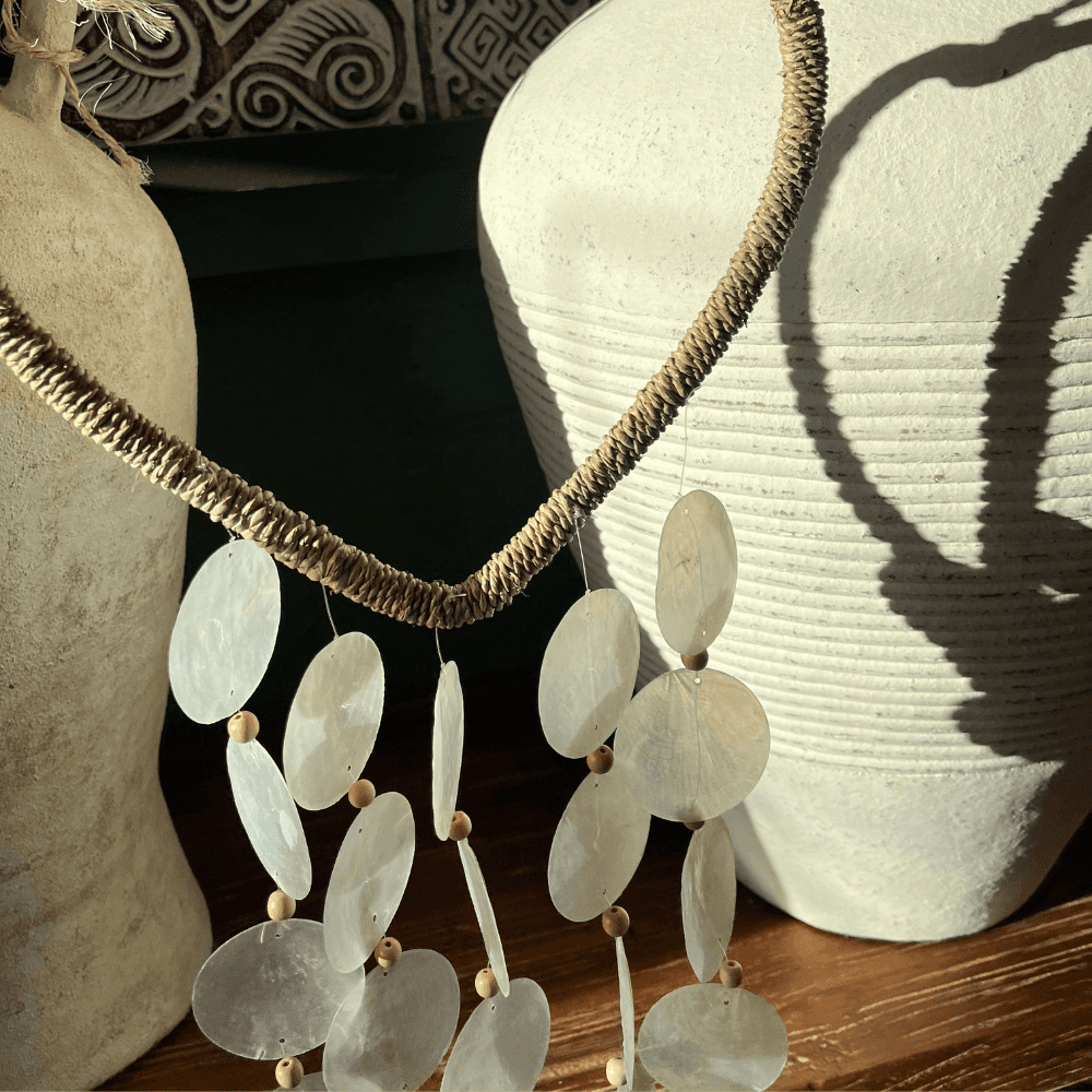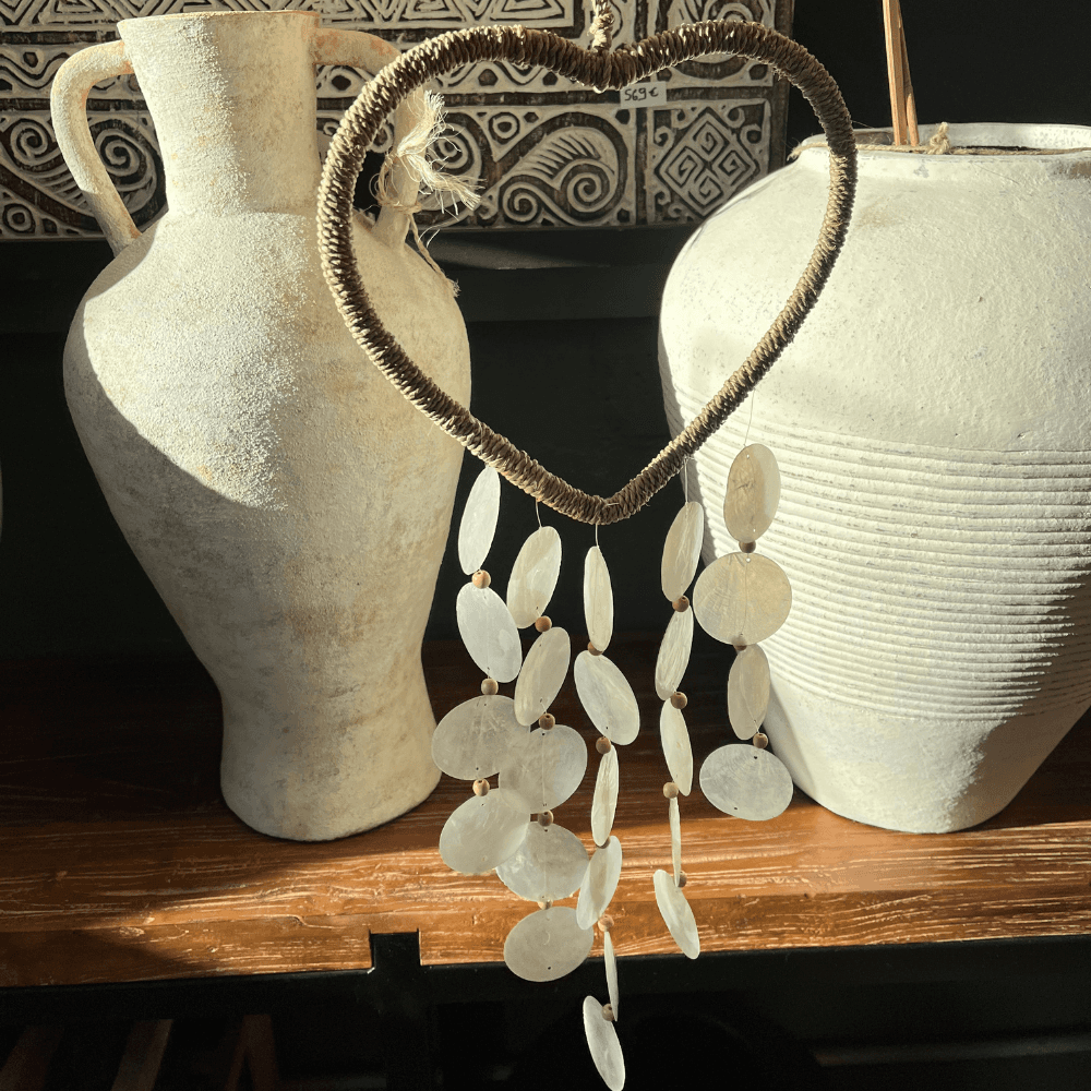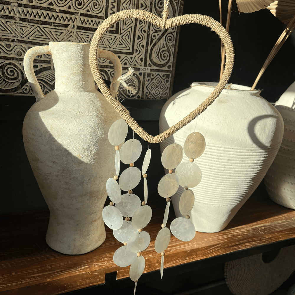 Accrochée à un mur clair, posée contre une composition de paniers ou glissée dans un décor plus épuré, cette décoration coeur apporte un accent artisanal immédiatement lisible. Le raphia dessine le contour avec une texture végétale souple, tandis que les coquillages de Capiz ajoutent un contraste délicat et un éclat discret. L'ensemble joue sur la rencontre entre fibres naturelles et matière nacrée, dans un registre décoratif à la fois simple et travaillé. Cet objet n'a pas de fonction utilitaire, il est pensé pour composer une ambiance, ponctuer un pan de mur ou compléter une accumulation d'objets choisis. Sa forme de coeur lui donne un dessin identifiable sans tomber dans l'effet démonstratif, ce qui permet de l'intégrer aussi bien dans une chambre que dans une entrée, un salon ou une maison de vacances. On l'imagine seul pour souligner un détail, ou associé à d'autres pièces murales pour construire un ensemble plus dense. Le travail des matières lui donne un caractère artisanal qui s'accorde naturellement avec des intérieurs tournés vers les fibres, le bois et les finitions brutes.