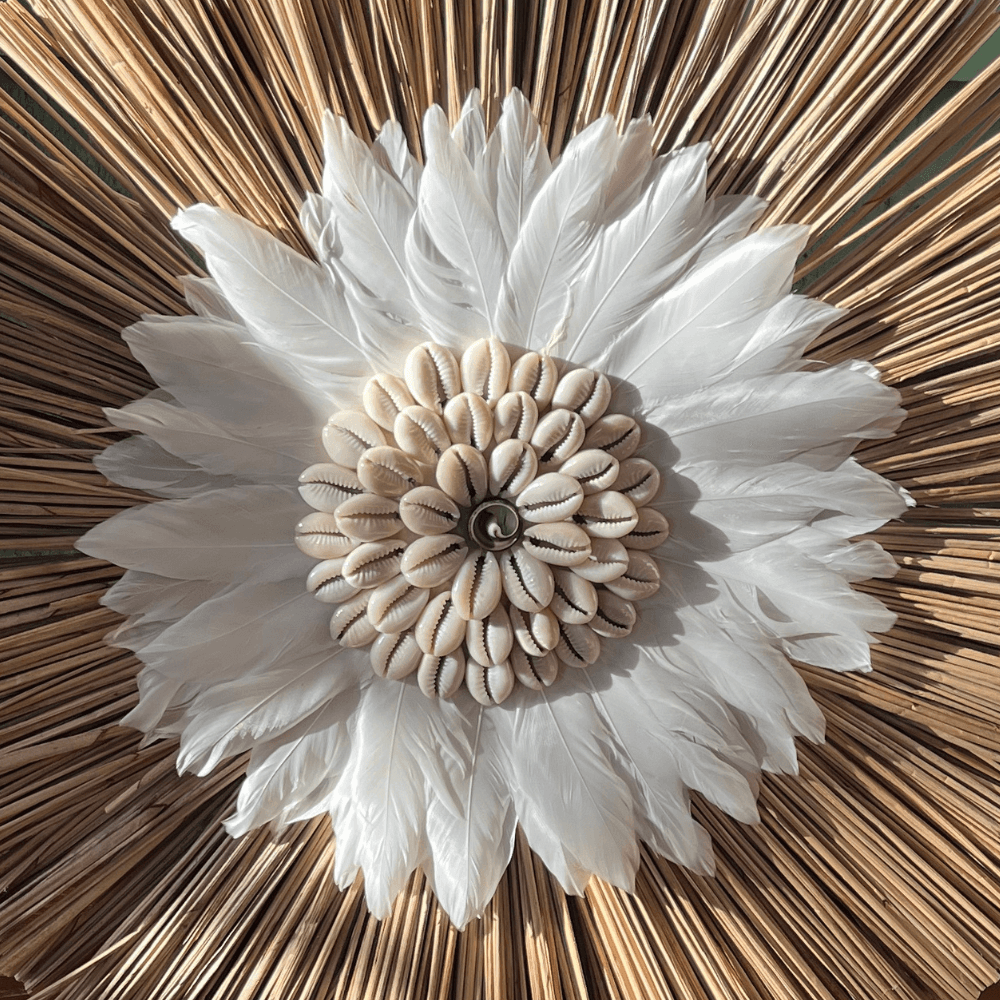 Décoration murale Algian : une touche bohème en herbes de mer, plumes et coquillages. Artisanat unique pour votre intérieur