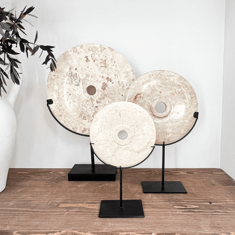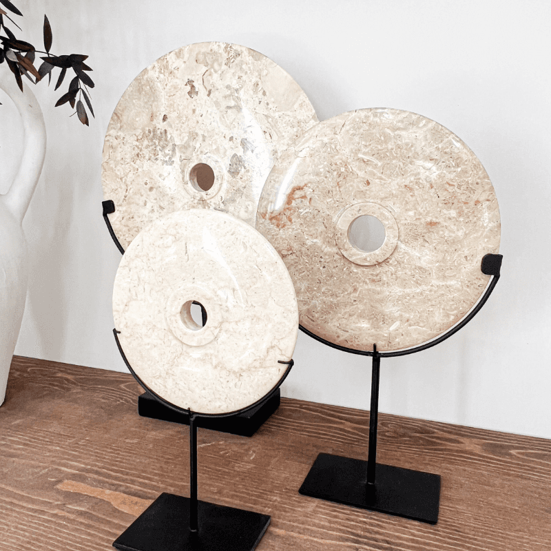 Les Disques en marbre blanc sur socle, objets déco en marbre, composent un accent purement décoratif au dessin graphique. Posés sur une console, une bibliothèque ou un buffet, ils structurent l'espace avec leur contraste de blanc et de noir.