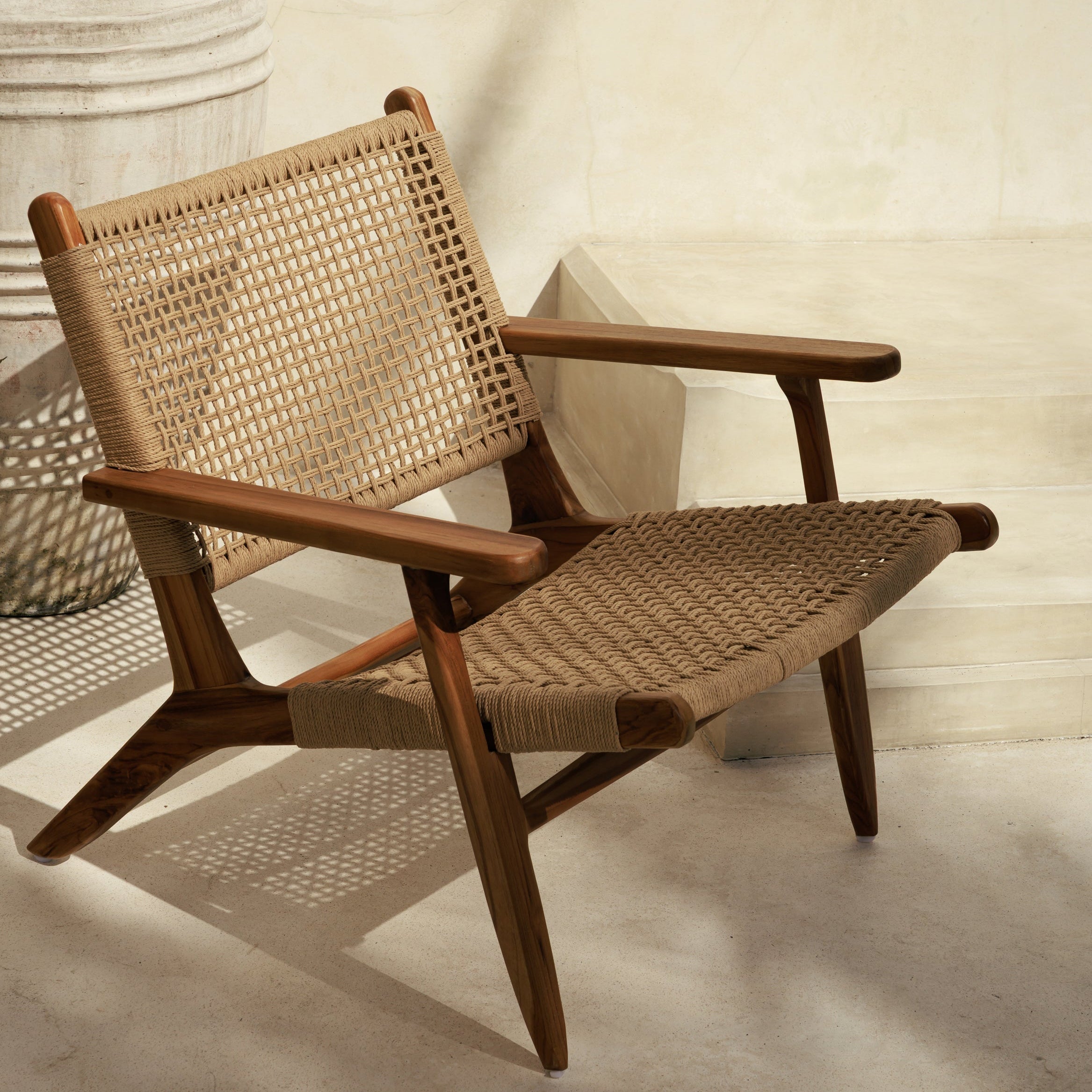 Dans un salon épuré, une chambre soignée ou une véranda, le fauteuil Tyla installe d'emblée une ligne nette et naturelle. Sa structure en teck massif, à la finition naturelle, compose une assise stable et équilibrée, tandis que le tressage en corde apporte un dessin ajouré qui allège l'ensemble. Le contraste entre le bois plein et la trame tendue donne au fauteuil un profil à la fois graphique et accueillant, sans effet démonstratif. Cette association de matières souligne un esprit bohème chic tout en restant parfaitement à sa place dans un décor plus contemporain ou wabi sabi. Tyla fonctionne aussi bien comme fauteuil de détente que comme assise d'appoint dans un espace de lecture, près d'une table basse ou dans un angle de chambre. Le dossier et l'assise enveloppants participent à son confort visuel, pendant que le teck affirme une base solide et durable. Pièce artisanale, il apporte un accent décoratif juste, entre simplicité des lignes, texture du tressage et équilibre des proportions.