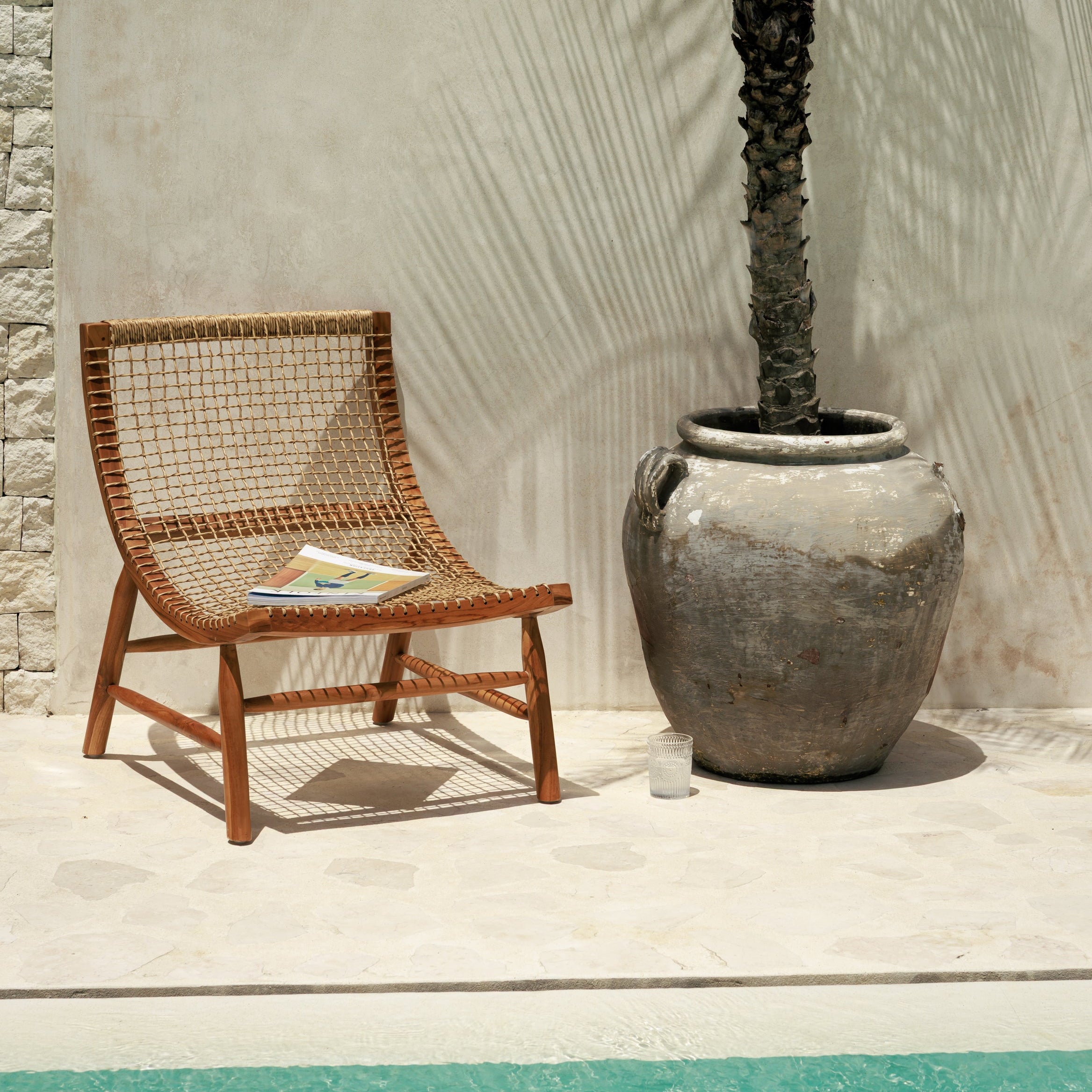 Le fauteuil Malas se distingue par son dessin ajouré en corde et sa structure en teck naturel, dans une finition sobre qui met en valeur le travail artisanal. Il trouve facilement sa place dans un salon, une chambre ou un coin lecture à l'esprit bohème chic et contemporain.