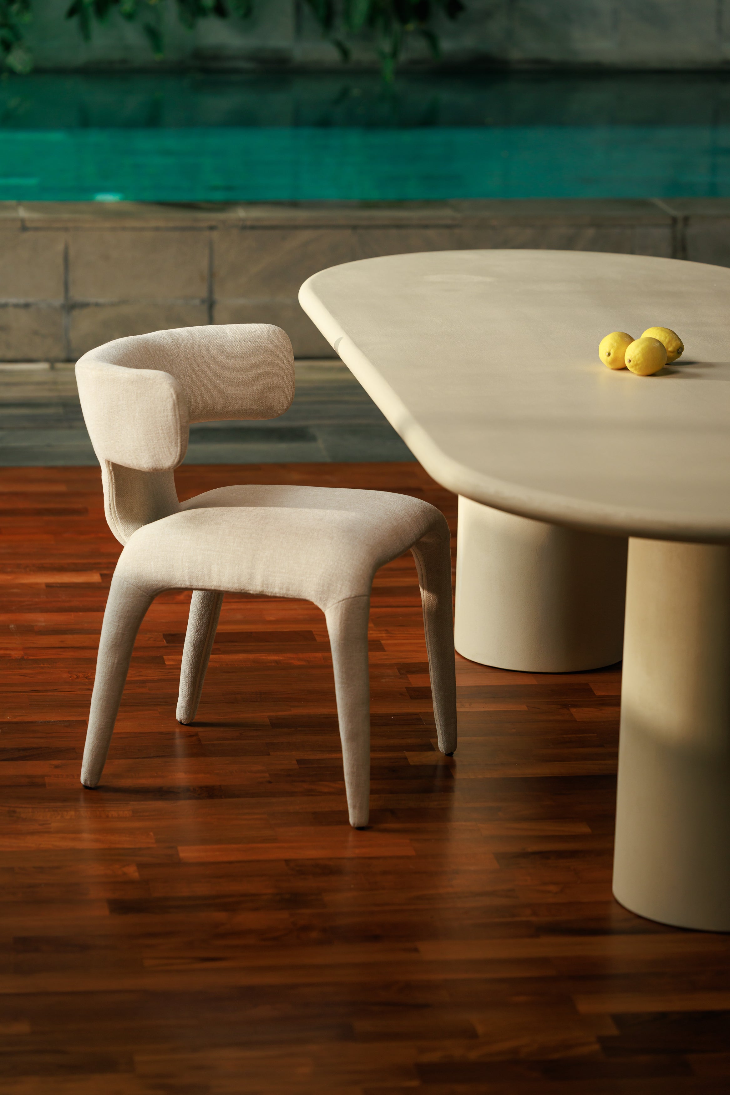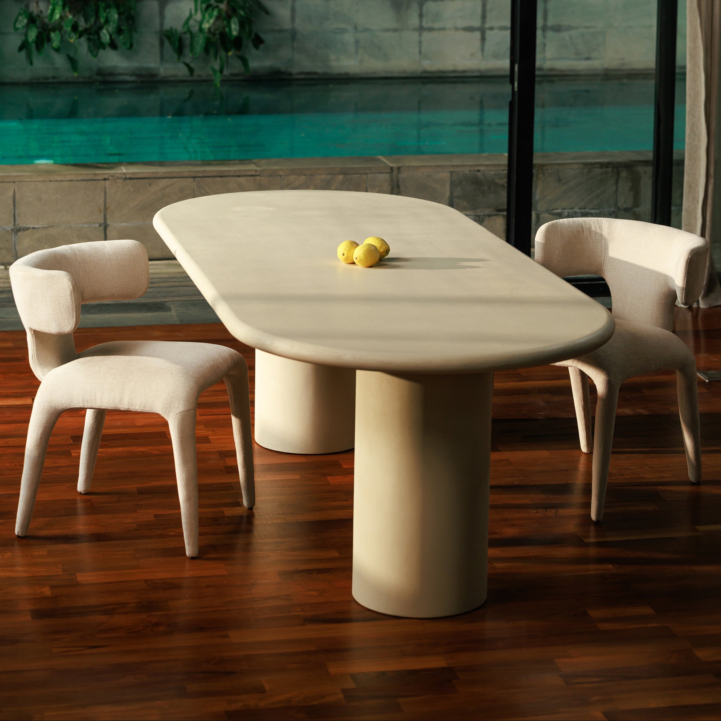 La table Fidji en béton plein affirme une esthétique pure et radicale, où la matière devient l’essence même du design. Entièrement réalisée en béton, elle dessine une silhouette ovale douce portée par deux volumes cylindriques massifs, comme une architecture minimaliste posée au cœur de la pièce. La surface minérale capte la lumière avec subtilité, révélant de légères nuances et une texture mate qui évolue au fil de la journée. Fidji crée une présence forte et silencieuse, presque méditative, qui structure l’espace avec équilibre et sérénité. Dans une salle à manger contemporaine, un intérieur wabi sabi ou un lieu à l’esprit galerie, elle installe une atmosphère à la fois brute et sophistiquée, où chaque repas devient une expérience esthétique.