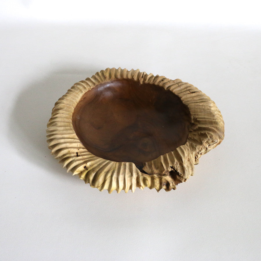 Ce grand bol saladier strié en bois de teck s’impose comme une pièce de caractère, façonnée à la main et marquée par un travail artisanal visible dans chaque relief. Son large diamètre offre une présence généreuse sur la table, tandis que les stries sculptées dans la matière dessinent un rythme organique, presque primitif, qui capte la lumière et révèle toute la richesse du teck. Le bois, aux nuances chaudes et naturelles, apporte une sensation de profondeur et d’authenticité, transformant ce bol en un véritable objet décoratif autant qu’un élément fonctionnel. Utilisé comme saladier, centre de table, corbeille à fruits ou simple pièce d’accent, il s’intègre naturellement dans des intérieurs rustiques, bohèmes ou contemporains, en ajoutant cette touche chaleureuse et vivante propre aux objets façonnés lentement, avec intention. Chaque bol est unique, et ses légères variations racontent la main de l’artisan et la beauté imparfaite de la matière.