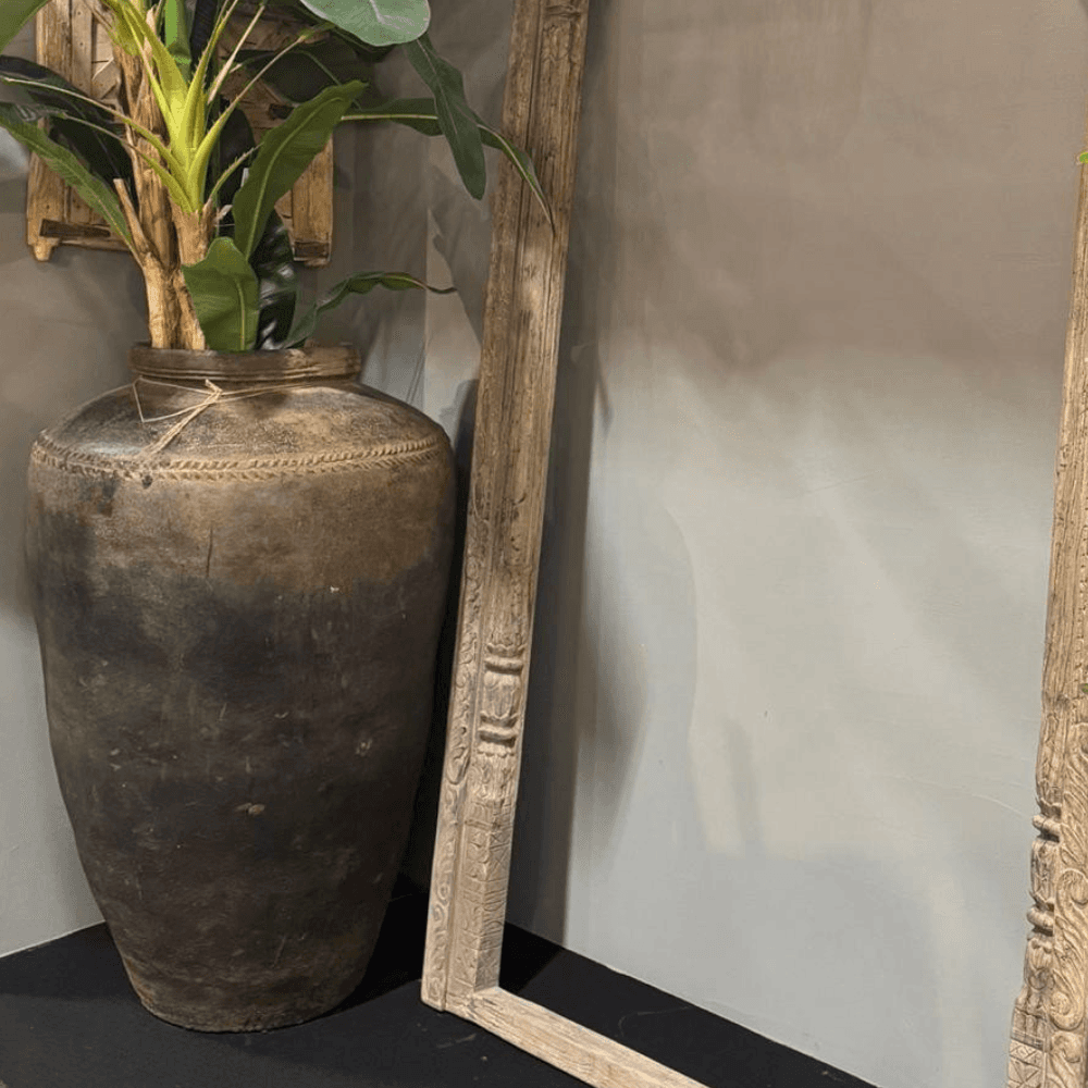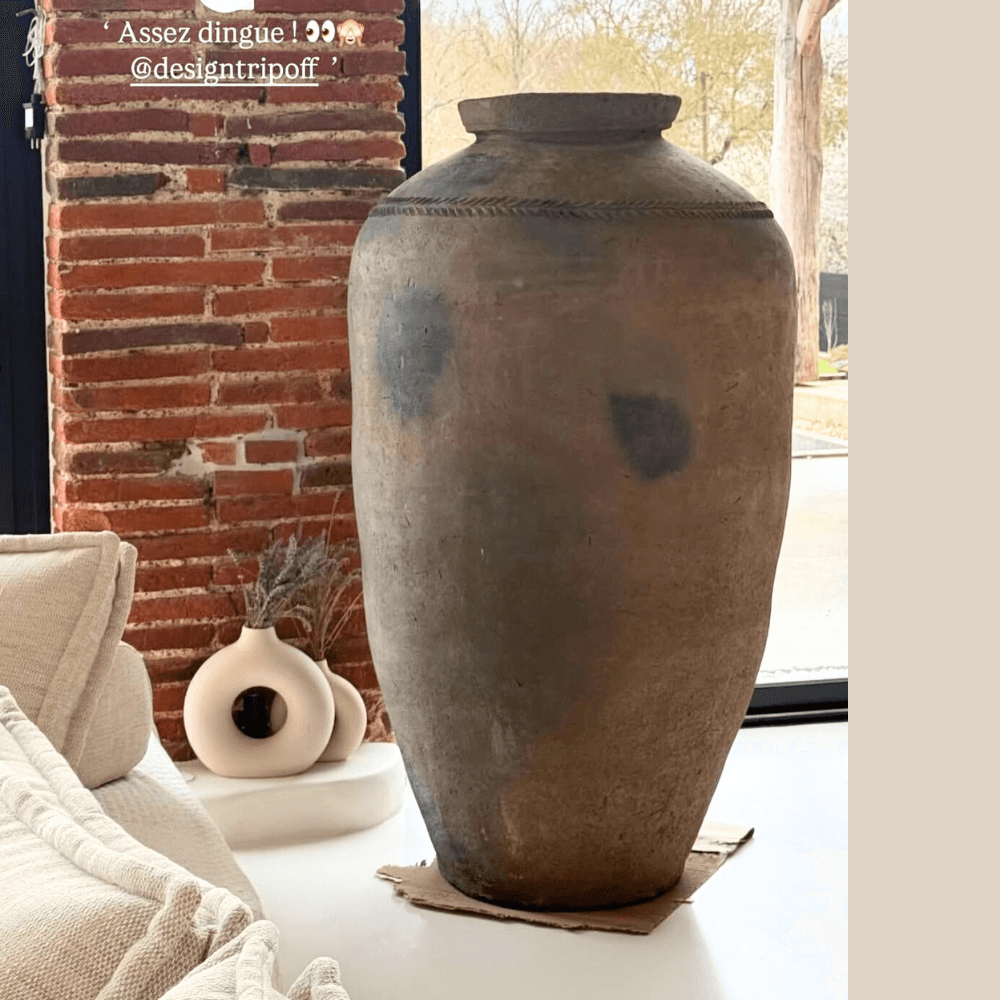 Placée dans une entrée, au bout d’un couloir ou près d’une baie vitrée, cette grande jarre indienne XXL structure l’espace d’un seul geste. La terre cuite lui donne une assise visuelle forte, tandis que la finition vieillie, patinée à la main, accentue son aspect ancien et artisanal. Son dessin simple, ample et brut s’intègre naturellement dans un intérieur bohème, wabi-sabi ou plus épuré, où elle agit comme une pièce décorative à part entière. Utilisée seule, elle capte le regard par son volume et par la profondeur de sa surface mate. Installée au sol, elle complète aussi bien un salon aux matières naturelles qu’une entrée au décor plus minéral. L’origine indienne et le travail de patine renforcent son caractère authentique, sans effet démonstratif. Cette jarre trouve également sa place dans un extérieur couvert, sur une terrasse abritée ou sous une véranda, où son allure patinée dialogue avec le bois, la pierre ou les fibres tressées. C’est une pièce forte, choisie pour son impact décoratif et pour la qualité visuelle de sa matière.