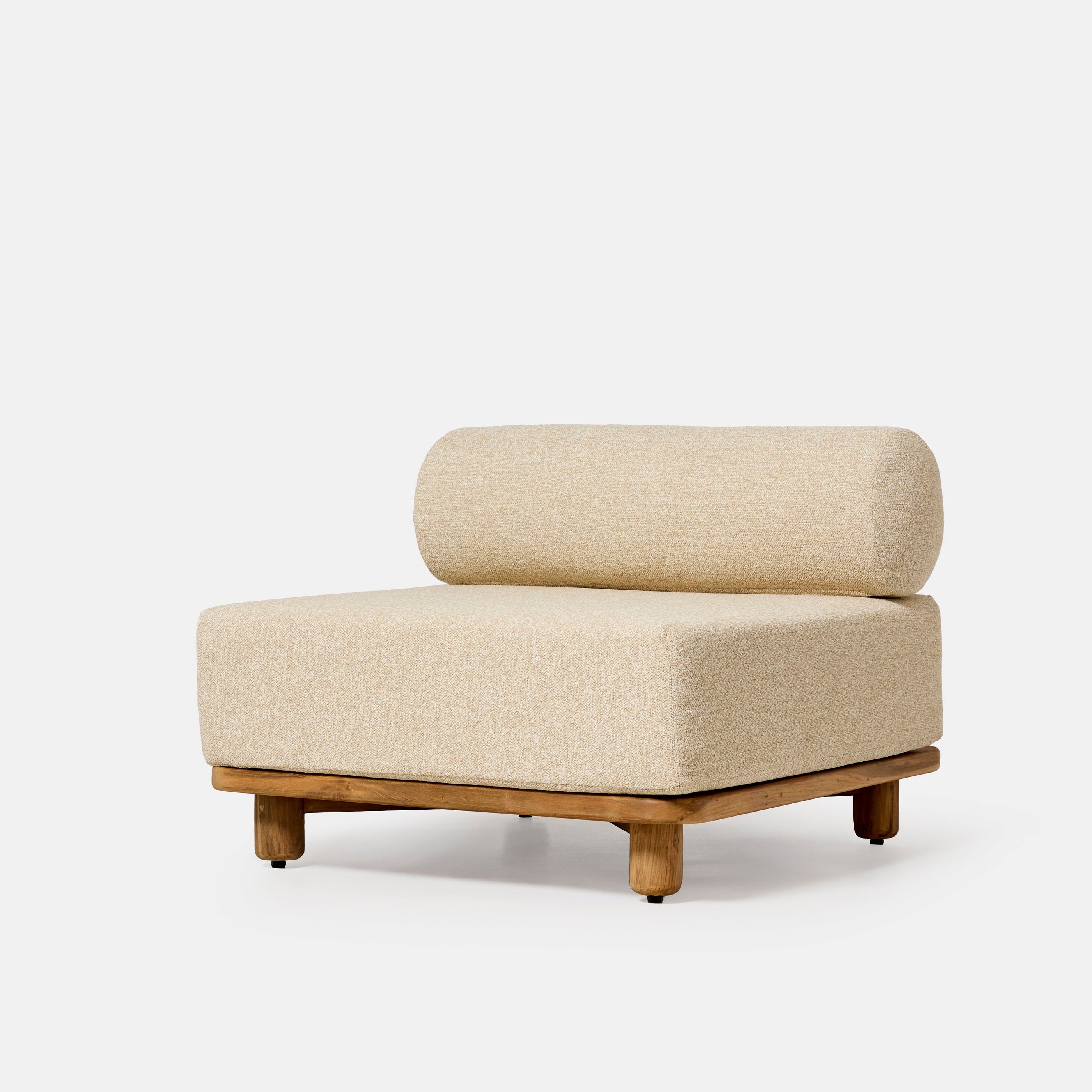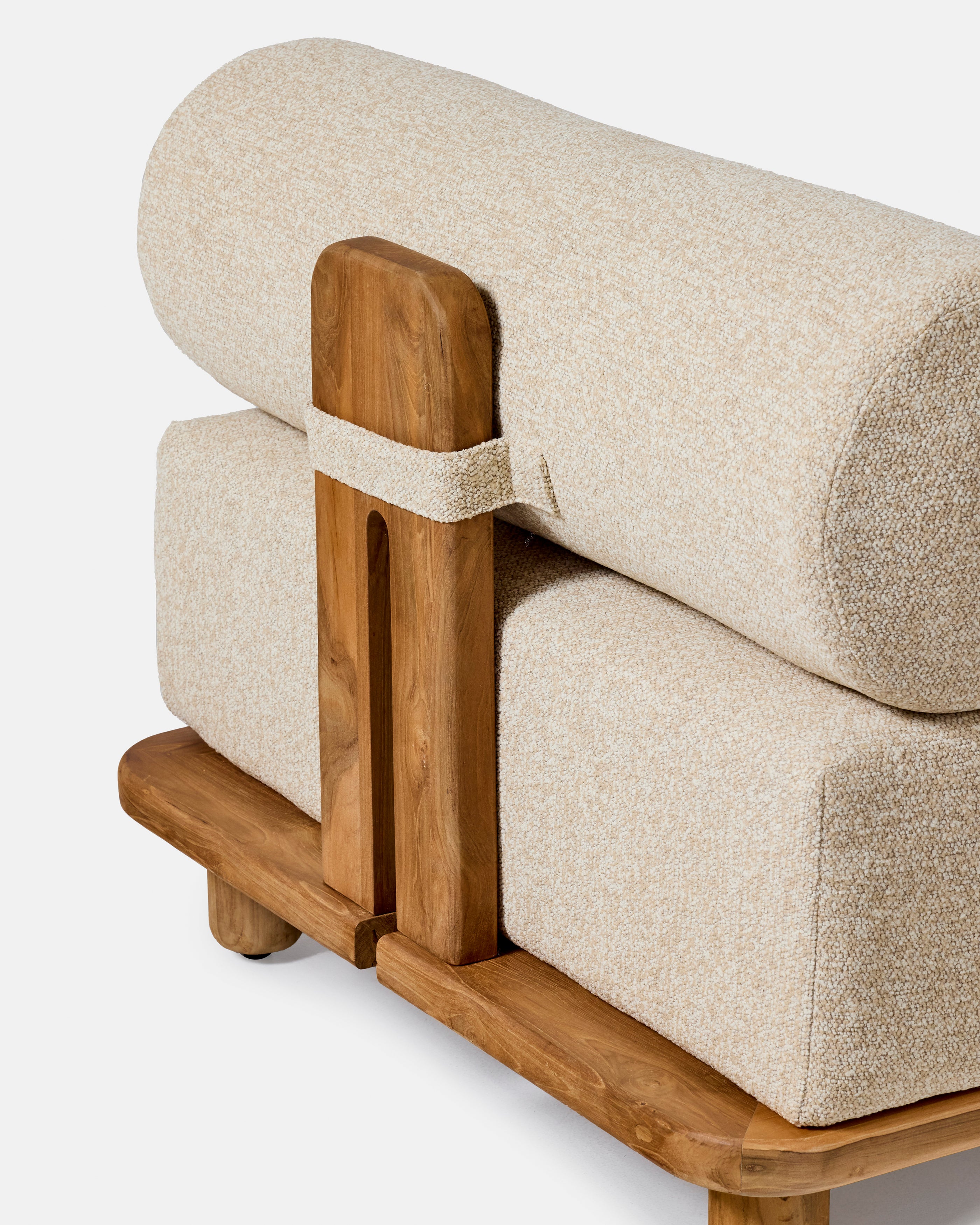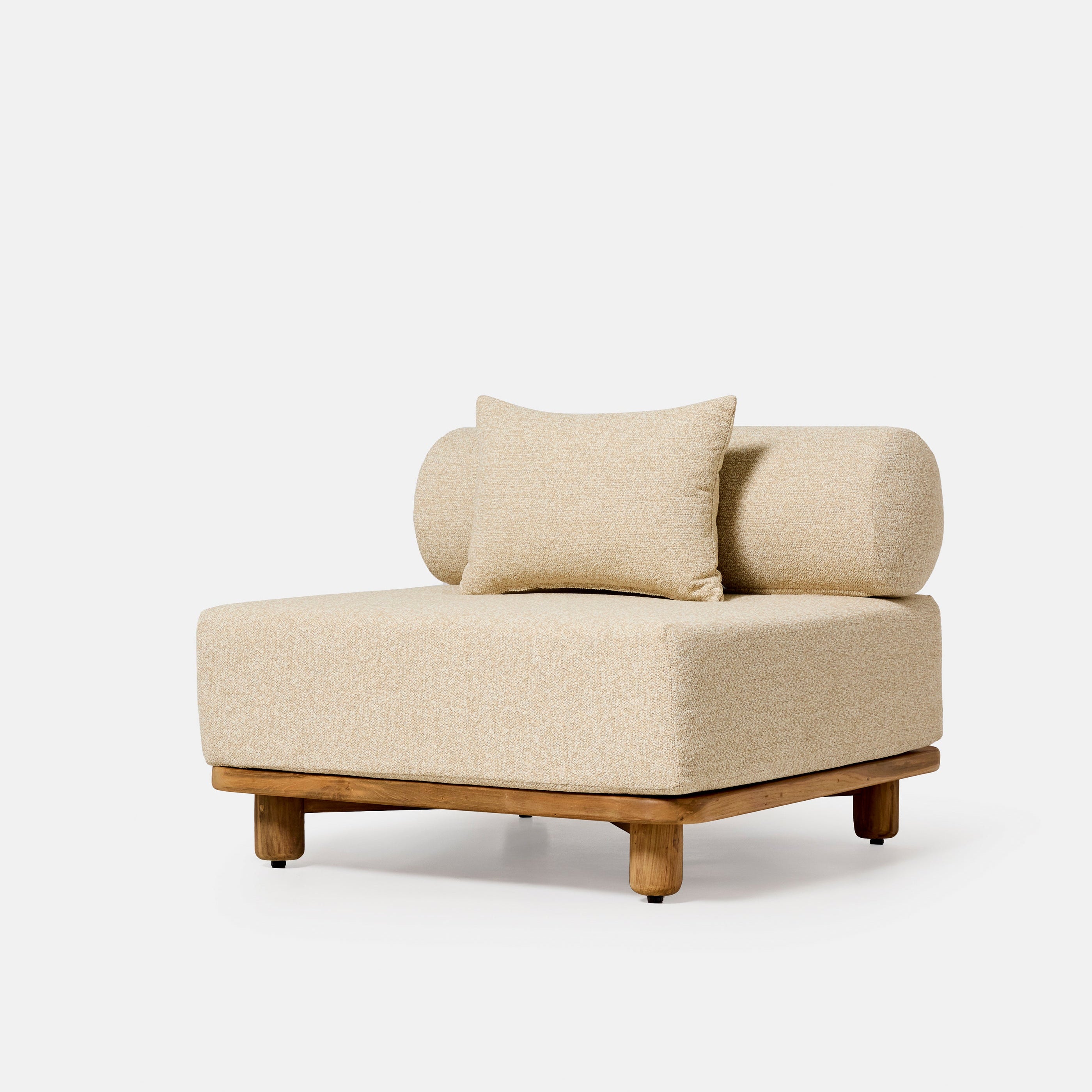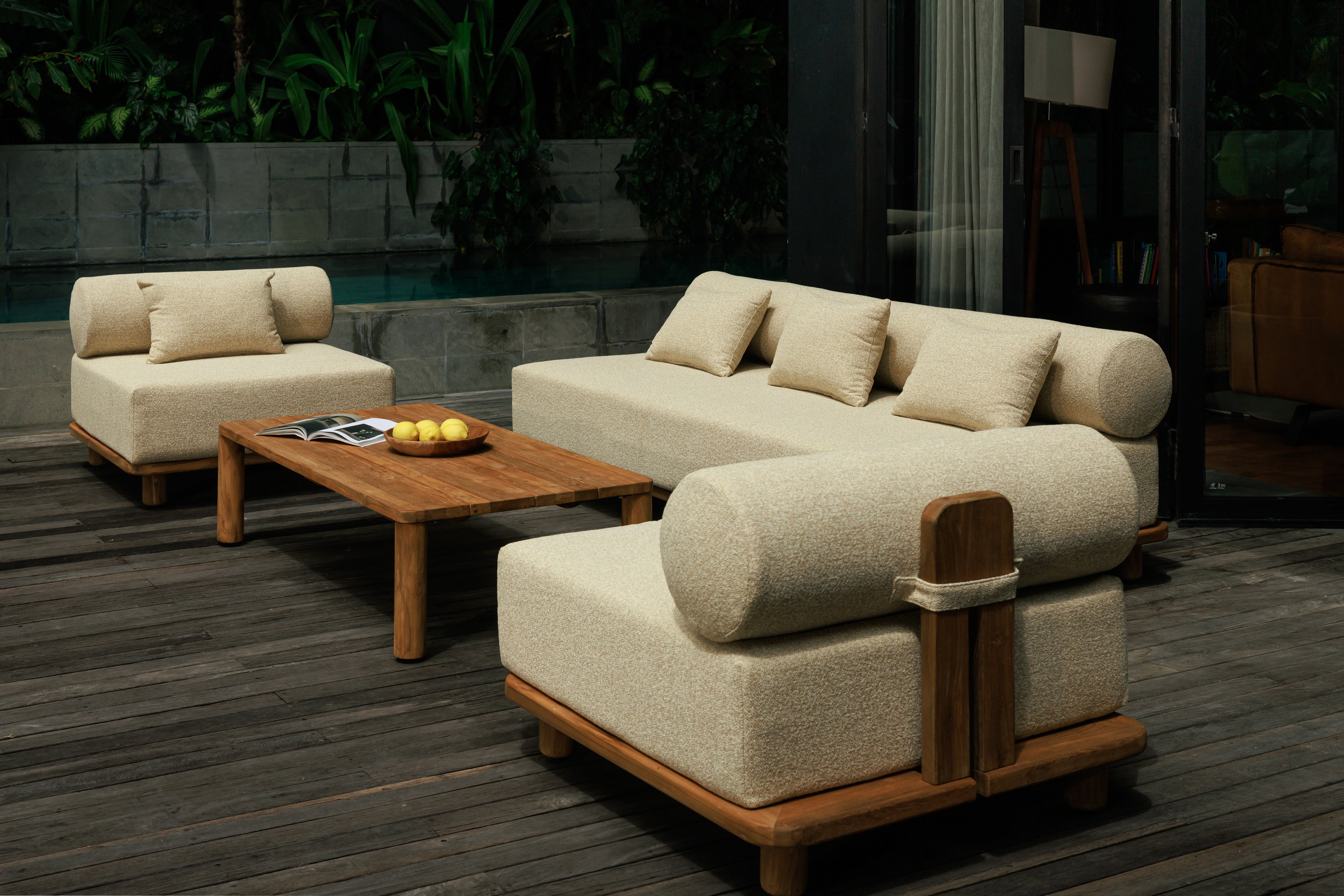 Fauteuil extérieur Jalo en teck massif recyclé avec coussins déperlants et mousse à séchage rapide, conçu pour terrasse, jardin ou bord de piscine.