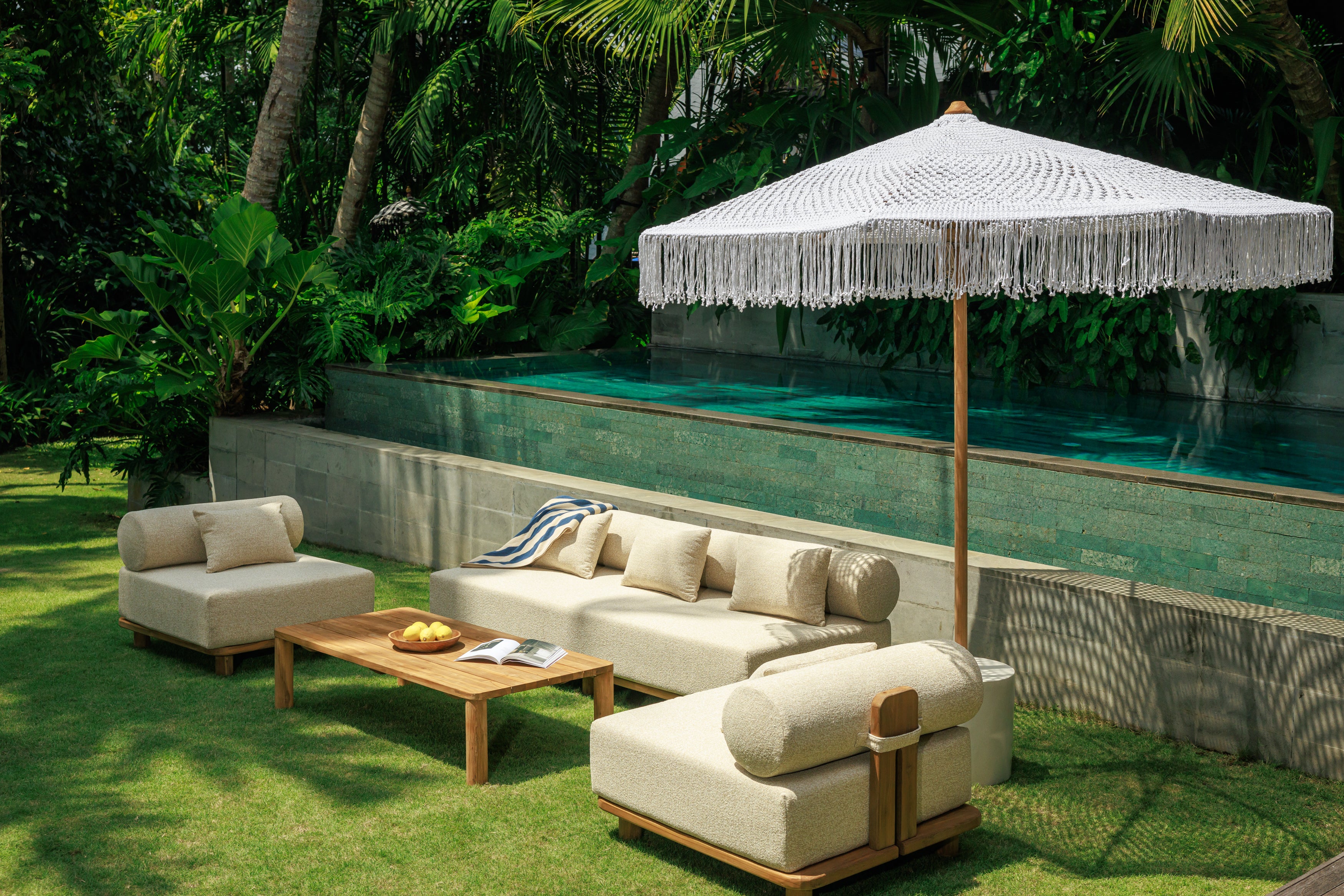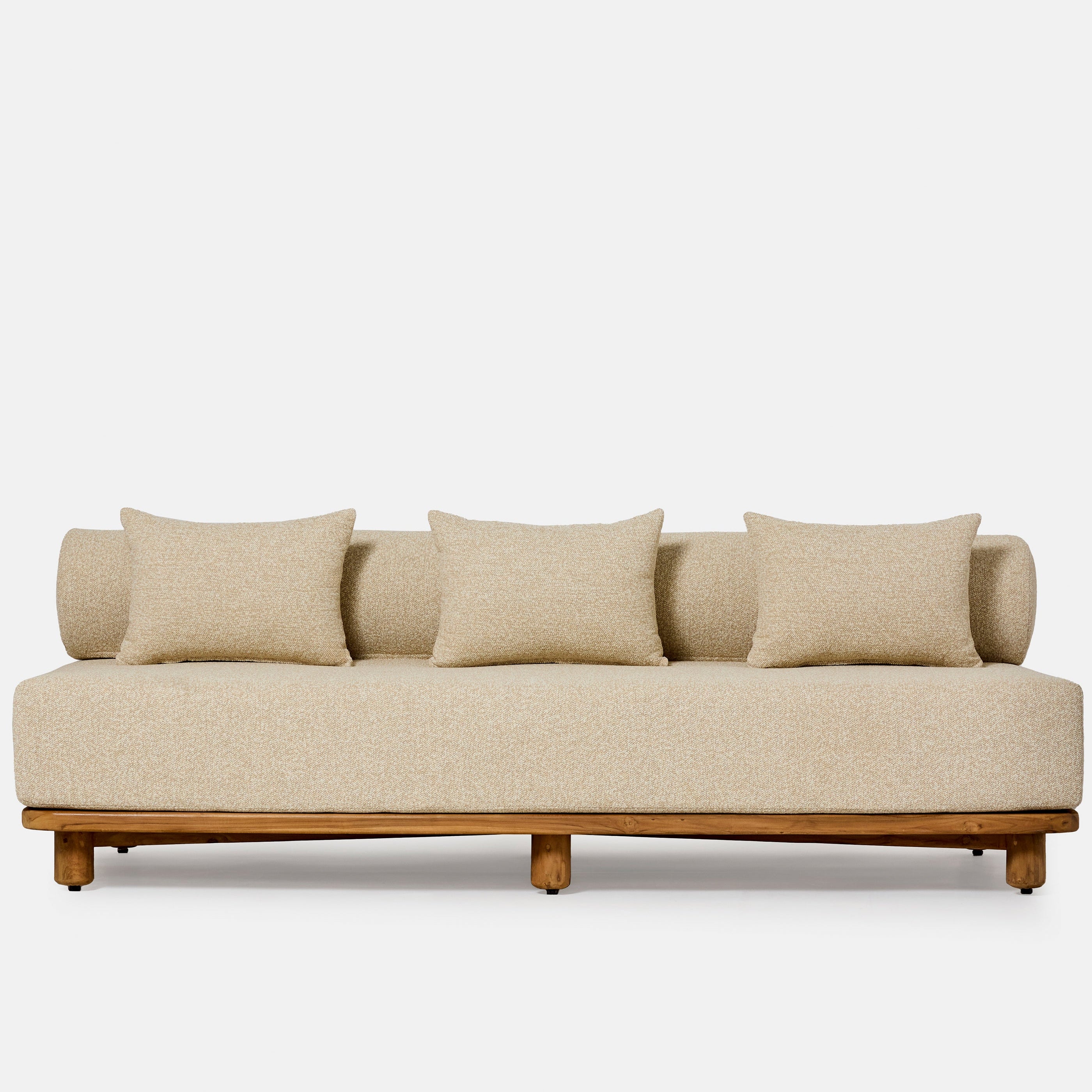 Le canapé extérieur Jalo 3 places incarne une vision chaleureuse et durable du mobilier outdoor. Conçu en teck massif recyclé, il révèle les nuances profondes d’un bois patiné par le temps, ses veines vivantes et ses irrégularités naturelles qui racontent une histoire avant même d’accueillir les premiers instants de détente. Sa structure basse et généreuse dessine une silhouette stable et enveloppante, pensée pour ancrer l’espace et créer un véritable lieu de vie à ciel ouvert. Les coussins épais en tissu déperlant, associés à une mousse à séchage rapide, offrent un confort moelleux adapté aux longues journées d’été et aux soirées qui s’étirent. Sous la lumière du jour, le teck capte des reflets dorés tandis que le textile clair apporte une douceur naturelle qui équilibre l’ensemble. Installé sur une terrasse, au bord d’une piscine ou dans un jardin méditerranéen, Jalo accompagne les moments de partage avec une élégance sobre, où design contemporain, artisanat et durabilité se rencontrent avec évidence.
