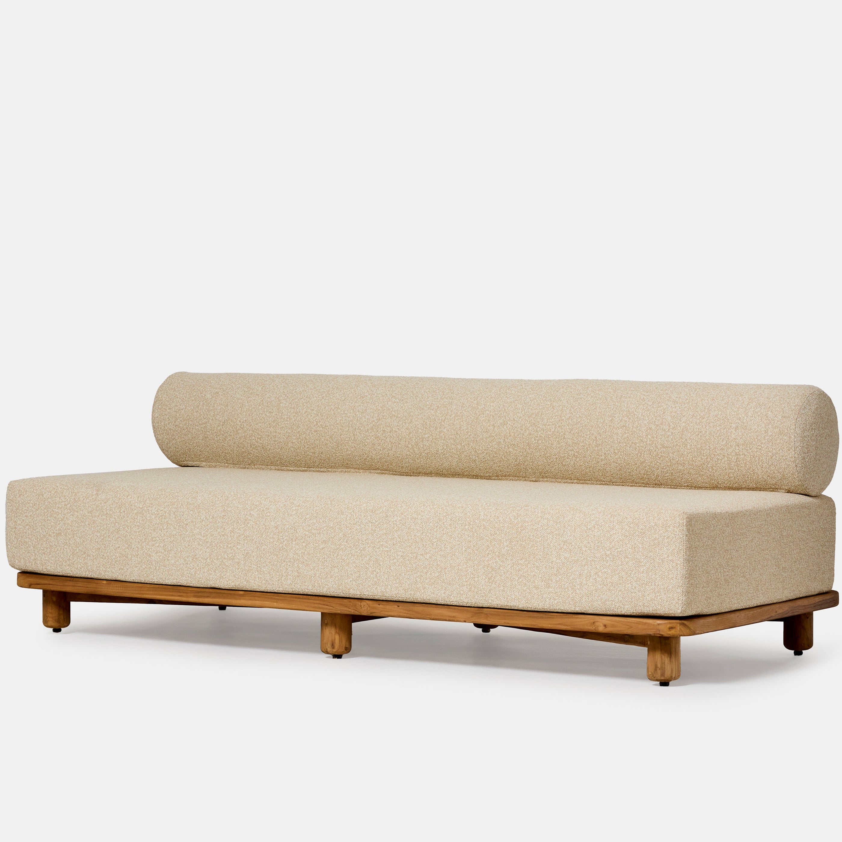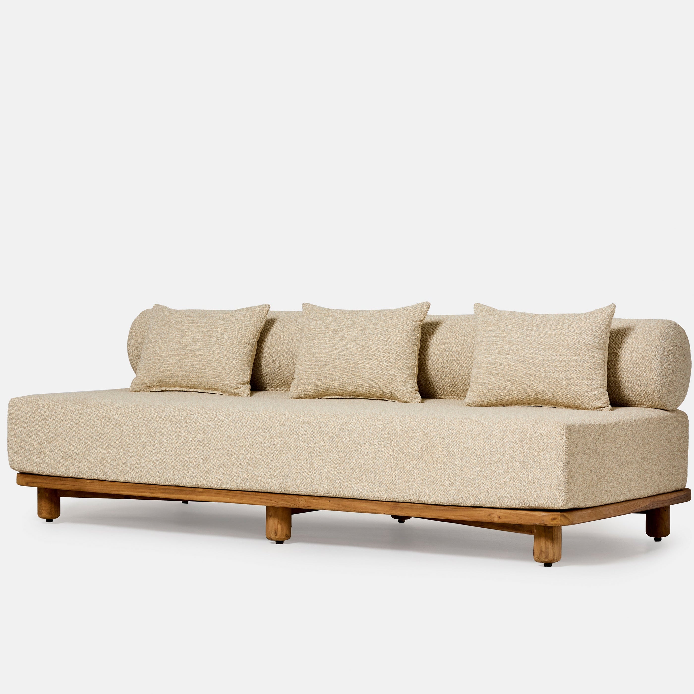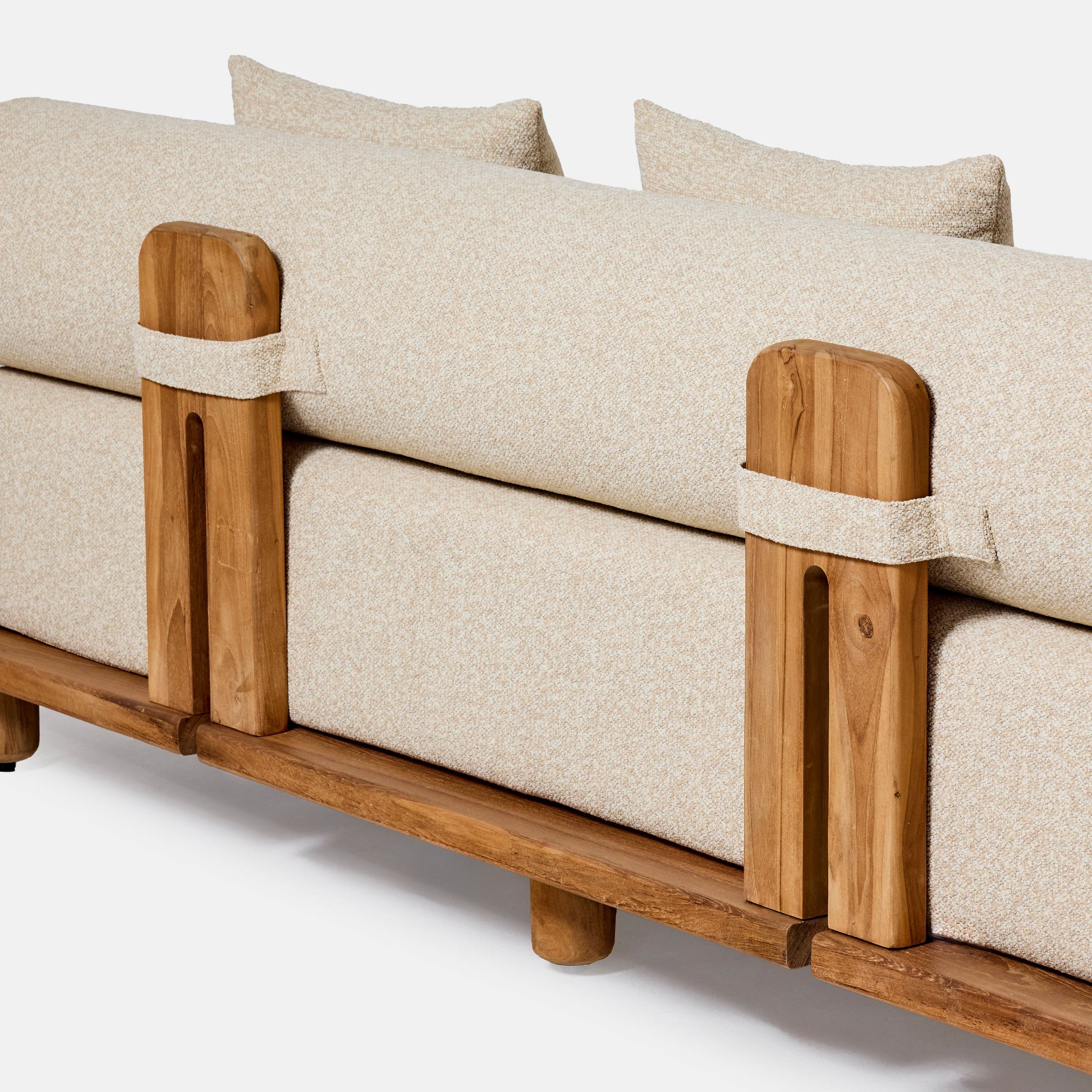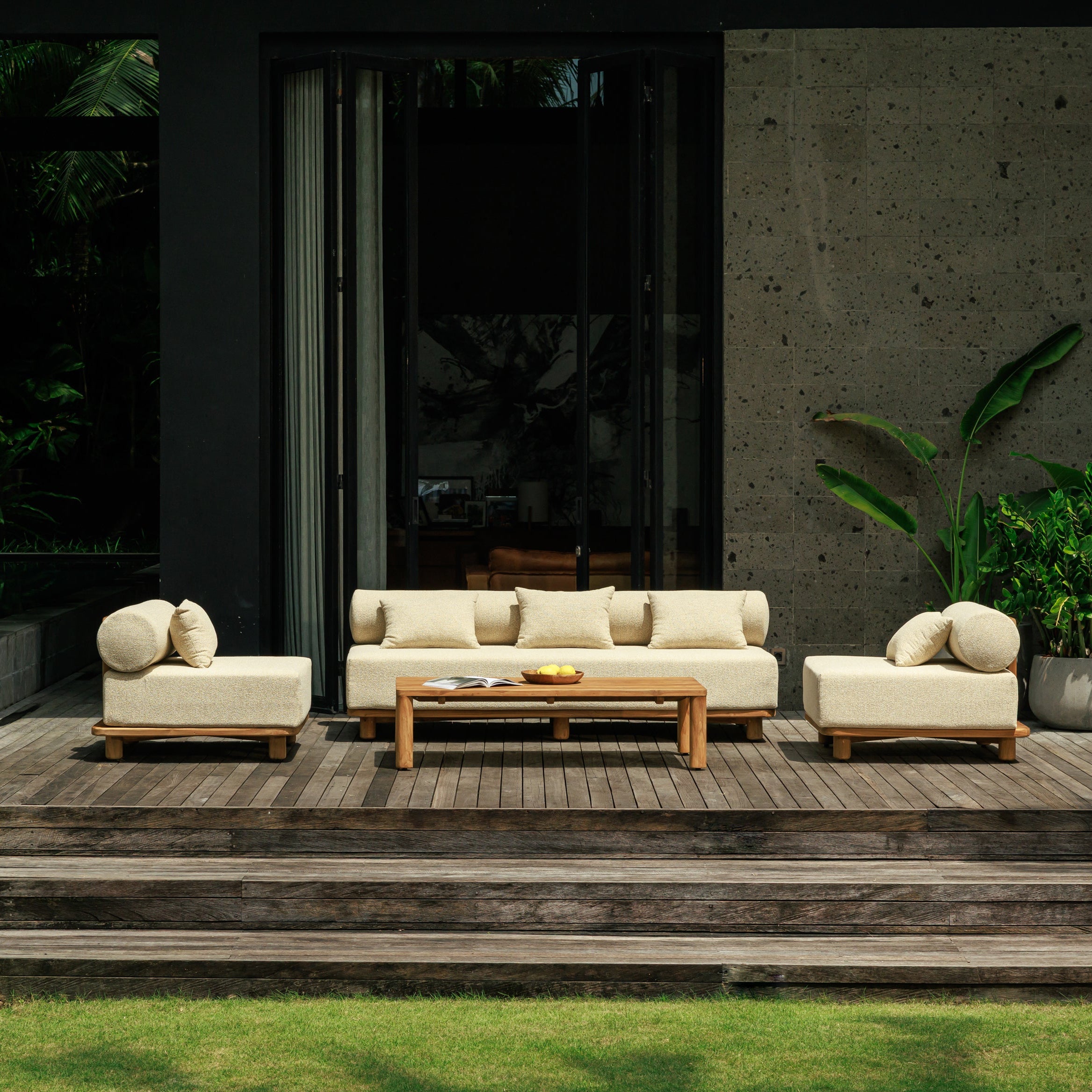 Canapé extérieur 3 places en teck massif recyclé, Jalo propose une assise généreuse pensée pour les espaces outdoor. Son bois patiné et son tissu déperlant créent un ensemble durable, confortable et adapté aux terrasses, jardins et bords de piscine.