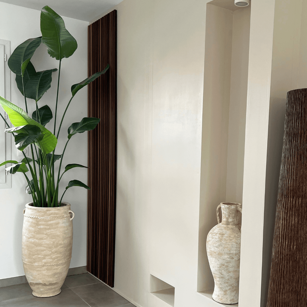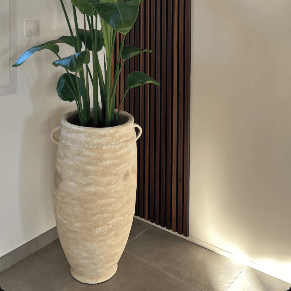 Posée seule au sol, garnie de quelques branches ou utilisée comme cache-pot, la jarre Kodong Crème apporte immédiatement du relief à l'espace. Façonnée à la main sur l’île de Lombok, elle met en avant une terracotta à l'aspect vivant, subtilement irrégulier, qui conserve la trace du geste artisanal. Sa forme généreuse et équilibrée s'associe à une finition crème texturée, facile à intégrer dans des décors épurés comme dans des intérieurs plus bohèmes. En intérieur, elle habille un angle de pièce, accompagne un banc ou complète une composition décorative avec une note minérale. En extérieur, elle trouve naturellement sa place sur une terrasse ou dans un patio. Son dessin sobre et sa matière brute lui donnent un caractère intemporel, sans effet appuyé. Chaque pièce présente de légères variations de teinte et de texture, ce qui souligne son travail artisanal et rend chaque jarre unique. Cette jarre décorative s'inscrit ainsi dans une mise en scène soignée, entre matière naturelle, usage simple et allure authentique.
