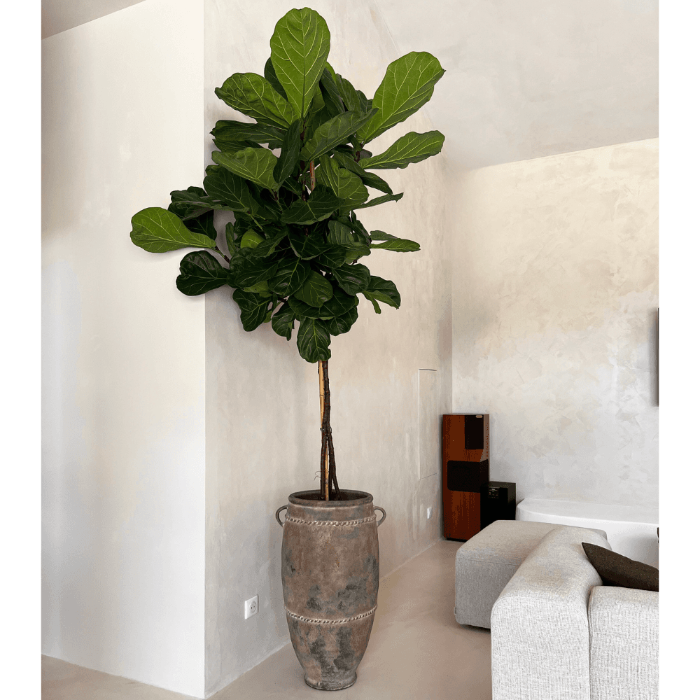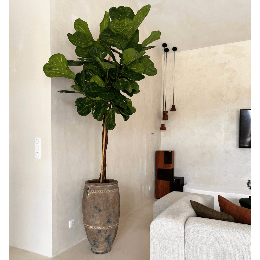 Dans une entrée, sur une terrasse ou au bout d'un salon, la jarre Kodong Antique installe d'emblée un décor plus composé. Réalisée à la main sur l'île de Lombok en Indonésie, elle met en avant le travail lent de la terracotta et le charme des finitions irrégulières. Sa surface antique, nuancée et texturée, rappelle les pièces patinées par le temps sans rien perdre de leur simplicité. Les courbes pleines de cette jarre renforcent son aplomb visuel et lui permettent de fonctionner aussi bien seule qu'associée à d'autres pots de formats variés. Utilisée en cache-pot ou simplement posée comme objet décoratif, elle trouve naturellement sa place dans des intérieurs épurés, des atmosphères wabi-sabi ou des compositions plus minérales. Son usage se prolonge aussi dehors, sur un patio ou près d'une porte, où sa matière brute conserve tout son caractère. Chaque exemplaire présente ainsi ses propres variations de teinte et de texture, liées à une fabrication artisanale qui laisse volontairement place à l'irrégularité.