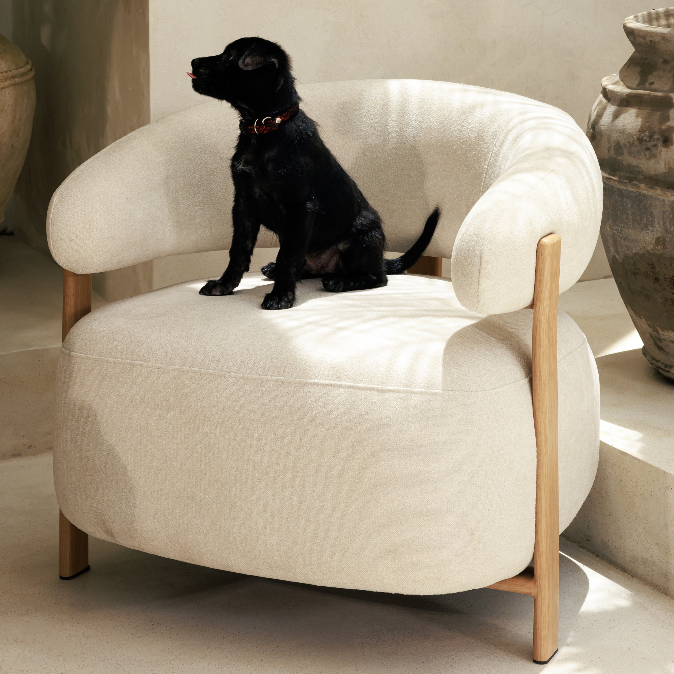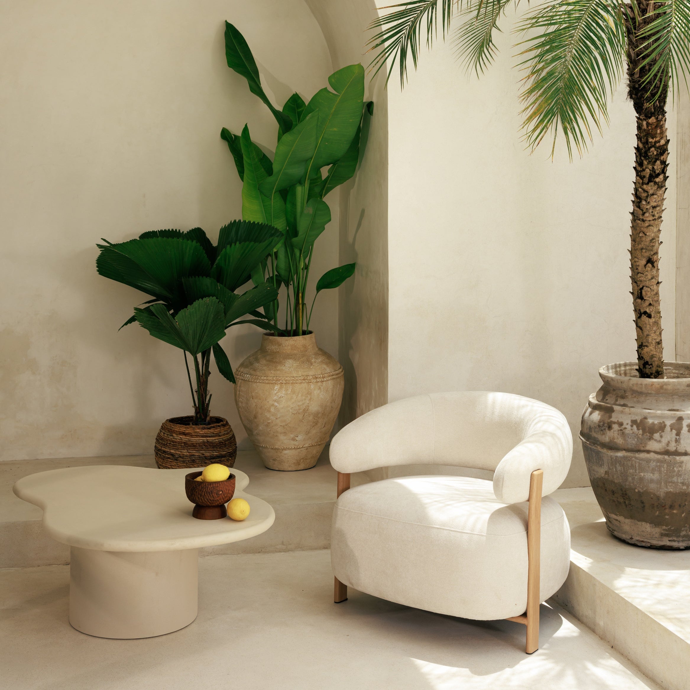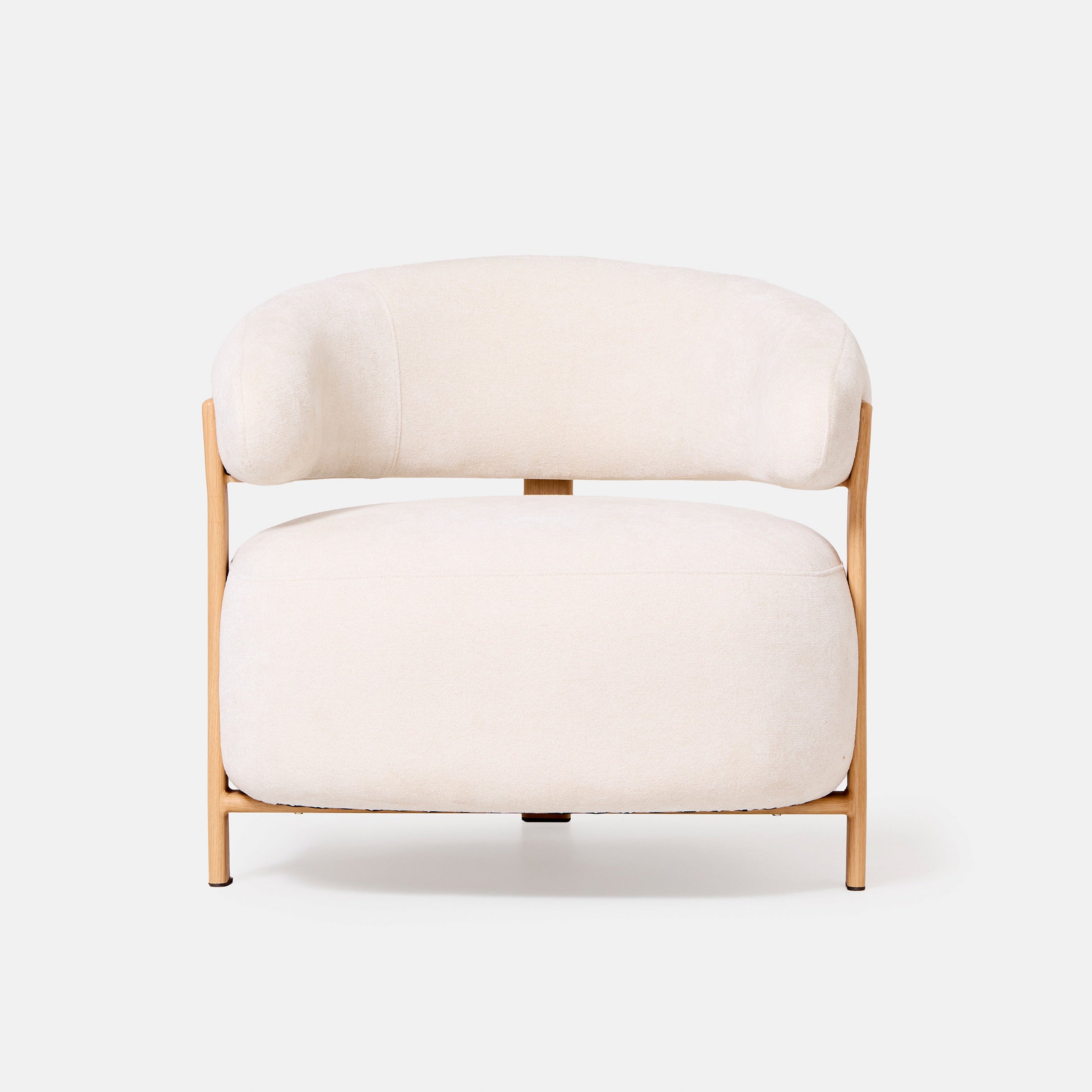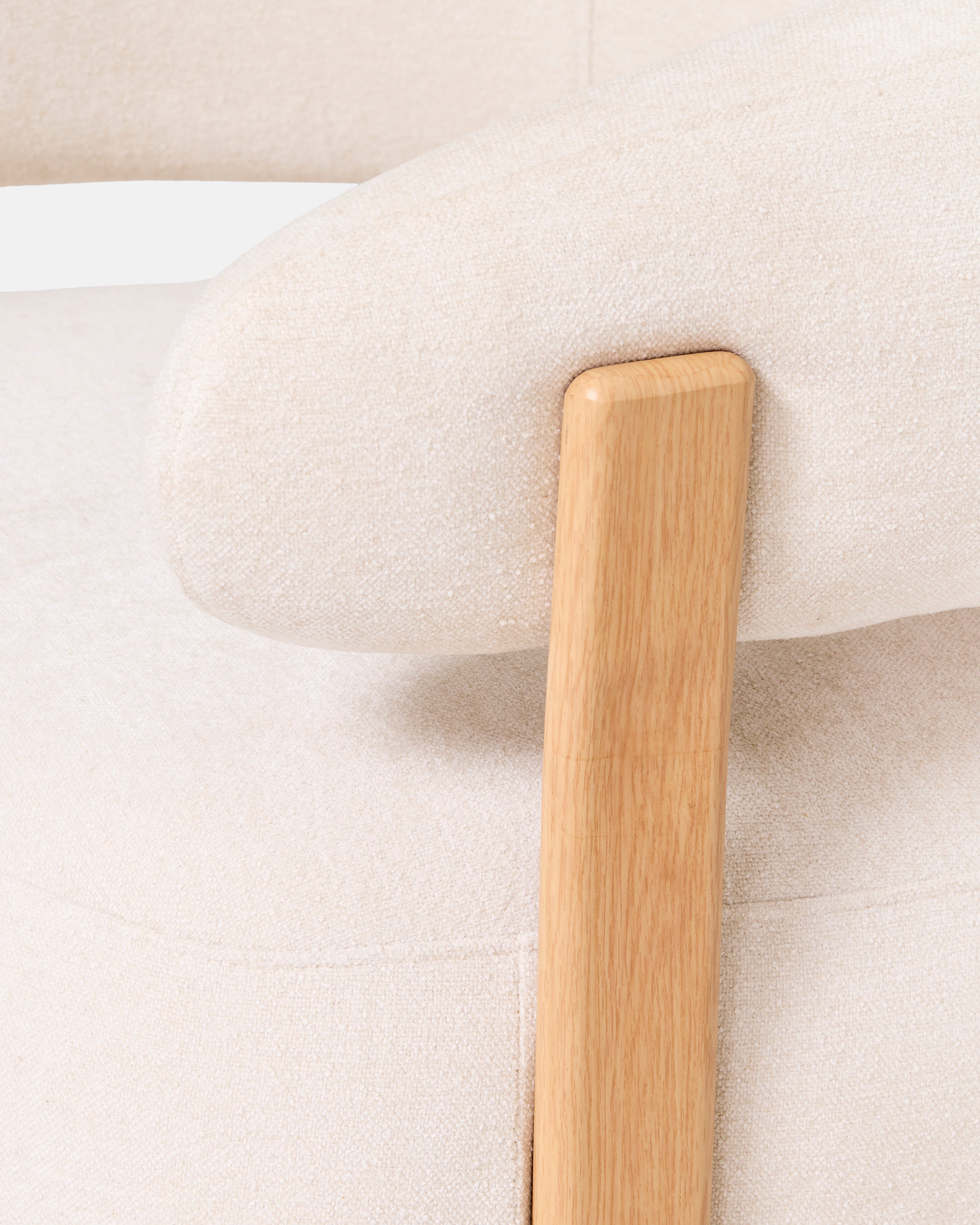Fauteuil Julio blanc en métal finition bois et tissu texturé. Assise enveloppante et design contemporain pour salon, chambre ou espace professionnel.