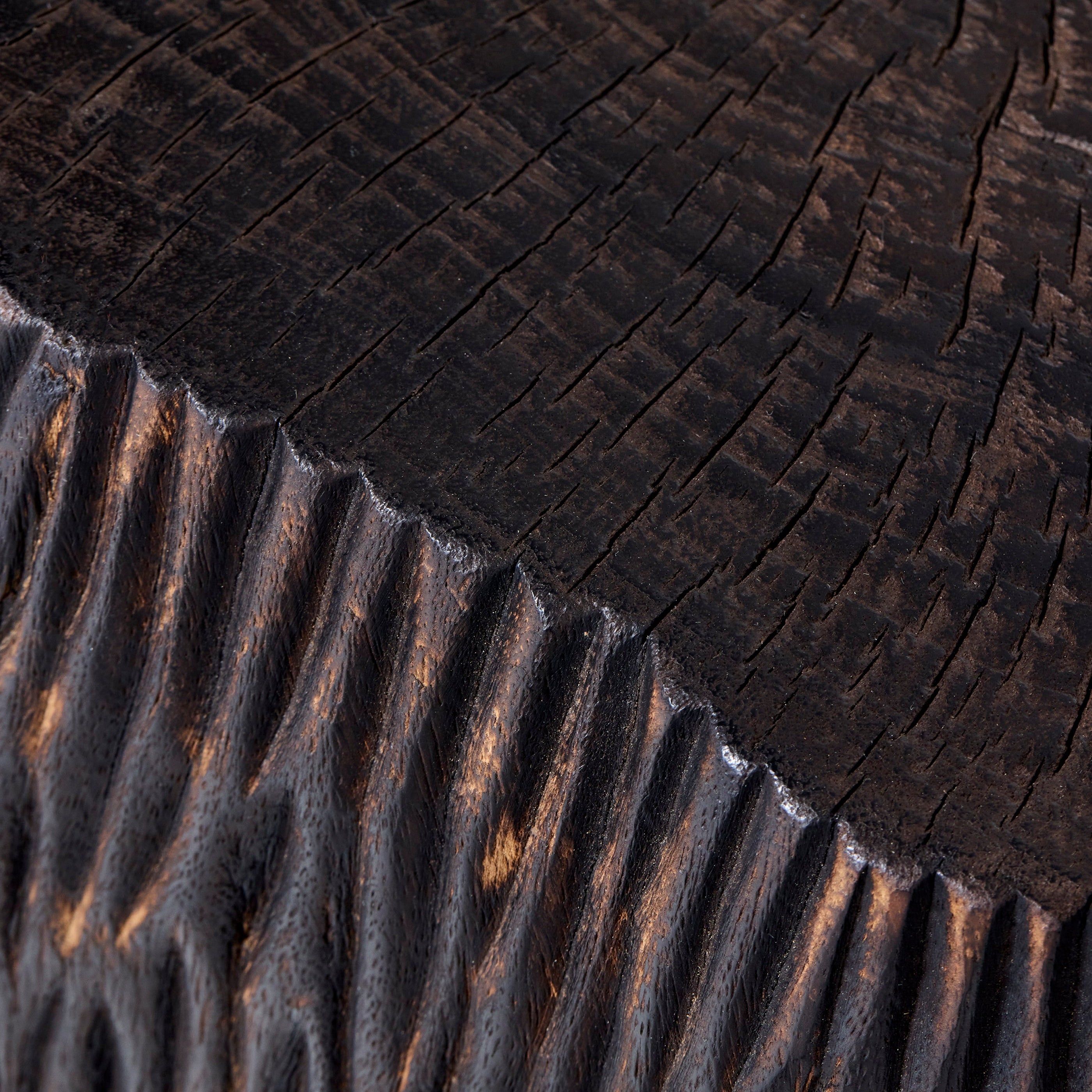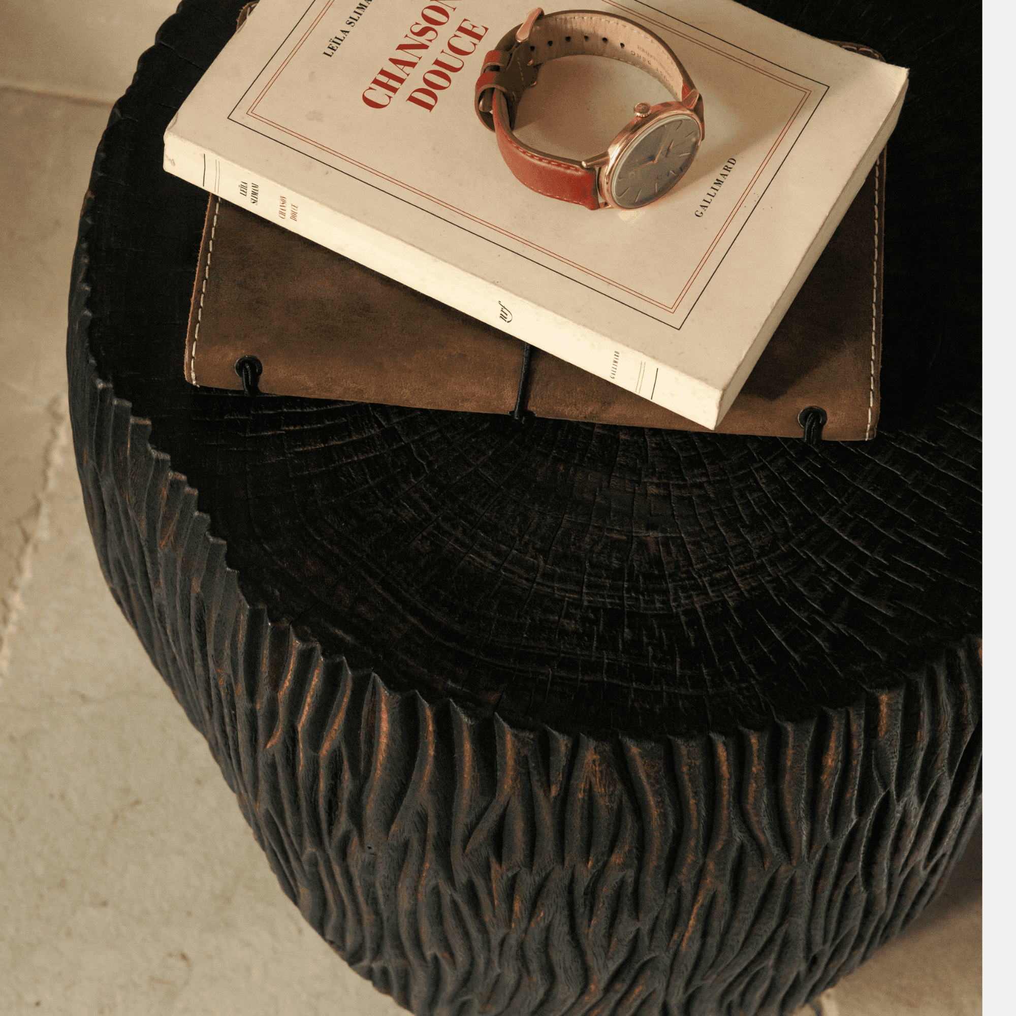 Tabouret en bois de manguier massif finition foncée au design sculptural et texturé. Polyvalent, il peut servir de tabouret, table de chevet ou bout de canapé. Une pièce artisanale qui apporte caractère et authenticité à un intérieur contemporain ou inspiré des matières naturelles.