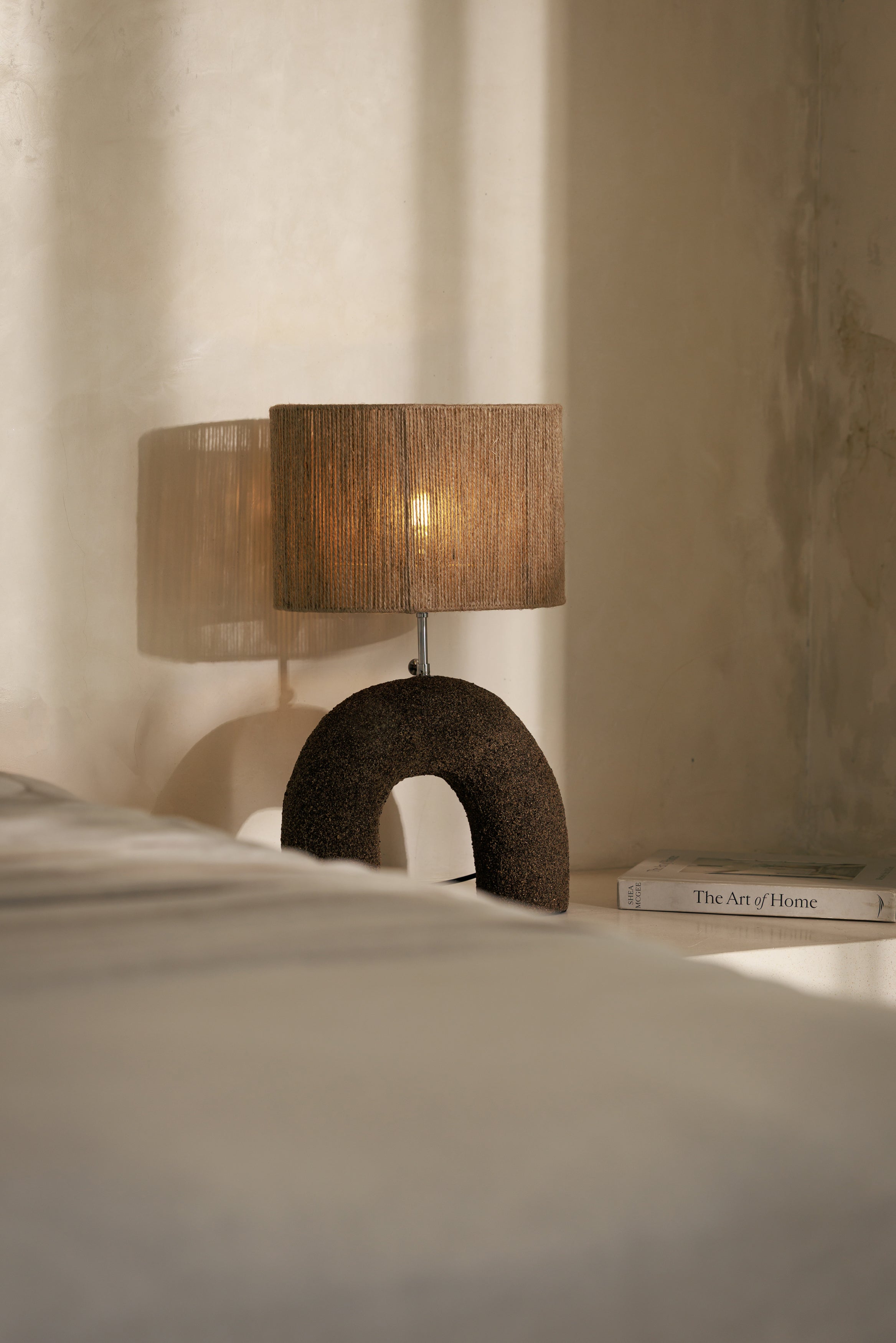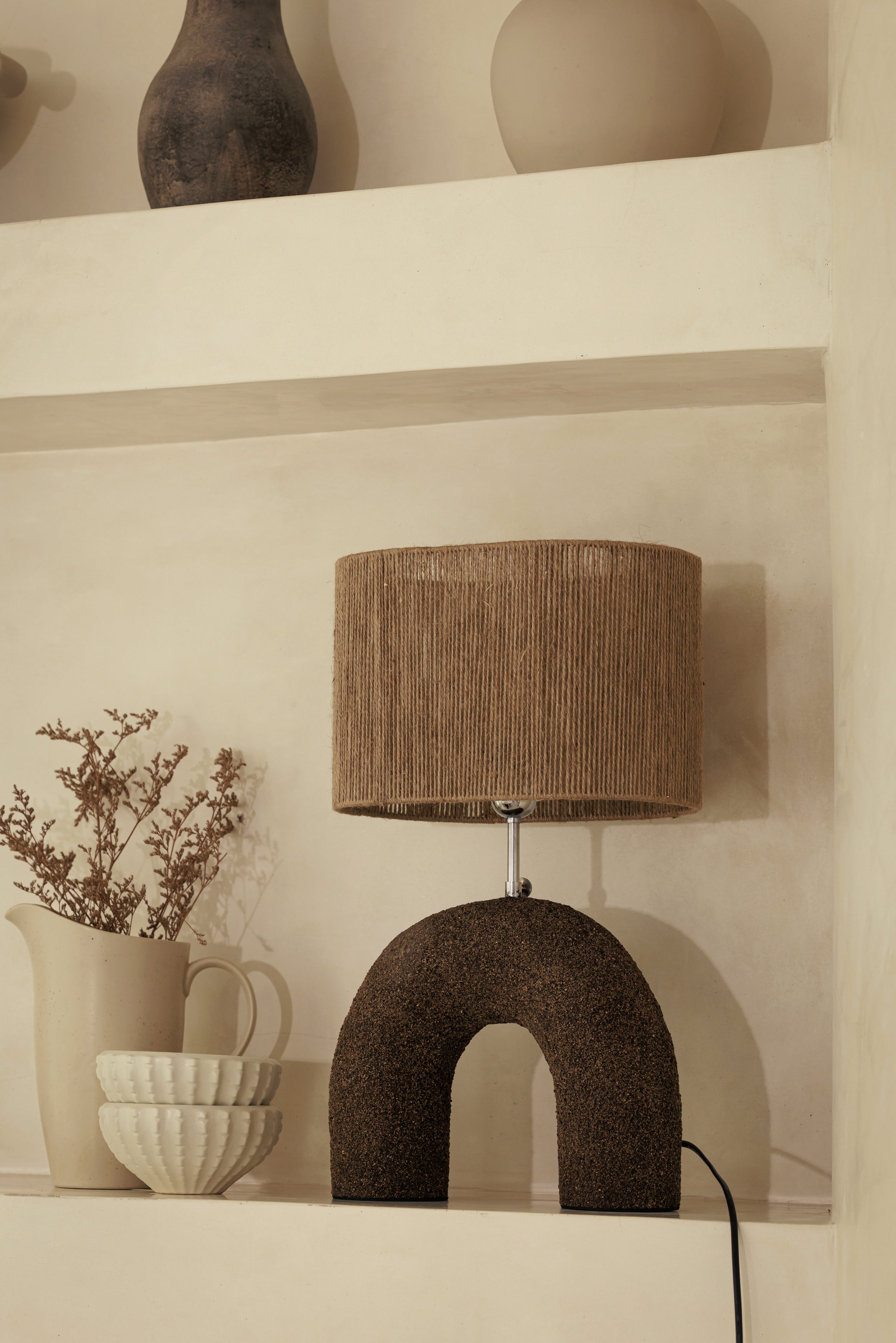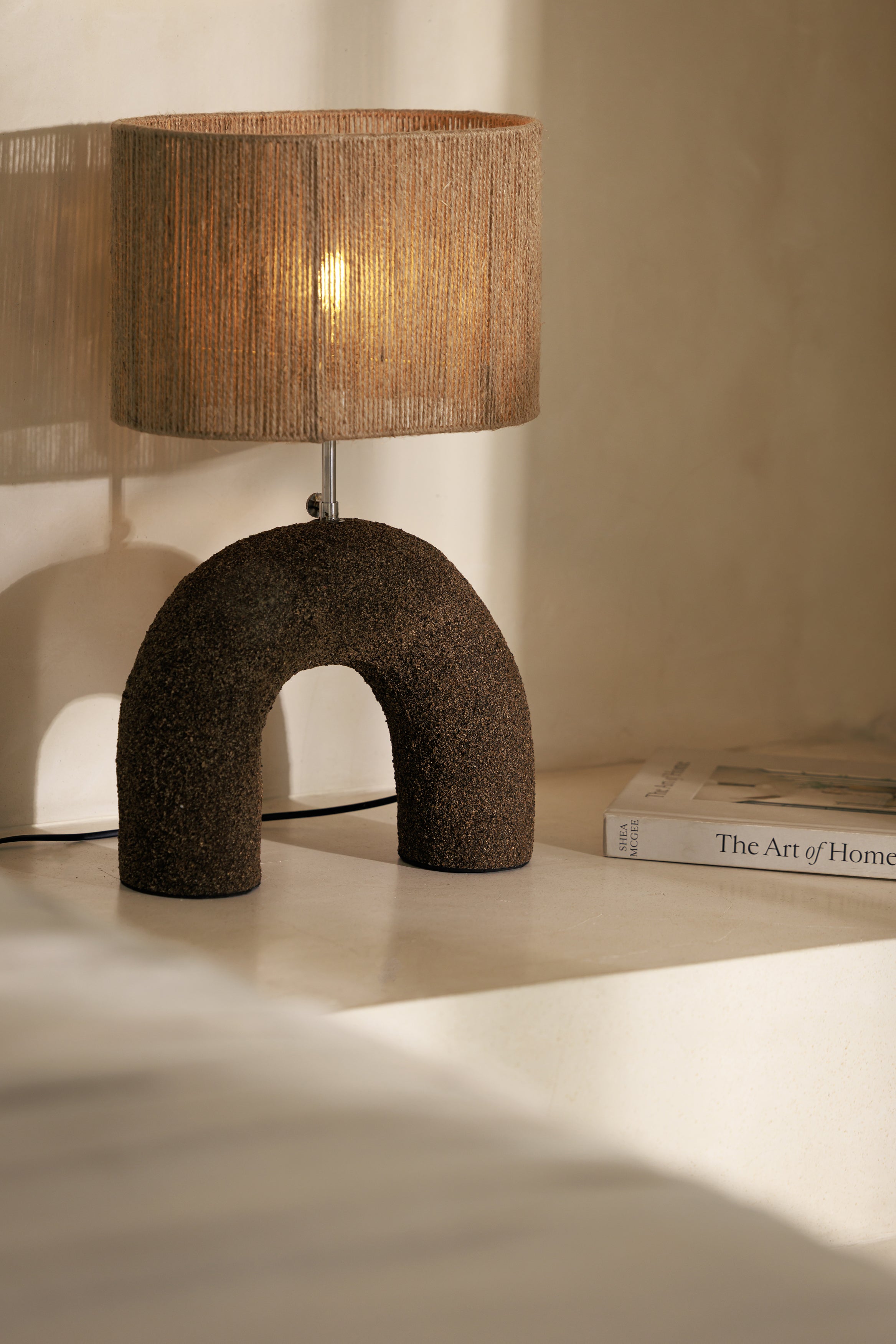 La lampe à poser Terra dark brown associe la force d’une forme sculpturale à la douceur d’une lumière tamisée. Façonnée à la main à Bali selon une technique de projection de sable et de résine, sa base brun profond révèle une texture minérale presque tellurique, comme une matière née du geste et du temps. L’abat-jour en corde vient adoucir cette présence brute en filtrant la lumière avec chaleur et délicatesse, créant un contraste élégant entre densité et légèreté, parfait pour donner du caractère à une console, une table de chevet ou un coin lecture.