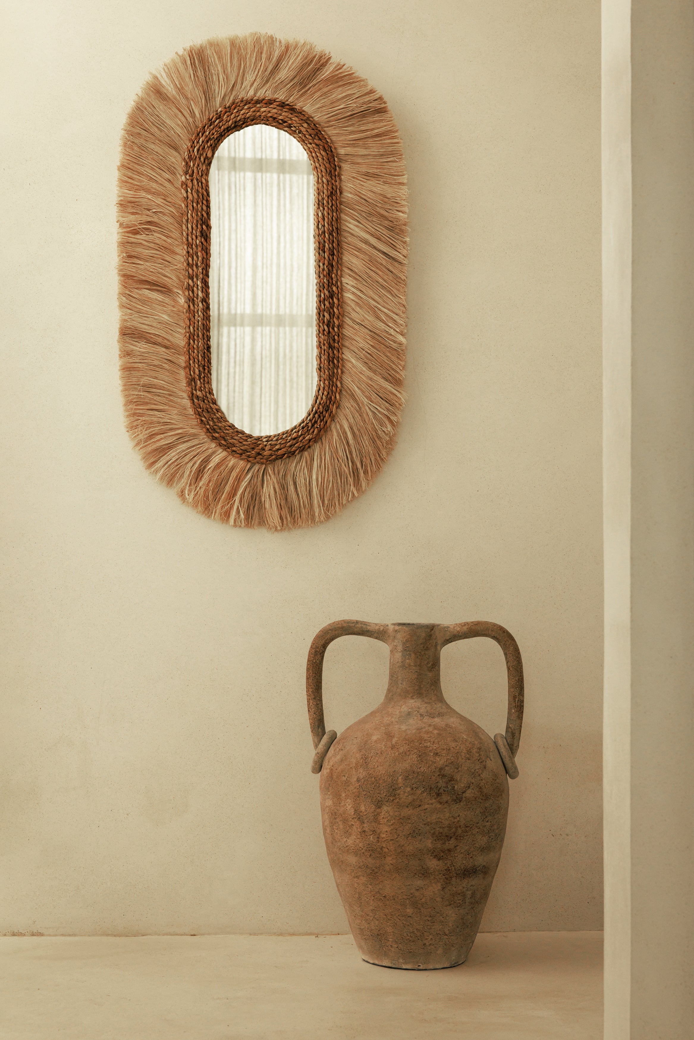 Miroir ovale en fibre de banane naturelle, le miroir Boro Oval apporte une touche bohème et organique à l’intérieur grâce à son encadrement tressé à la main et à sa forme douce et allongée. Sa silhouette ovale crée un effet visuel élégant qui capte la lumière tout en réchauffant l’espace par la texture brute des fibres naturelles. Pensé pour être accroché aussi bien verticalement qu’horizontalement, il s’intègre naturellement dans une entrée, un salon ou une chambre, et devient un élément décoratif à part entière dans un intérieur bohème, ethnique ou inspiré de la nature.