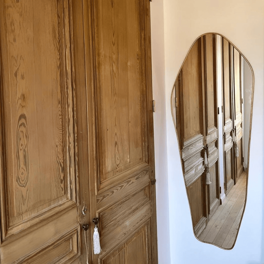 Installé sur un mur clair, ce miroir en laiton dessine immédiatement une ligne plus libre dans la pièce. Son contour asymétrique rompt avec les formats classiques et introduit un jeu de formes souple, presque graphique, qui convient aussi bien à un décor épuré qu’à un intérieur plus composé. Le cadre en laiton doré souligne cette écriture organique avec une finition nette et lumineuse, sans alourdir l’ensemble. Dans une entrée, il accompagne les passages du quotidien tout en habillant le mur avec justesse. Dans un salon, il crée un point d’équilibre décoratif et prolonge les perspectives par le reflet. Placé dans une chambre, il apporte une note sophistiquée tout en restant facile à associer. Sa fabrication artisanale et les légères variations possibles d’une pièce à l’autre renforcent son caractère singulier. À la fois fonctionnel et décoratif, ce miroir mural structure l’espace avec une allure contemporaine, entre influence organique, sobriété minimaliste et finition en matière noble.