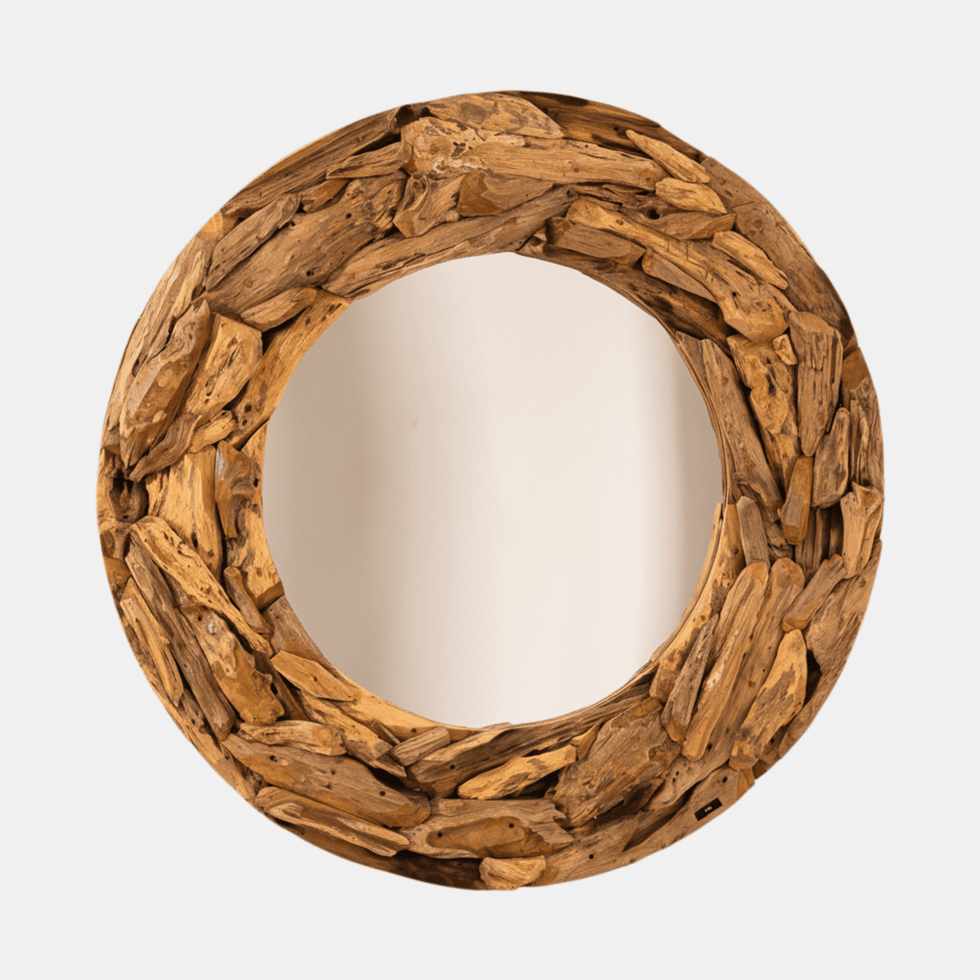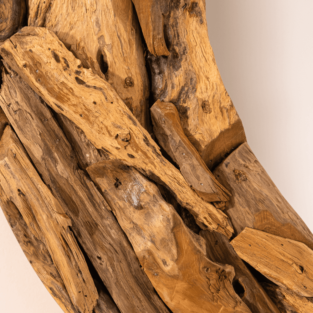 Installé dans une entrée, au-dessus d’un meuble bas ou en point d’ancrage dans un salon, le miroir Miro structure immédiatement le mur par son format rond et son cadre travaillé à partir de bois recyclé. L’assemblage artisanal de fragments de bois crée une composition irrégulière, riche en nuances et en contrastes, qui donne à chaque pièce un aspect singulier. Cette diversité visuelle fait tout l’intérêt du modèle, entre esprit brut et finition décorative. Le miroir ne se contente pas d’être pratique au quotidien, il participe aussi à l’équilibre de la pièce en apportant relief et clarté. Dans une chambre, il complète un décor naturel sans l’alourdir. Dans une entrée, il marque l’espace avec caractère. Son dessin rond adoucit les lignes plus droites du mobilier tandis que le bois recyclé introduit une note authentique, facile à intégrer dans un univers bohème, rustique ou contemporain. Les variations du cadre, liées à la matière et au travail manuel, renforcent encore son allure artisanale.