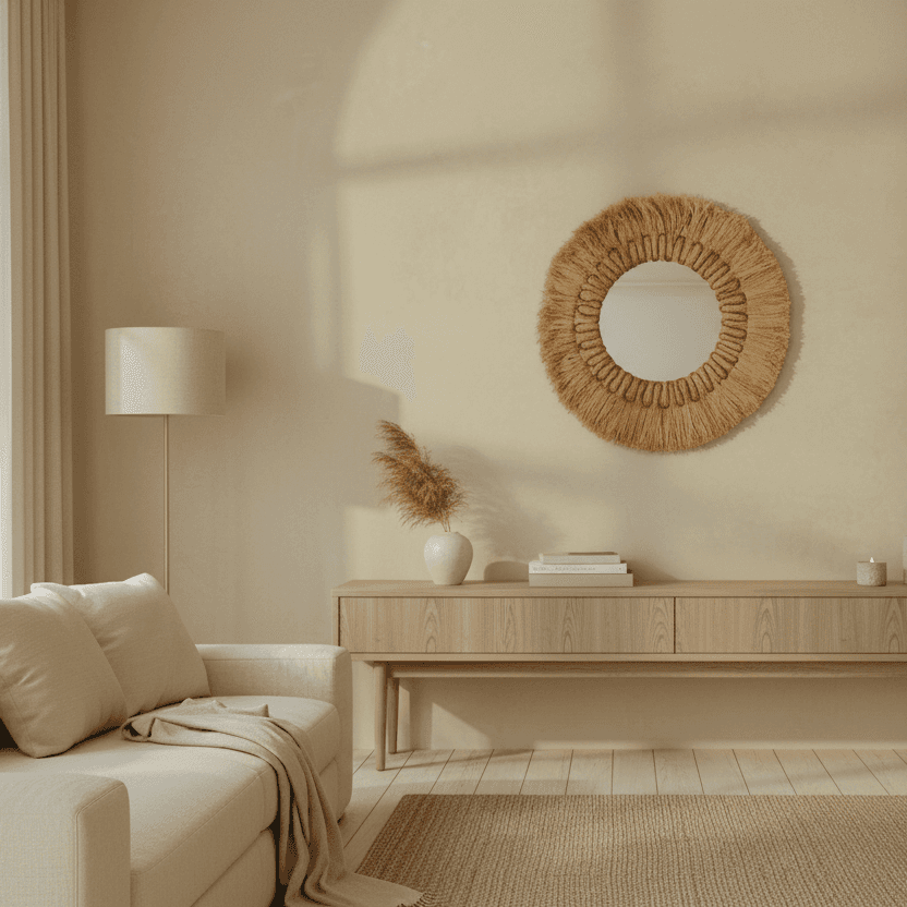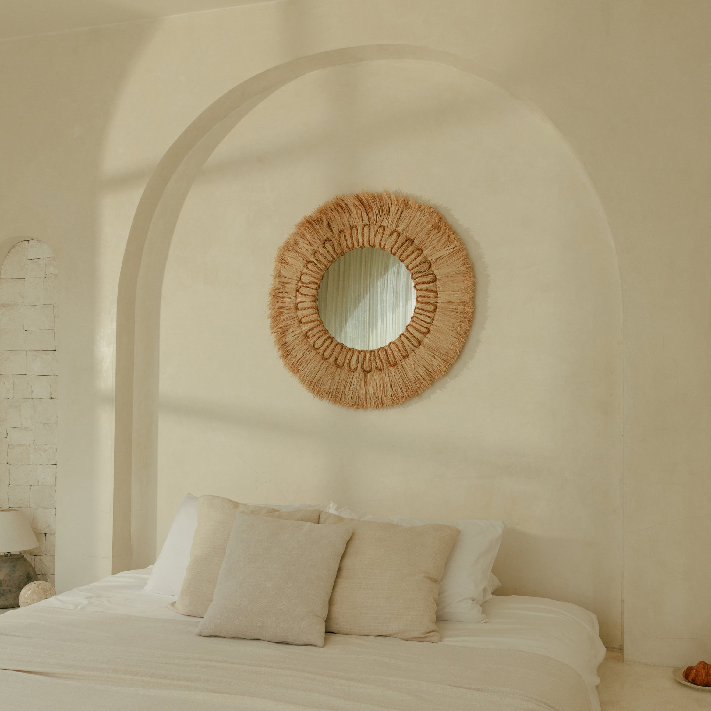 Dans une entrée, un salon ou une chambre, le miroir Sisal apporte un accent mural naturel. Réalisé à la main à Bali en fibres naturelles de sisal, il se distingue par son large contour tressé qui habille le mur d'une texture organique et soignée.