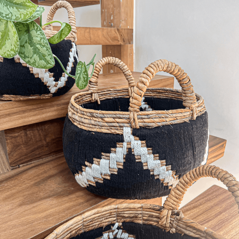 Dans une entrée, près d'un canapé ou au pied du lit, le panier Hidam ajoute un rangement décoratif qui ne passe pas inaperçu. La fibre de banane naturelle tressée compose une base souple visuellement, tandis que le macramé artisanal apporte un contraste plus graphique et une finition travaillée. Cet équilibre entre matière végétale et détail textile lui permet de trouver facilement sa place dans un intérieur bohème, ethnique chic ou plus sobre. Utile pour accueillir des plaids, des magazines, du linge ou les objets du quotidien, il structure l'espace sans l'alourdir. Fabriqué à la main en Indonésie, chaque modèle présente de légères variations de teinte et de tressage qui soulignent le travail artisanal sans détourner l'objet de sa fonction première. Son aspect naturel s'intègre aussi bien dans une chambre apaisée que dans un salon aux matières brutes, en apportant un accent décoratif simple, soigné et authentique.