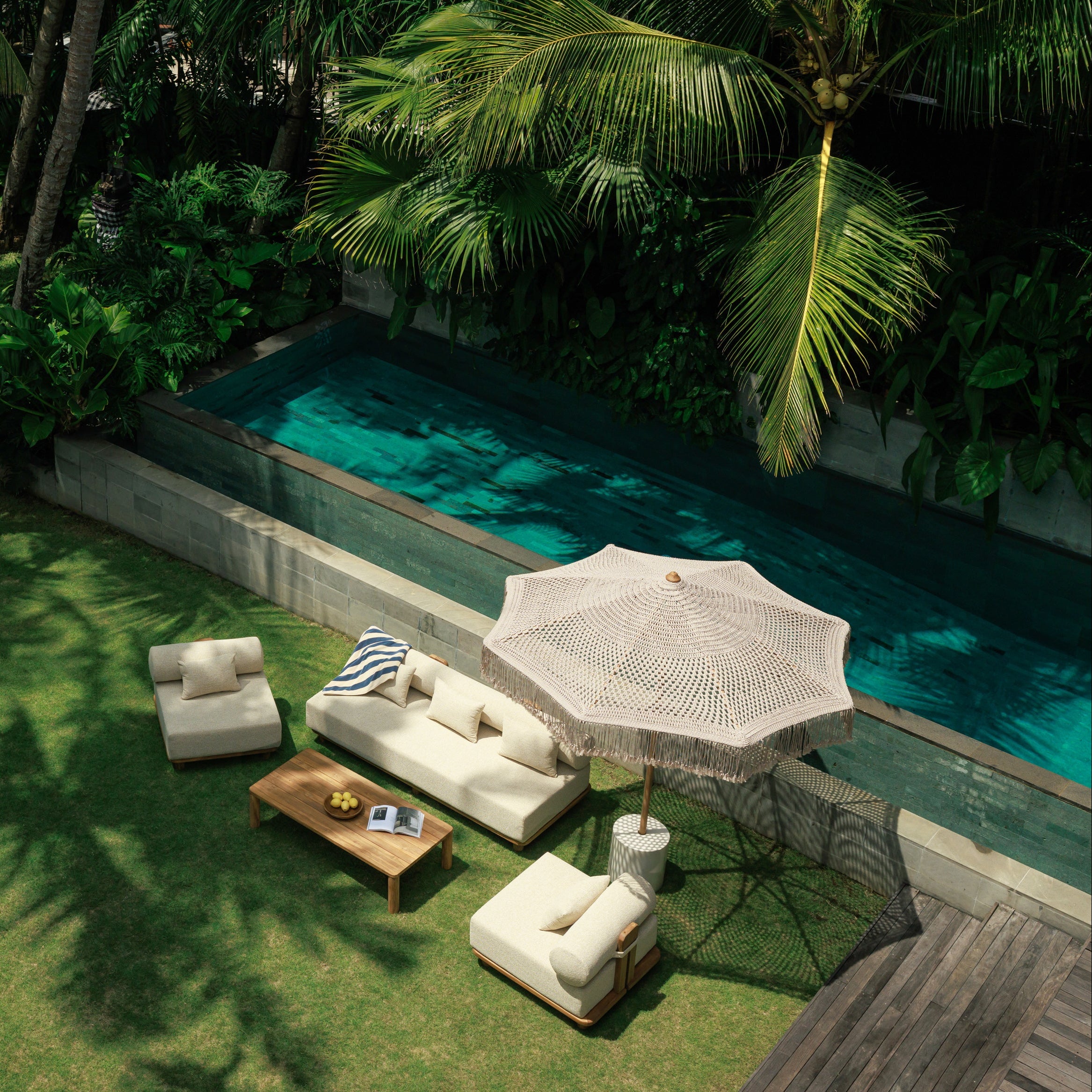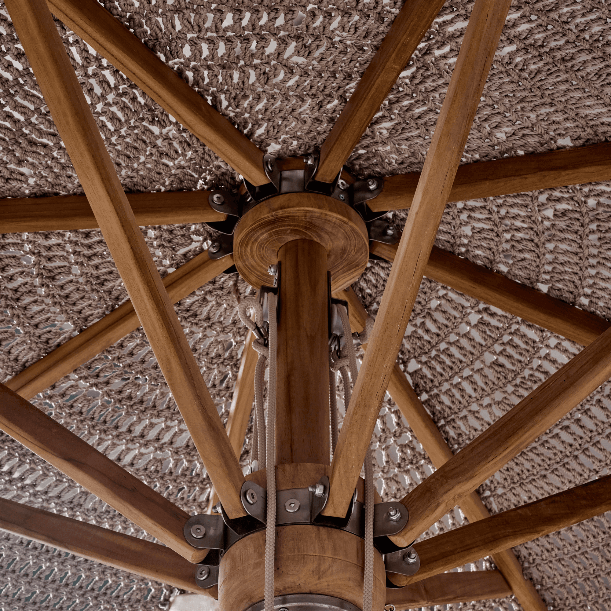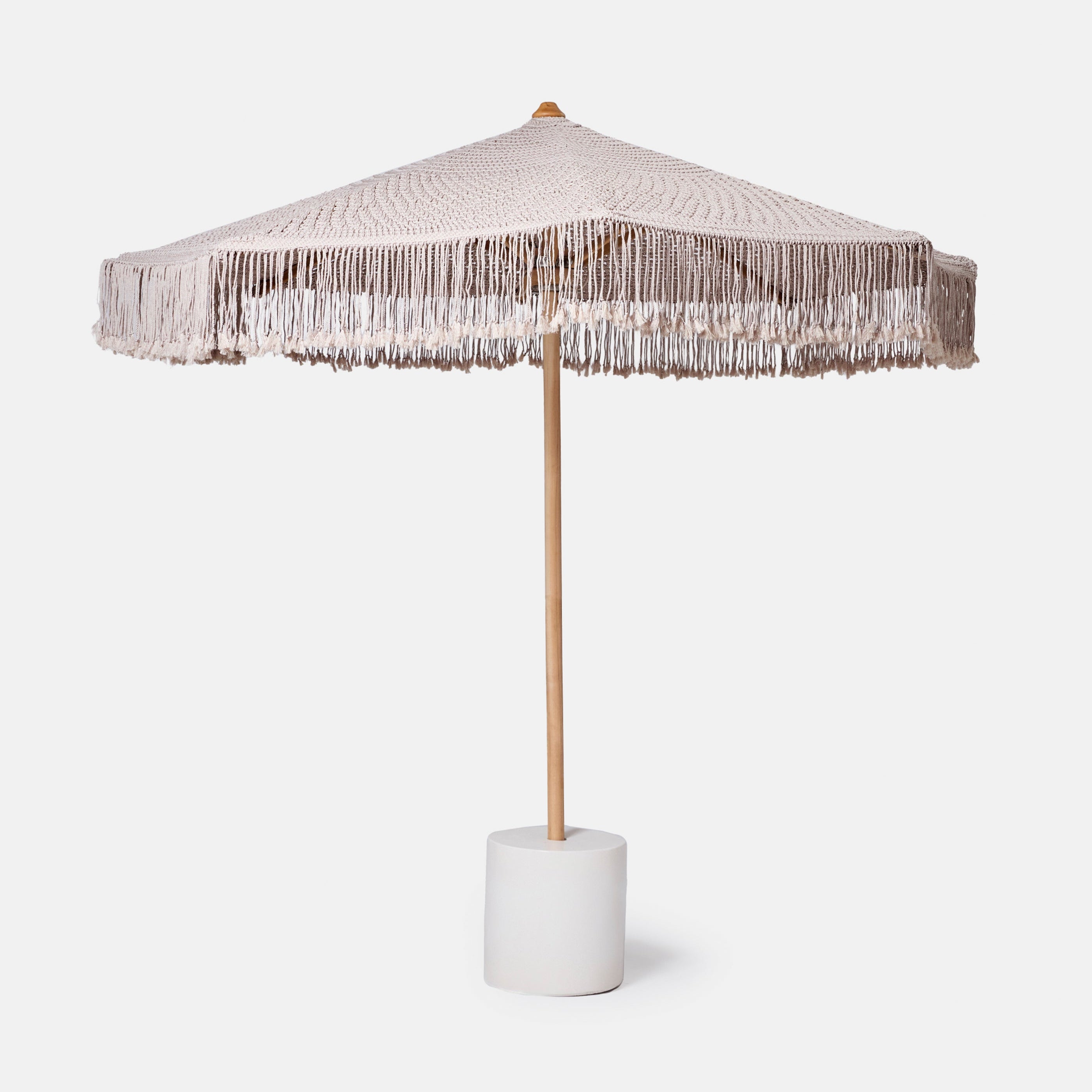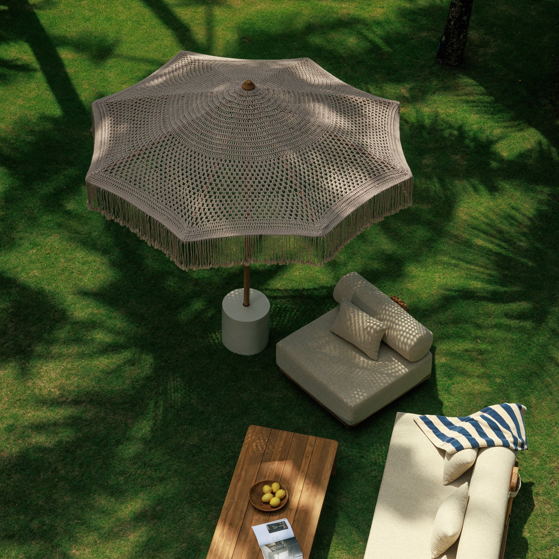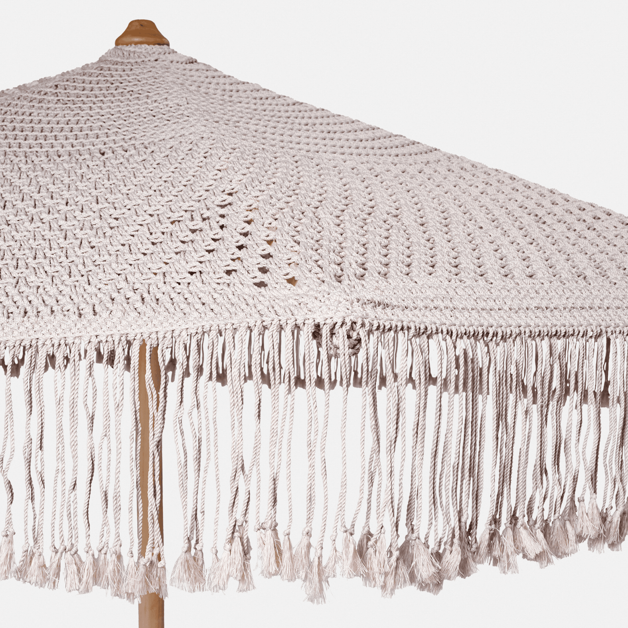 Parasol Macra beige en macramé synthétique et structure en teck naturel, idéal pour terrasse, jardin ou bord de piscine. Son diamètre de 250 cm offre une ombre élégante tout en apportant une touche bohème naturelle aux espaces extérieurs. Résistant au soleil et à la pluie, il associe esthétique et durabilité.