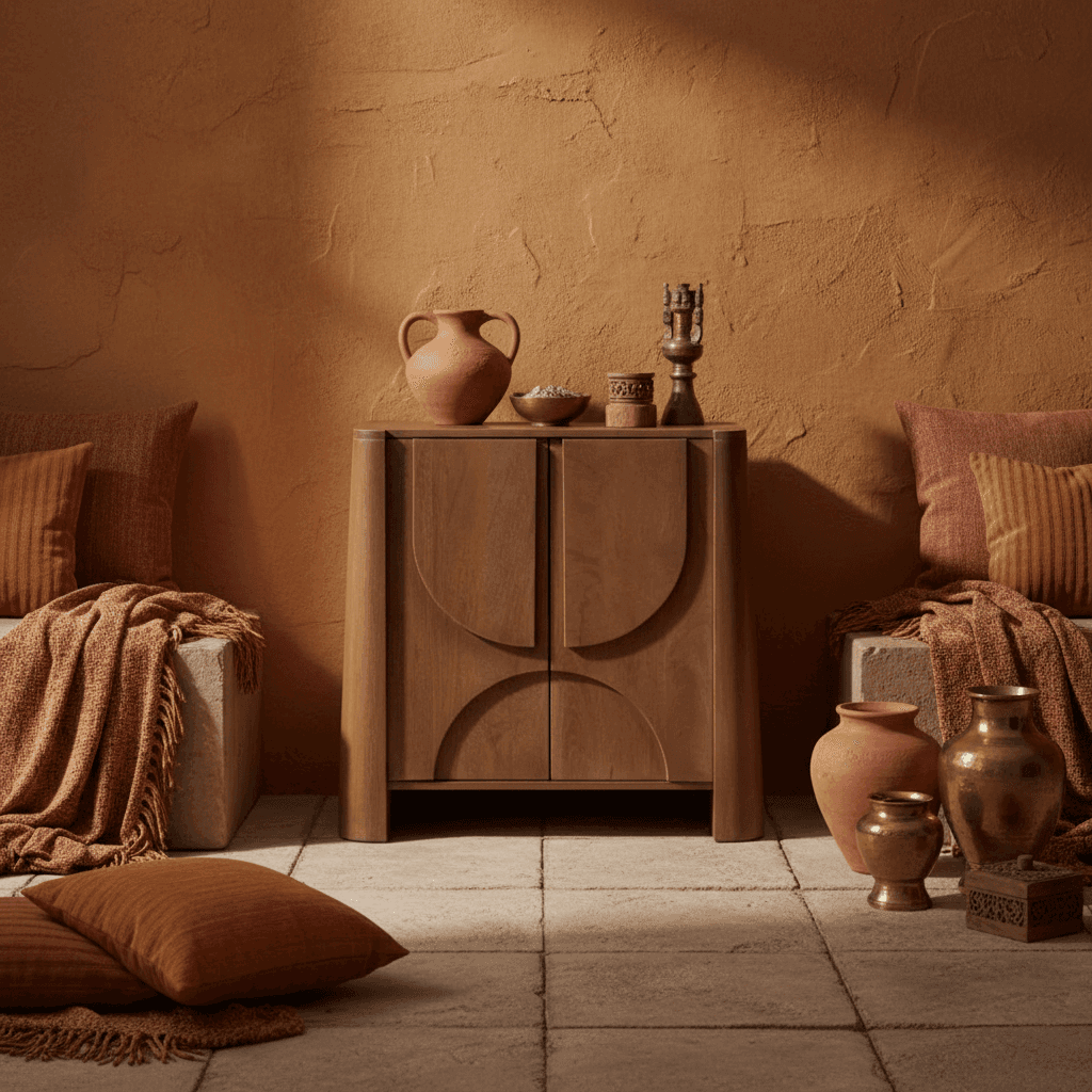 Le petit buffet Rupa apporte instantanément du caractère à l’espace grâce à sa silhouette compacte et à ses portes sculptées de motifs arrondis qui captent la lumière comme un relief architectural. Sa teinte tabac nuancée de miel diffuse une chaleur naturelle, parfaite pour une entrée, un salon ou une chambre. Ce format maîtrisé en fait une pièce forte qui structure l’intérieur sans l’alourdir, offrant un plateau idéal pour accueillir un vase, une lampe ou quelques objets décoratifs. Façonné artisanalement, chaque buffet présente des variations subtiles dans le motif et la matière, rendant chaque modèle unique, avec sa propre personnalité.