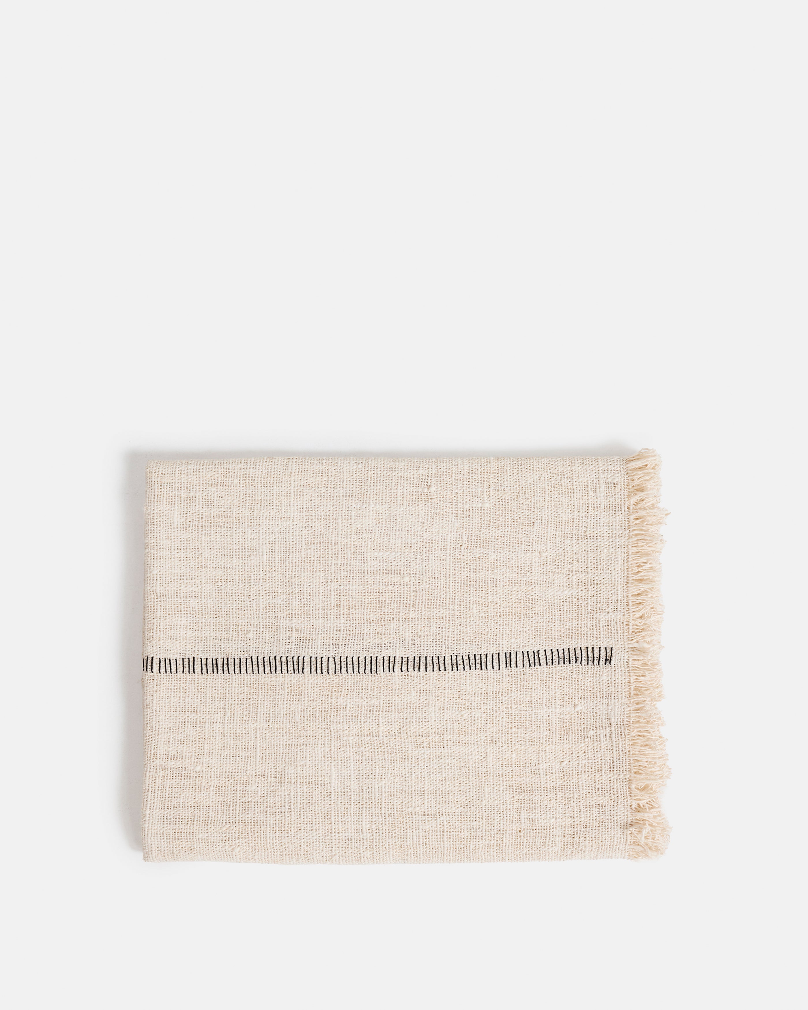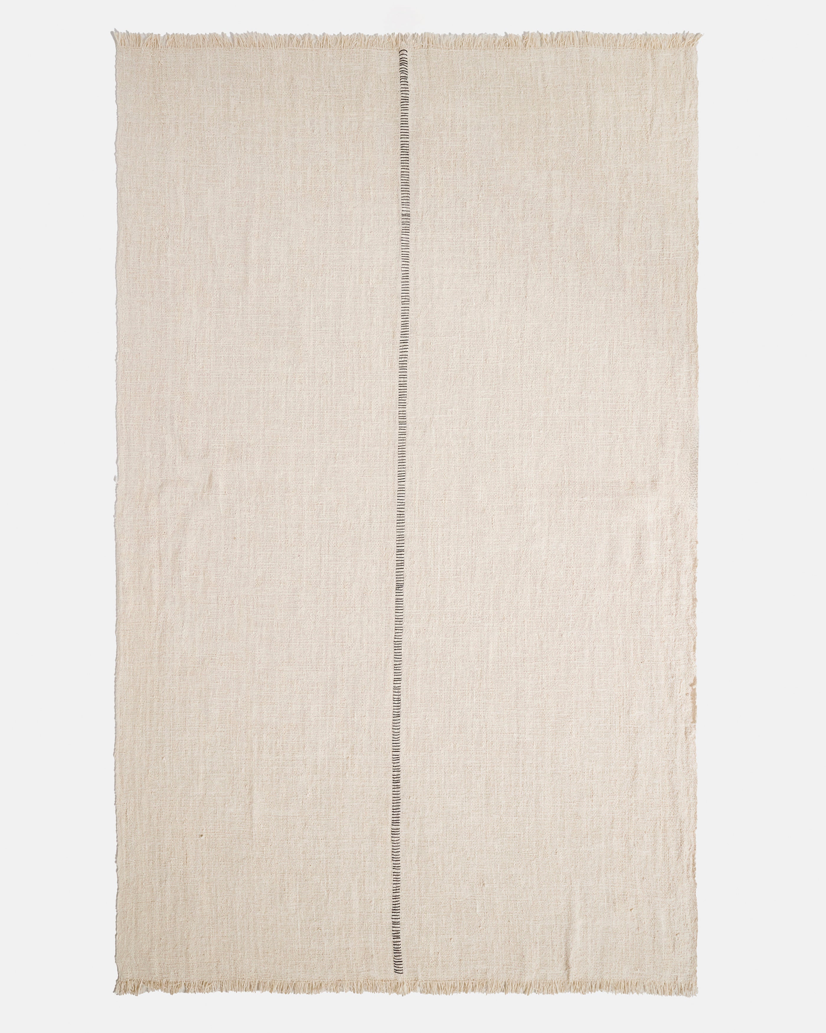 Lina se distingue par une simplicité évidente, presque instinctive, où la matière parle avant tout. Sa surface écrue, traversée par une ligne cousue noire fine et rythmée, crée un équilibre discret qui apaise le regard. Rien n’est démonstratif, tout est dans la justesse, dans ce contraste subtil qui donne à ce plaid une présence douce et silencieuse, parfaitement intégrée à l’espace.
