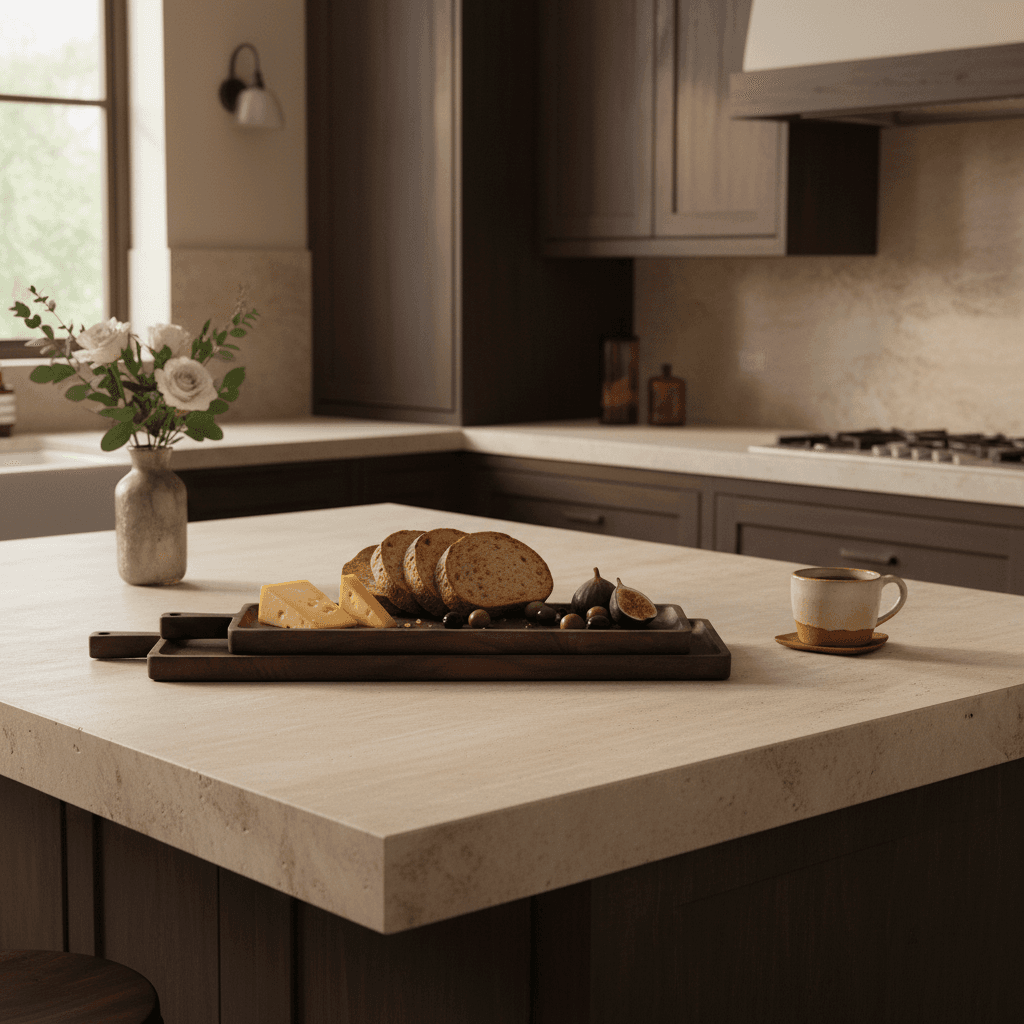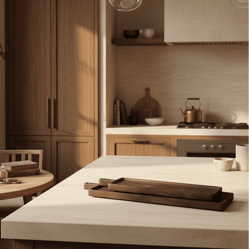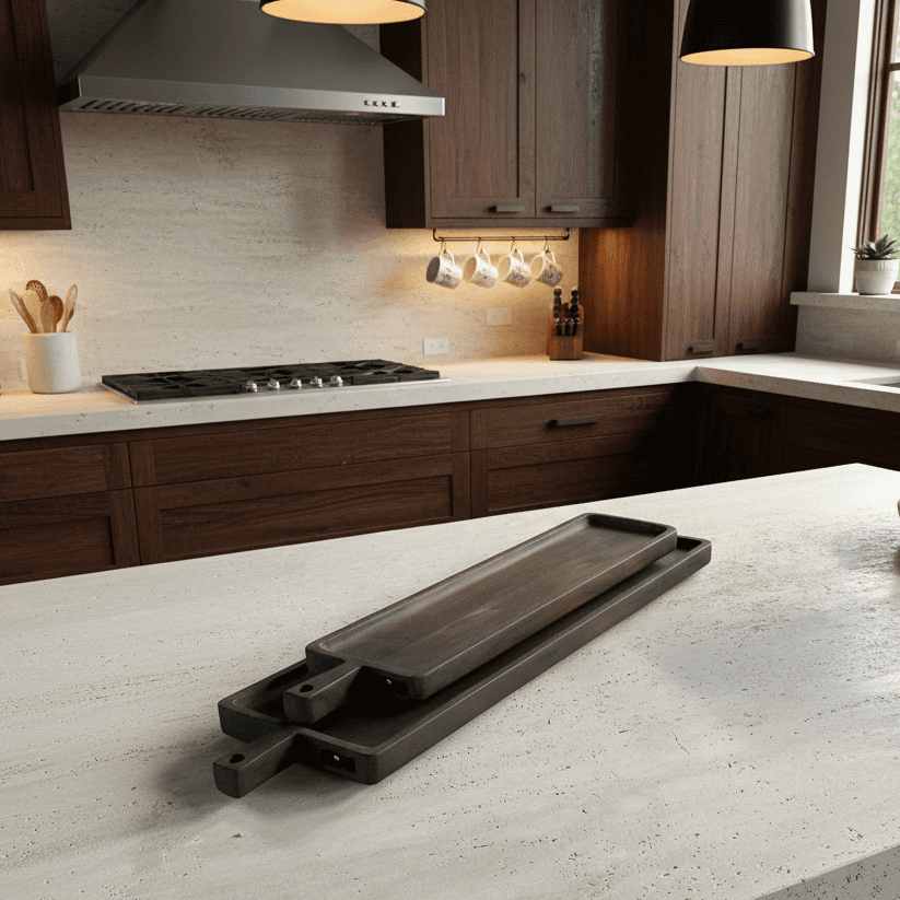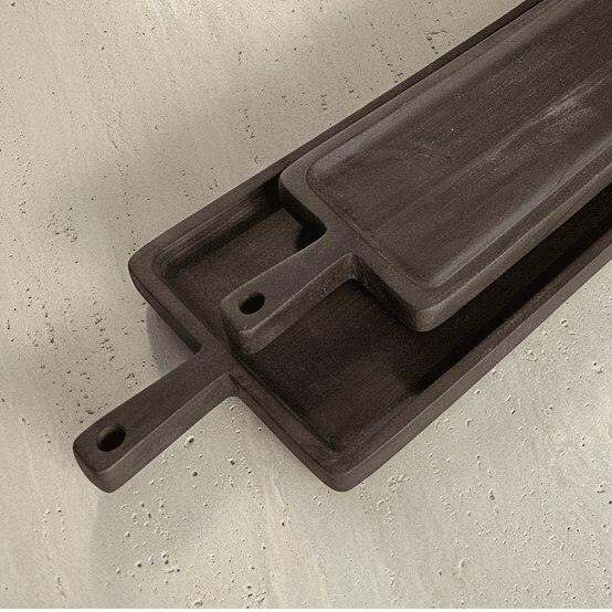 Sur une table dressée, la planche Taal attire l’œil par son format surélevé et sa teinte brun foncé, qui donnent du relief à la présentation sans en faire trop. Réalisée en bois de manguier massif, elle s’utilise aussi bien pour servir un apéritif, présenter des fromages ou disposer quelques douceurs à partager. Ses quatre petits pieds intégrés créent un discret effet podium, pratique pour détacher visuellement ce qu’elle accueille et structurer l’art de la table. Le bois, avec ses nuances naturelles, apporte du caractère à l’ensemble et rappelle le travail artisanal de chaque pièce. Dans une cuisine, elle accompagne le service du quotidien comme les repas plus soignés. Au salon, elle peut aussi accueillir une composition décorative ou devenir un support de présentation posé sur une console ou une table basse. Cette polyvalence en fait un accessoire facile à intégrer, à la fois utile et décoratif. Chaque exemplaire conserve les variations propres au manguier massif, ce qui renforce l’authenticité de son dessin et l’intérêt de sa finition faite à la main.