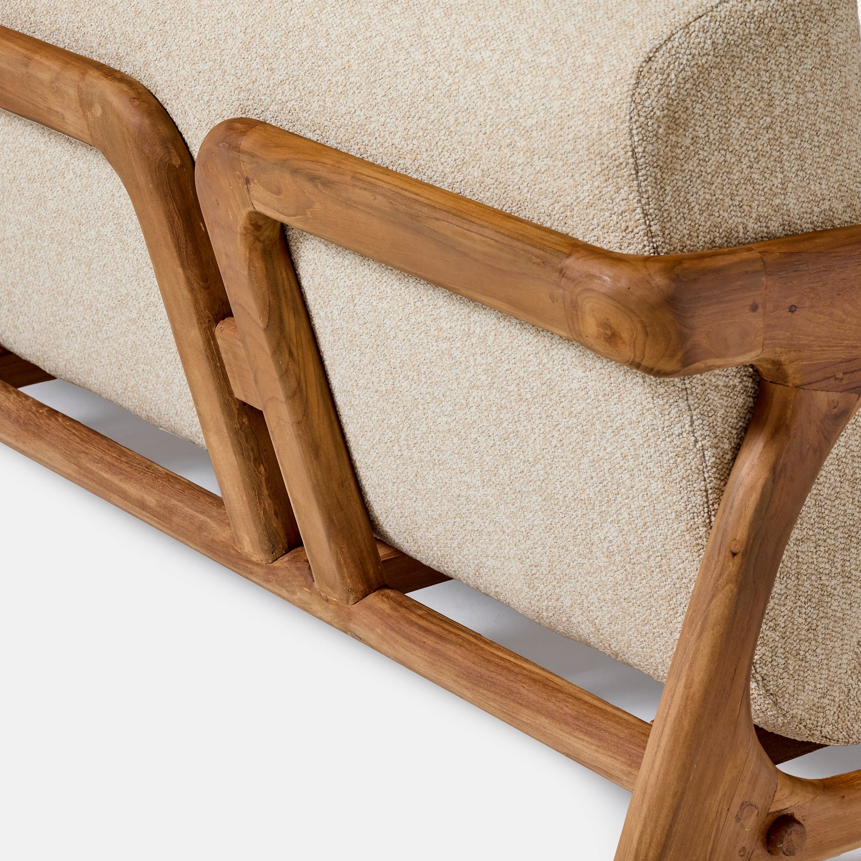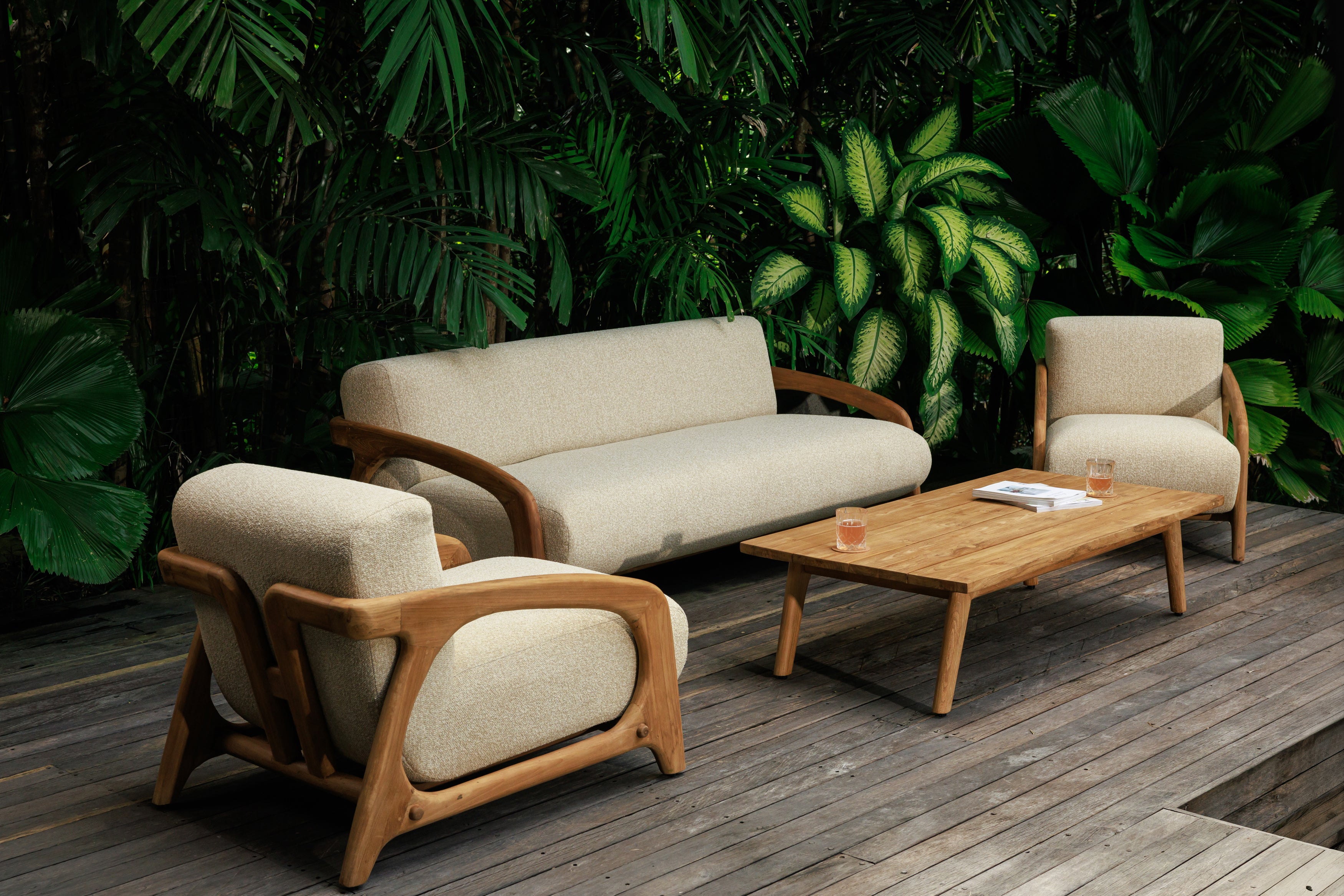 Le canapé Pola dessine une silhouette plus ouverte et lumineuse, où le teck massif recyclé se révèle dans des lignes fines et légèrement inclinées, comme une structure posée en équilibre sur la lumière. Le bois, marqué par le temps et les matières, révèle ses nuances dorées et ses veines naturelles, tandis que les coussins généreux en tissu déperlant et mousse à séchage rapide apportent une douceur visuelle et un confort enveloppant. L’assise, plus légère dans son dessin, laisse circuler l’air et la lumière, créant une atmosphère extérieure apaisée et élégante, idéale pour prolonger les journées d’été. Sur une terrasse, autour d’une table basse ou face à un jardin, Pola installe un espace de détente simple et sophistiqué, fidèle à l’esprit Design Trip entre artisanat, design contemporain et art de vivre en plein air. Pensé pour durer, ce canapé en teck recyclé traverse les saisons avec une élégance naturelle et une résistance adaptée à un usage extérieur quotidien.