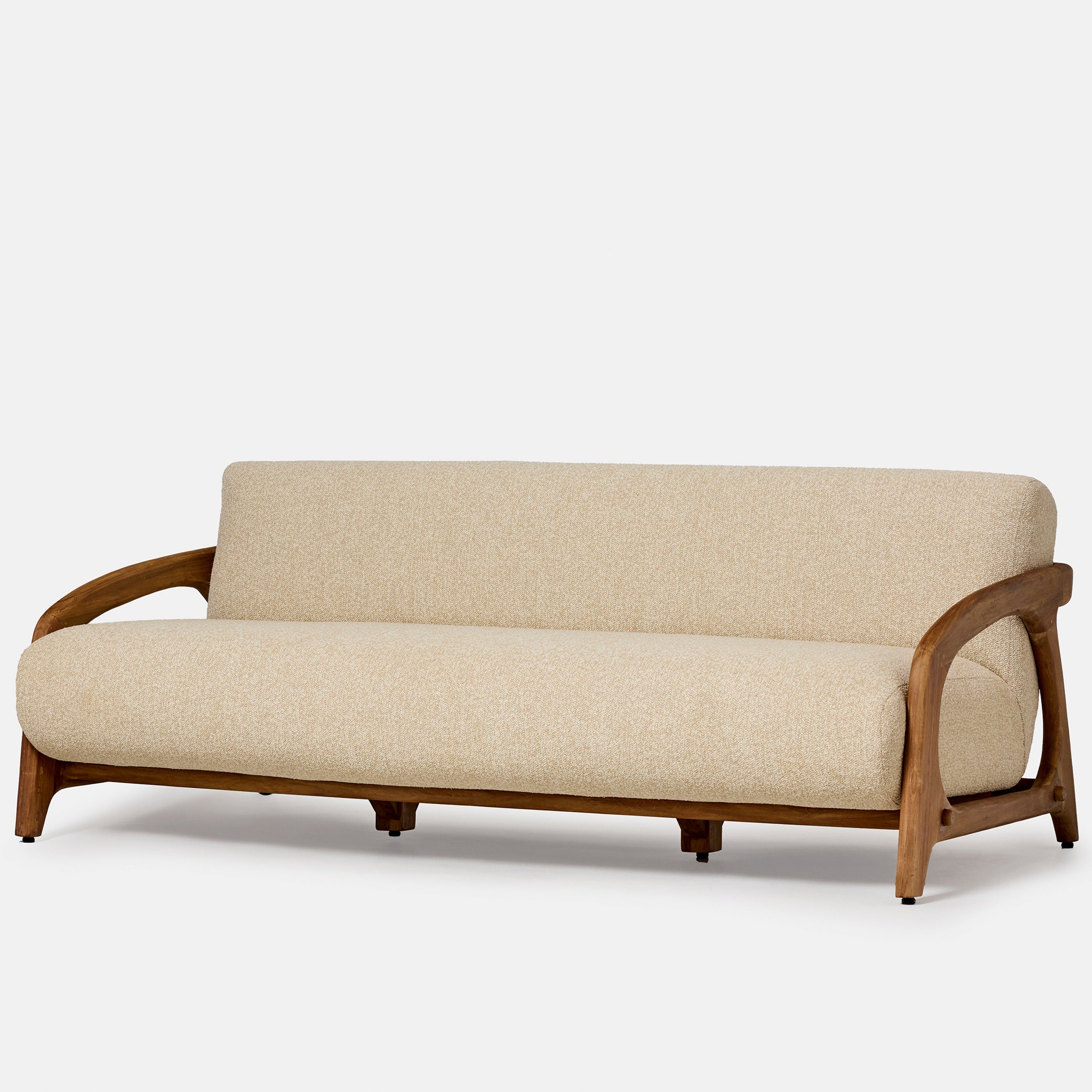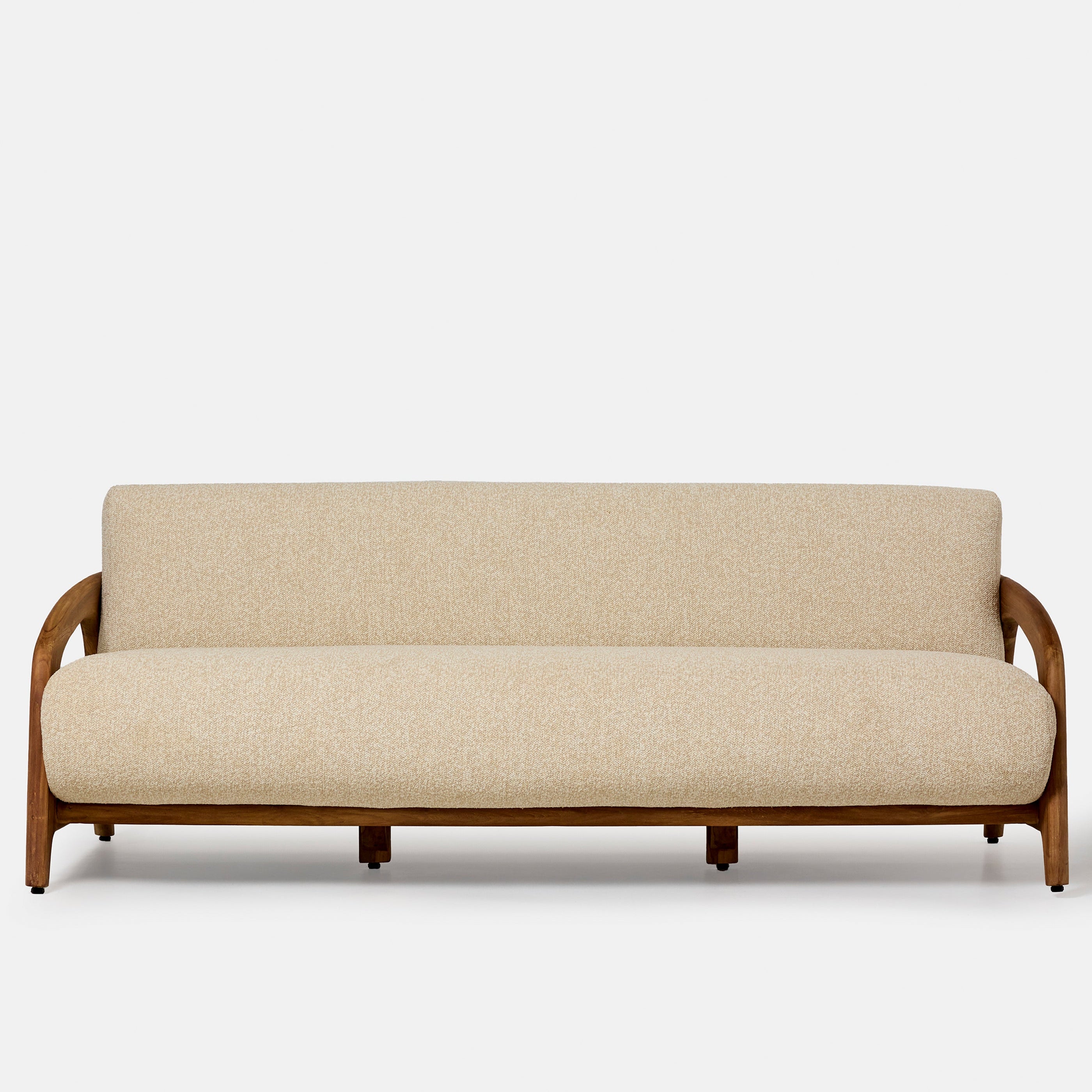 Canapé extérieur 3 places en teck massif recyclé Pola avec coussins en tissu déperlant. Mobilier de jardin design, durable et confortable, idéal pour terrasse, patio ou jardin. Style bohème chic, naturel et contemporain pour extérieur haut de gamme.
