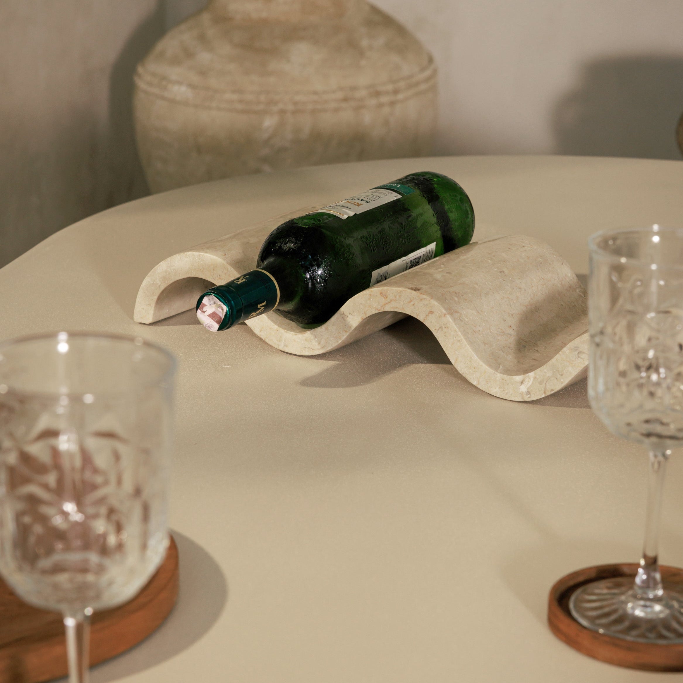Le porte-bouteilles Koh se distingue par sa forme ondulée sculptée dans un marbre blanc poli. Ce support à vin en pierre naturelle habille une table, un bar ou une salle à manger d'un accent minéral net, à la fois décoratif et fonctionnel.