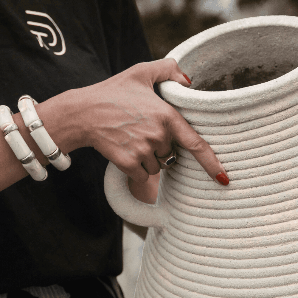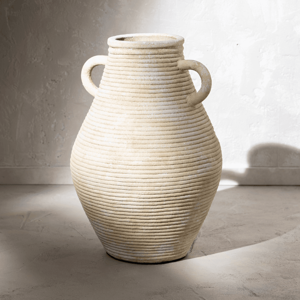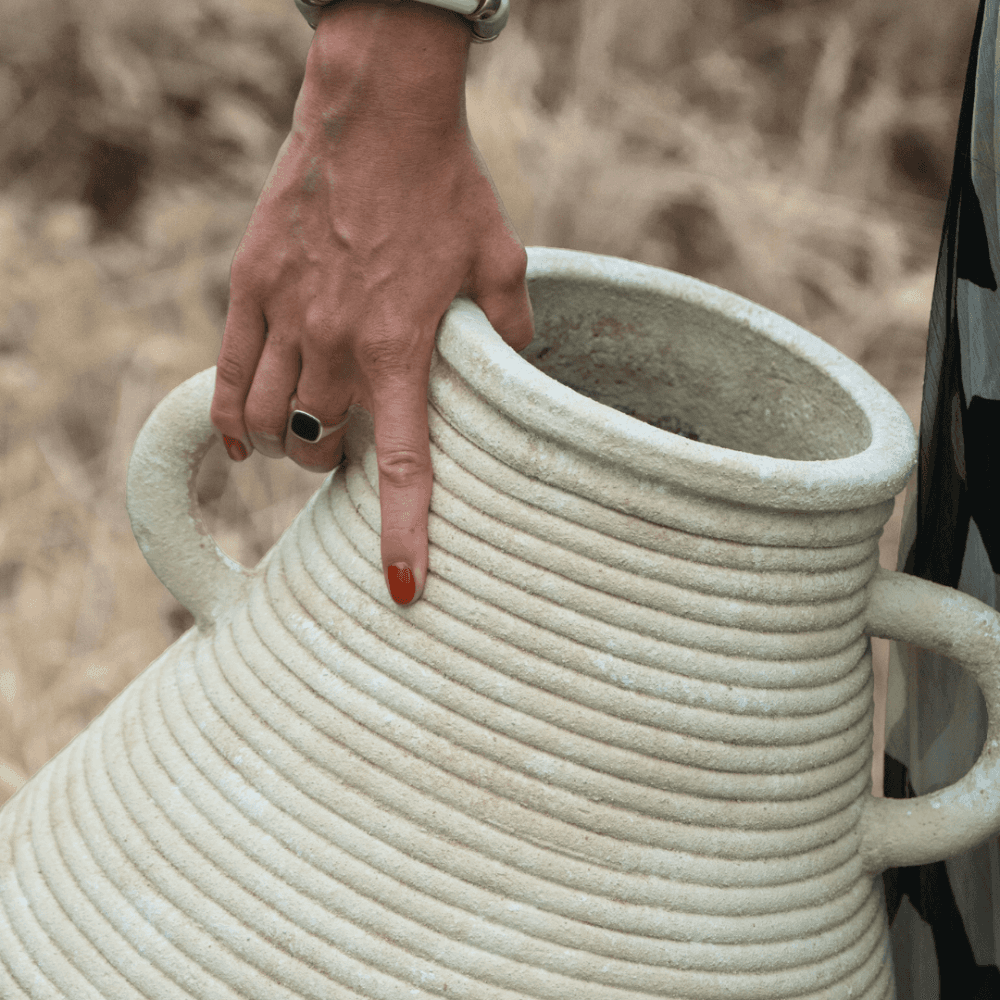 Le relief strié du pot ALAM donne à la terracotta une expression sobre et structurée, adoucie par une finition crème subtilement patinée. Réalisé à la main selon un savoir-faire artisanal traditionnel, il présente des nuances et de légères variations qui soulignent le travail de la matière sans jamais alourdir sa ligne. Ses doubles hanses renforcent son dessin et lui apportent un détail décoratif distinctif, équilibré par une forme ample et épurée. Installé dans une entrée, posé au sol dans un salon ou placé dans un coin plus minéral, il trouve facilement sa place dans des décors wabi-sabi, bohèmes ou minimalistes. Utilisé seul, il compose un accent décoratif texturé; accompagné de plantes ou d’un arbuste, il structure l’espace avec justesse. Sa teinte claire met en valeur la terre cuite et s’accorde aisément à des matières naturelles, du bois aux fibres tressées en passant par le lin. Le pot ALAM conjugue ainsi fabrication artisanale, finition nuancée et usage décoratif dans une pièce à l’allure calme et affirmée.