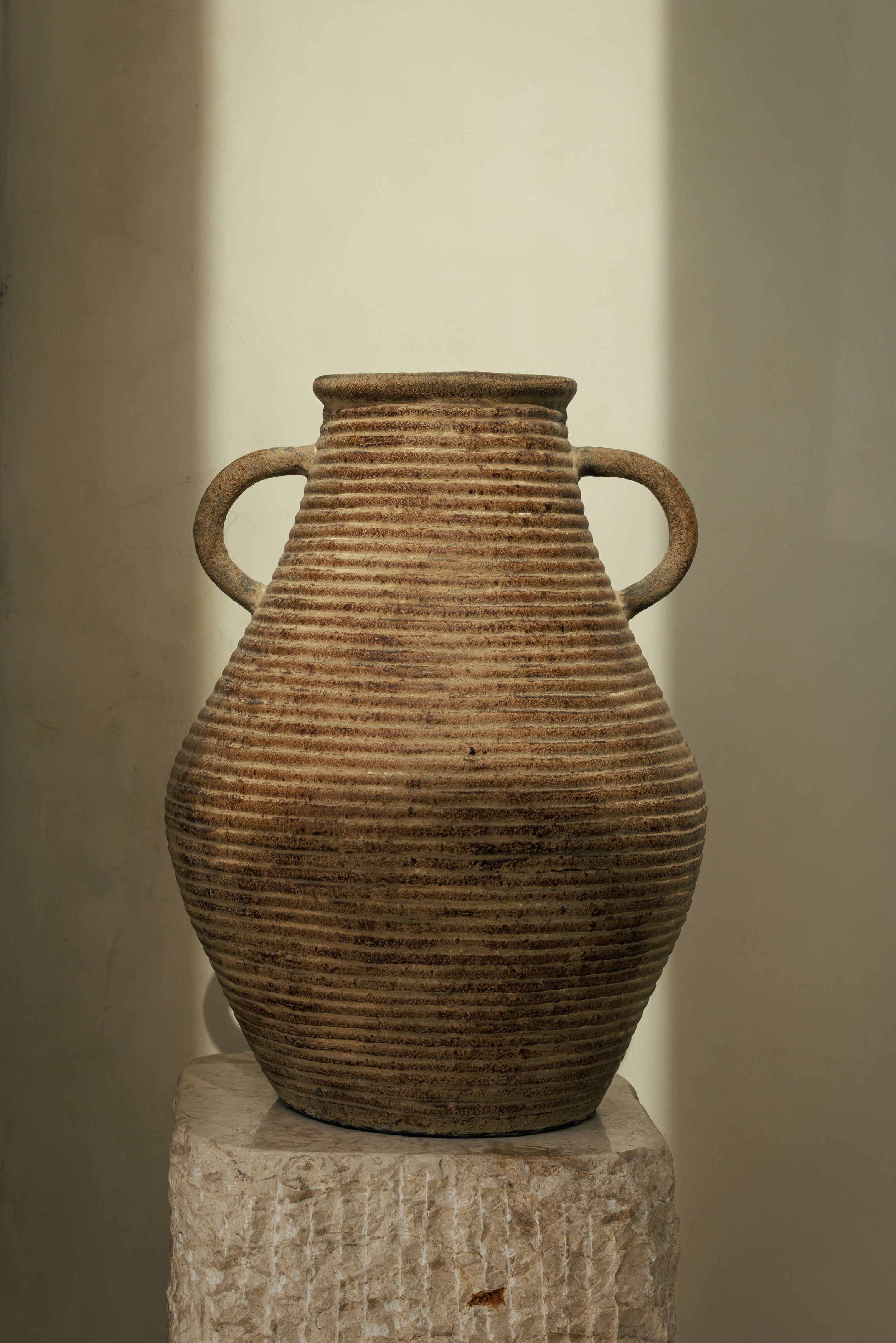 Façonné à la main en Indonésie, ce pot en terracotta striée révèle un travail de la matière brut et maîtrisé, où chaque rainure capte la lumière et souligne le rythme du geste artisanal. Sa silhouette équilibrée, ponctuée de deux anses pleines, évoque les objets anciens pensés pour durer, ceux que le temps patine sans jamais les affaiblir. La finition naturelle, volontairement irrégulière, laisse apparaître les nuances de la terre cuite et apporte une profondeur visuelle qui dialogue parfaitement avec les univers wabi-sabi, japandi ou minimalistes organiques. Posé seul comme pièce décorative ou accompagné de branches ou de fleurs séchées, ce pot structure l’espace avec justesse et affirme un goût pour les objets authentiques, façonnés lentement et sans artifice.