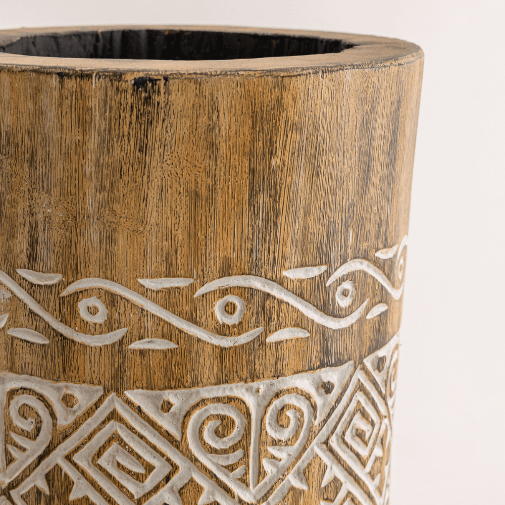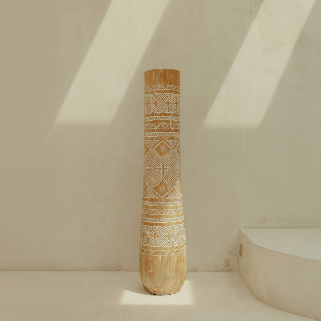 Dans une entrée, un salon ou un extérieur abrité, le pot primitif en bois de cocotier, vase décoratif sculpté à la main, structure l'espace par sa ligne verticale. Le bois de cocotier massif et les motifs blancs soulignent son caractère artisanal et son dessin brut.