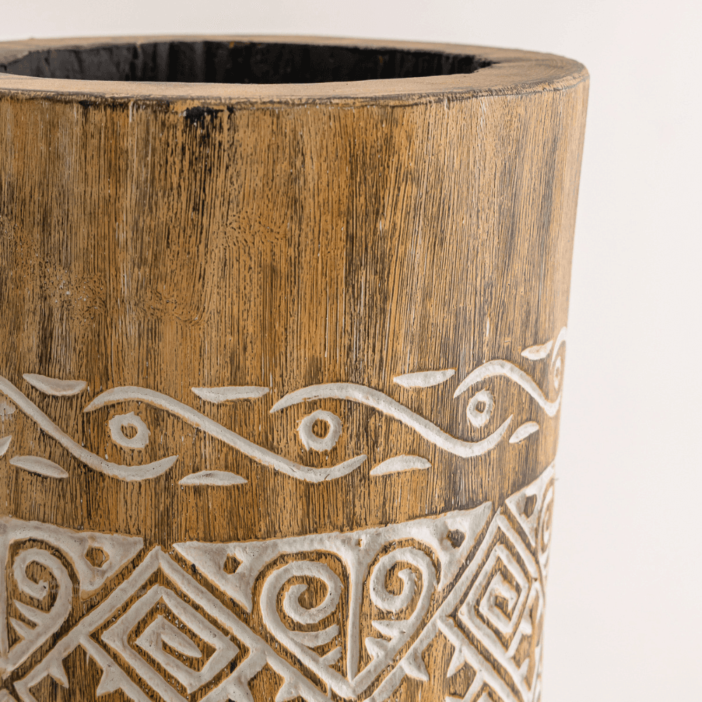 Ce pot décoratif primitif en bois de cocotier, sculpté à la main et rehaussé de motifs blancs, impose une présence majestueuse qui transforme l’espace. Sa hauteur impressionnante lui donne l’allure d’une pièce rituelle, façonnée par le geste de l’artisan et la texture brute du bois. Les motifs blancs se détachent comme une lumière douce sur la matière foncée et racontent un savoir-faire ancien. Installé dans une entrée, un salon ou un extérieur abrité, il devient une sculpture naturelle qui ancre la pièce dans une atmosphère exotique, chaleureuse et authentique.