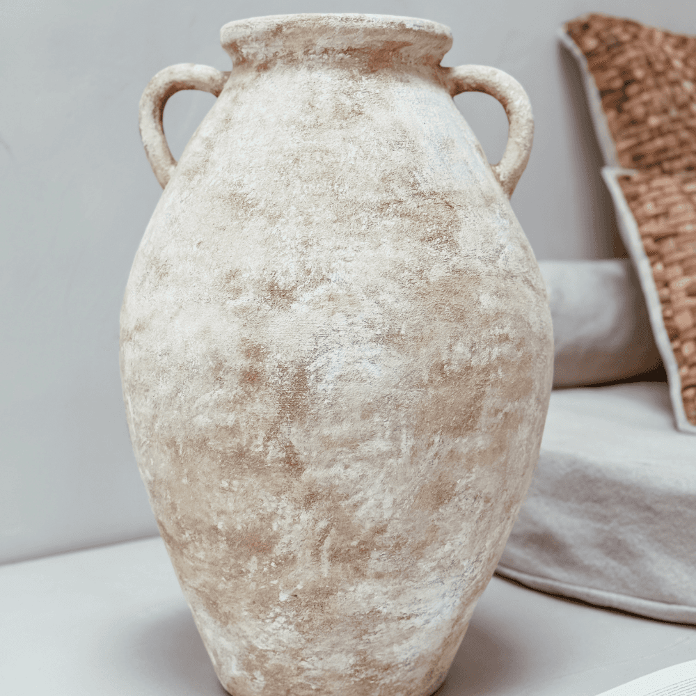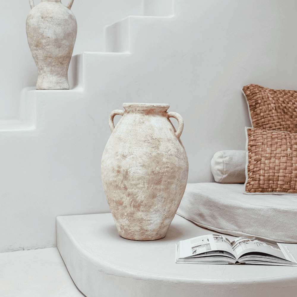 Le vase Indah en argile apporte une note artisanale et minérale à la décoration intérieure. Utilisable avec quelques tiges séchées ou simplement posé seul, il trouve facilement sa place sur un buffet, une console ou une étagère.
