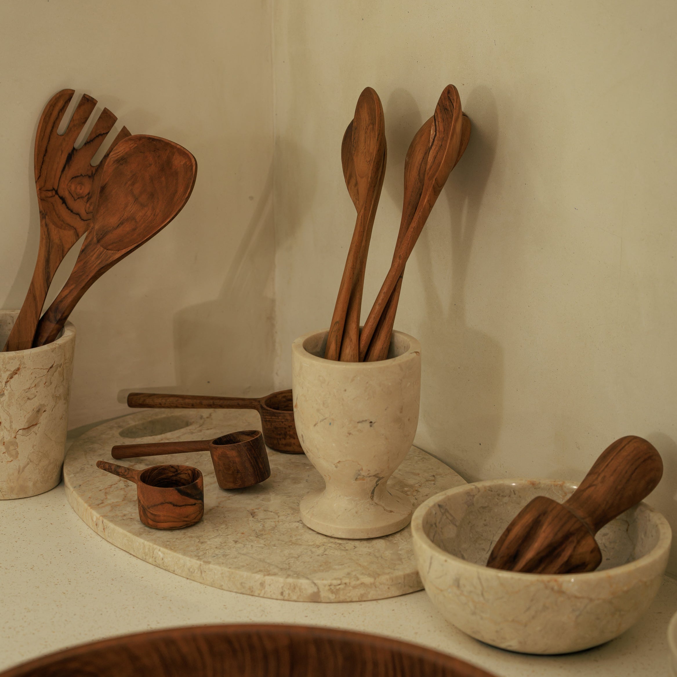 Sur un plan de travail, dans un panier d'ustensiles ou posé sur la table au moment du service, ce presse agrumes en teck s'intègre avec naturel aux gestes du quotidien. Sa forme simple va droit à l'essentiel et facilite l'extraction du jus de citron, d'orange ou de pamplemousse, sans mécanisme ni effet superflu. Le bois de teck massif, travaillé à la main, lui donne une finition lisse et un caractère artisanal discret qui trouvent facilement leur place dans une cuisine soignée. Chaque pièce présente ses propres nuances, ce qui en fait un objet utile autant qu'un bel accessoire à laisser visible. Son dessin compact accompagne aussi bien la préparation d'une marinade, d'un assaisonnement ou d'un jus minute qu'un service à table plus soigné. L'ensemble reste sobre, authentique et durable dans son usage, avec cette simplicité bien pensée que l'on apprécie dans les ustensiles que l'on utilise souvent. Une idée cadeau juste pour ceux qui aiment les objets pratiques, bien faits et réalisés dans une matière naturelle.