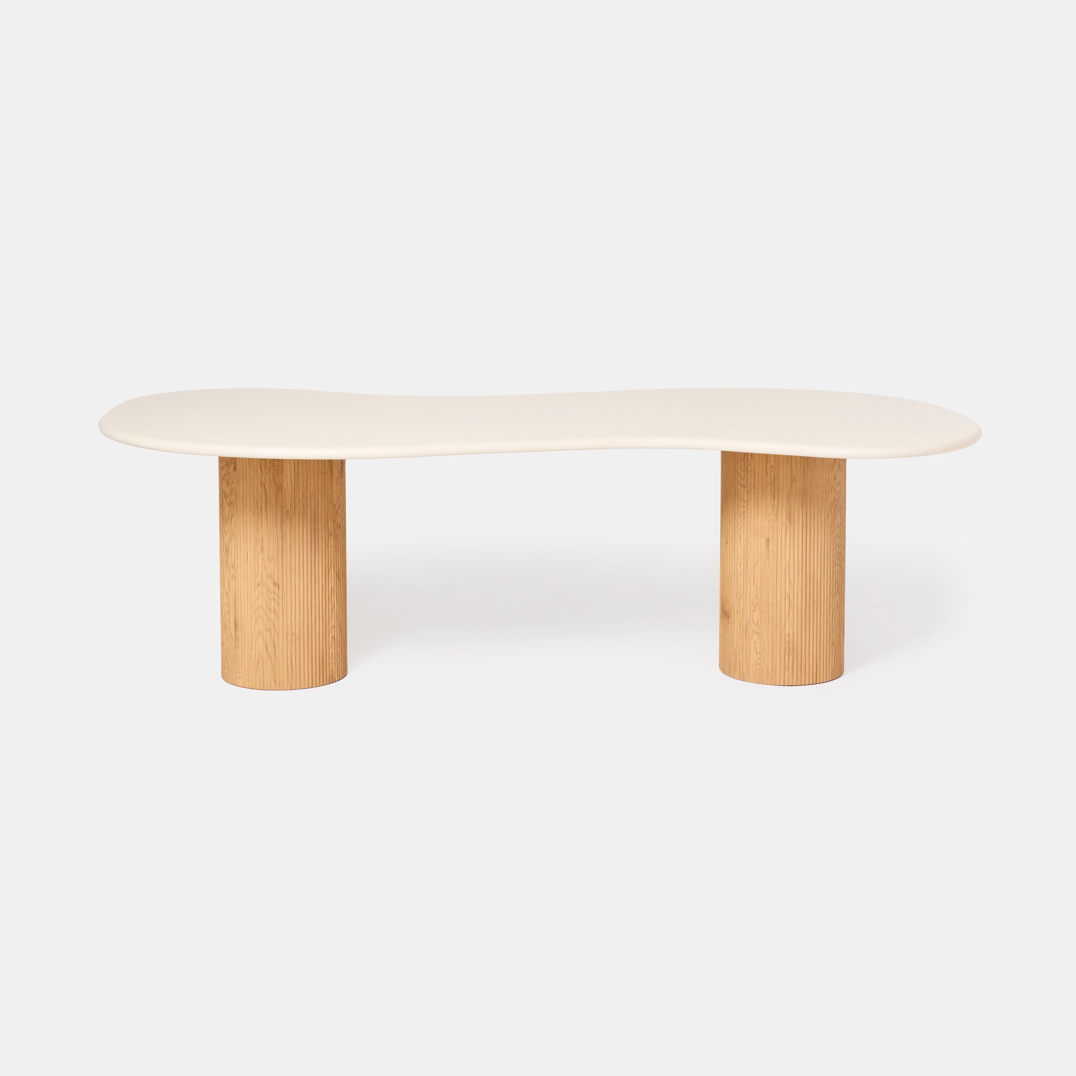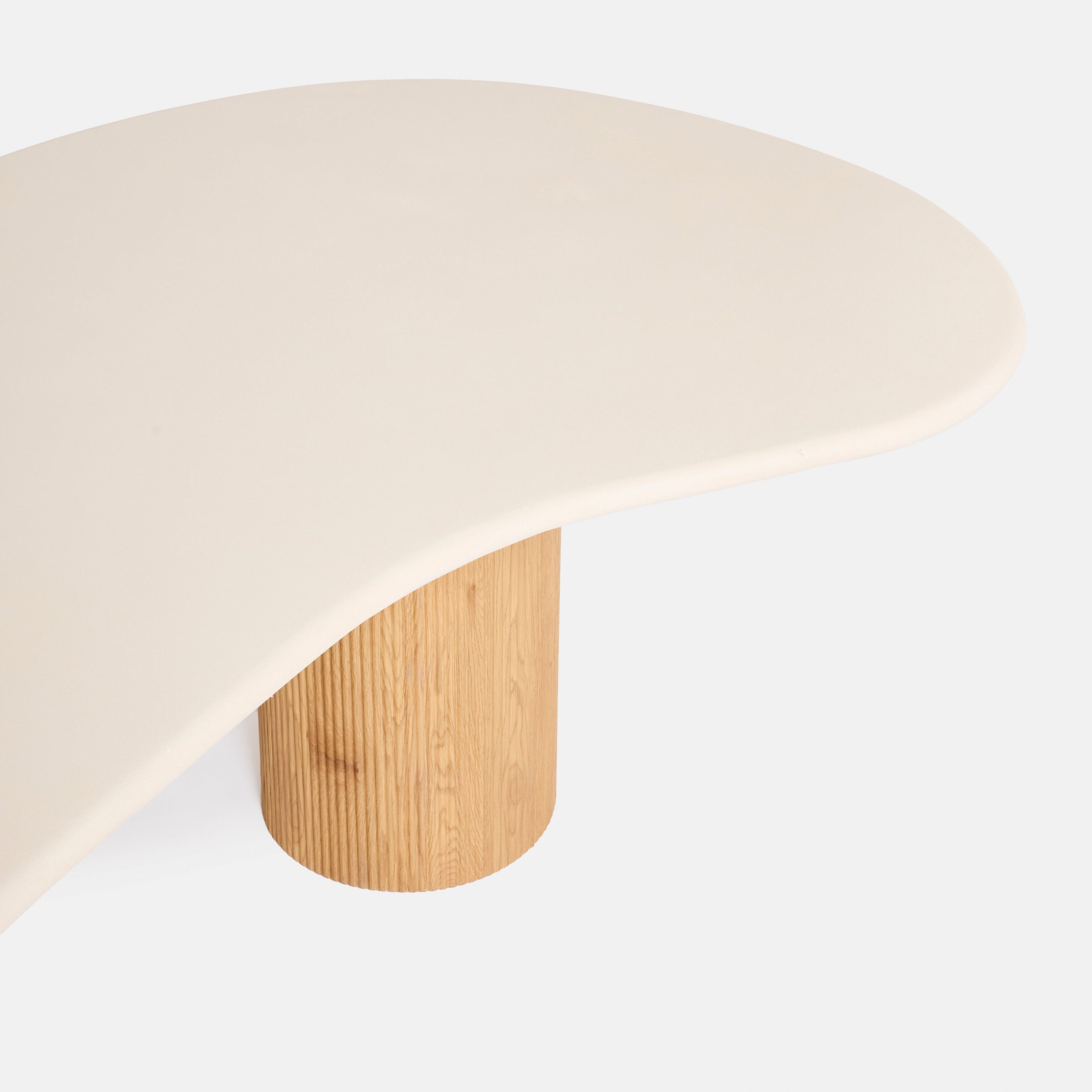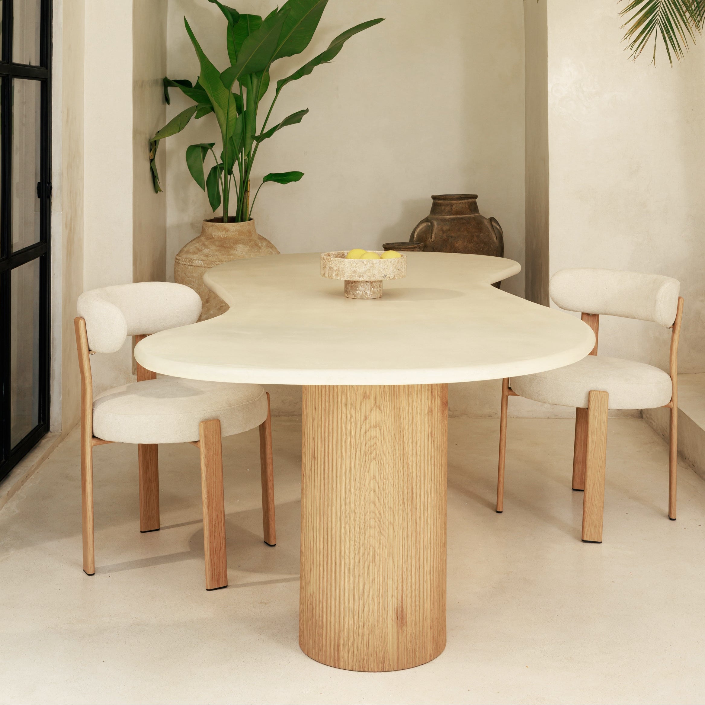 Table à manger organique en béton avec pieds en bois clair strié, la table Riva est une pièce design contemporaine idéale pour une salle à manger japandi, minimaliste ou wabi sabi. Son plateau en béton clair et ses pieds bois naturel apportent luminosité, douceur et élégance à un intérieur moderne et haut de gamme.