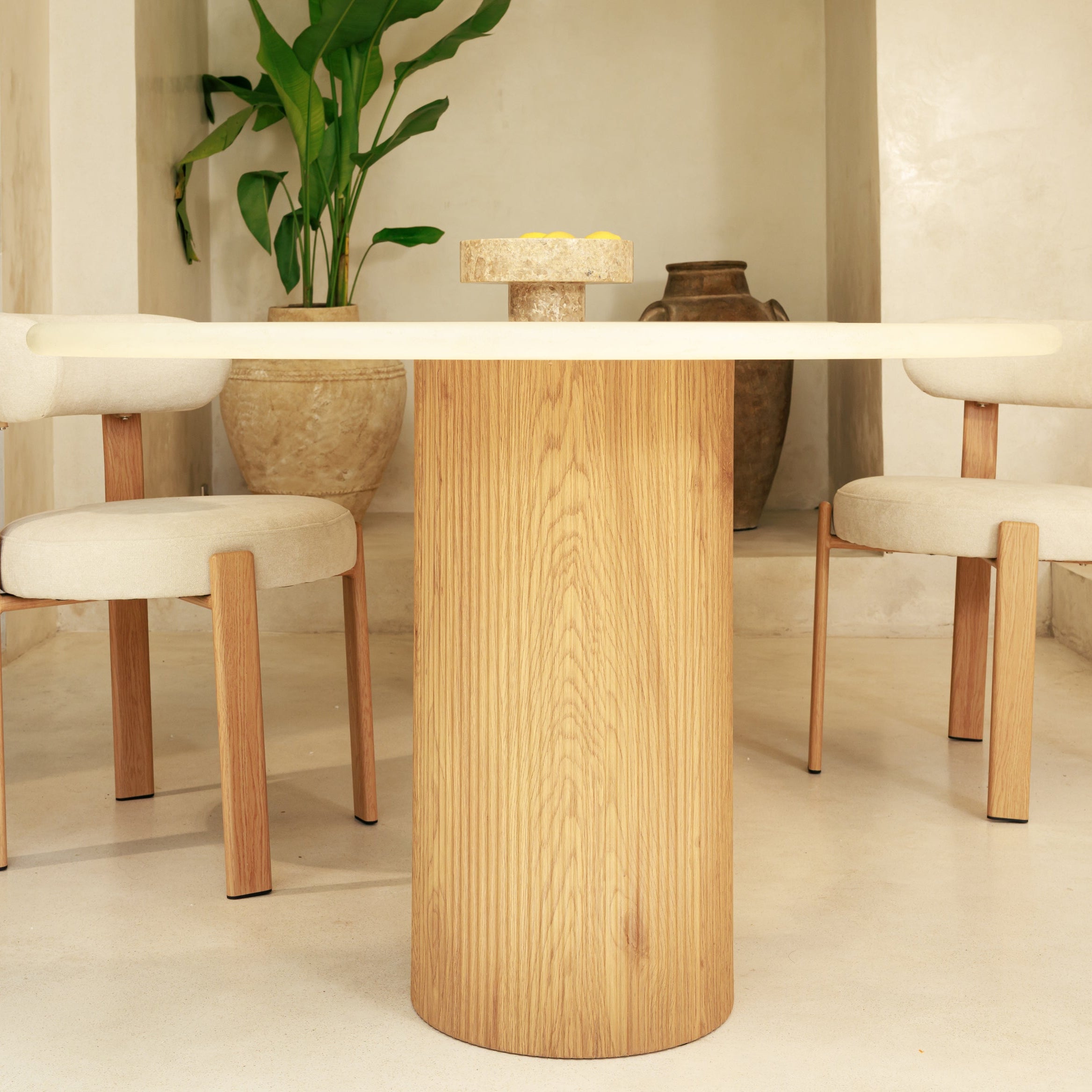La table Riva s’exprime ici dans une version lumineuse et sculpturale, où le béton clair se déploie comme une surface douce et silencieuse, presque crayeuse sous la lumière du jour. Sa forme organique, libre et enveloppante, adoucit les volumes et invite naturellement à se rassembler autour d’elle. Les pieds cylindriques en bois clair strié introduisent un rythme subtil, une verticalité délicate qui capte la lumière et fait vibrer la matière avec finesse. L’ensemble crée une harmonie naturelle entre minéral et végétal, entre densité et légèreté. Dans une salle à manger, Riva installe une atmosphère claire et élégante, un espace où les matières respirent et où chaque moment partagé s’inscrit dans une sensation de calme, de beauté et d’équilibre, fidèle à l’esprit Design Trip.