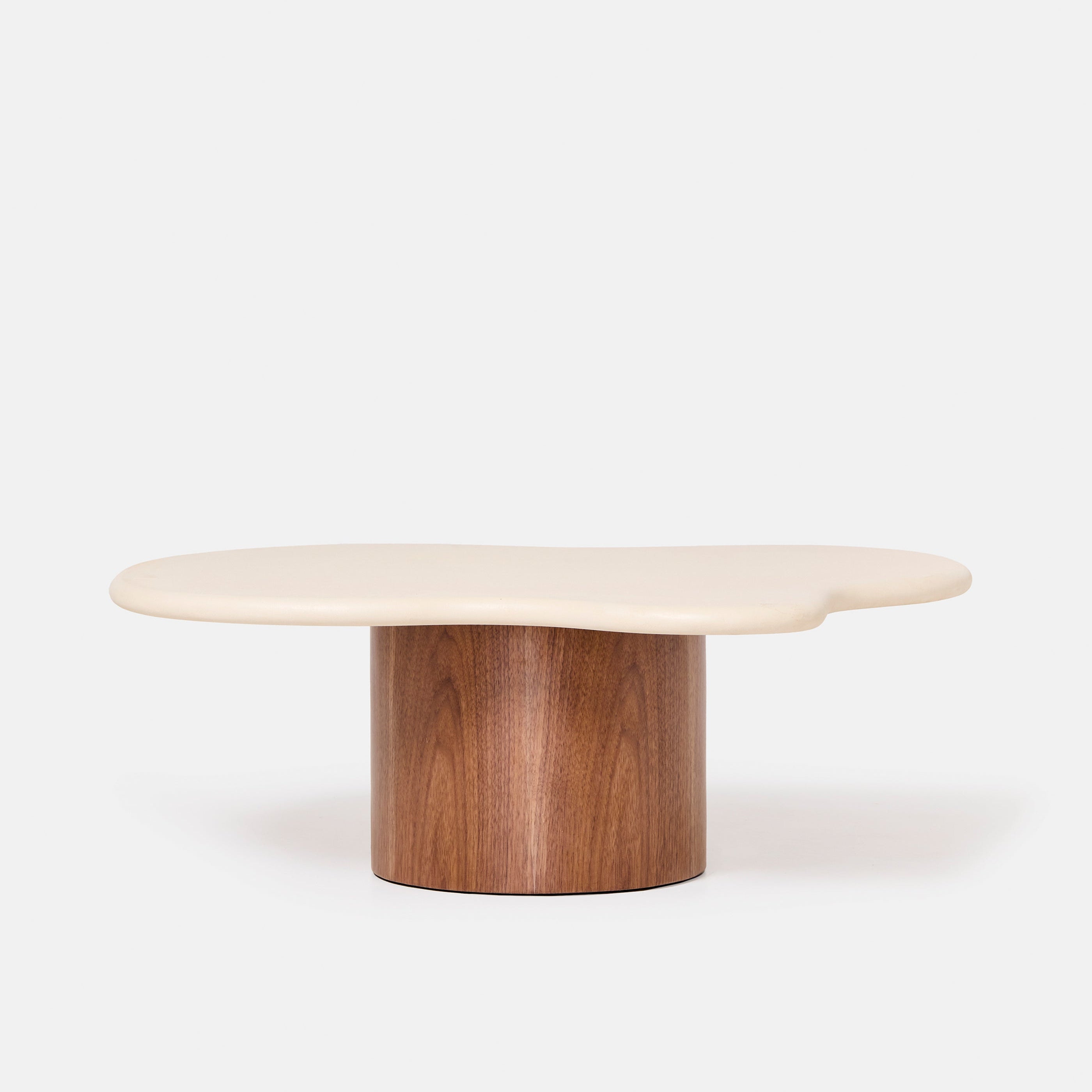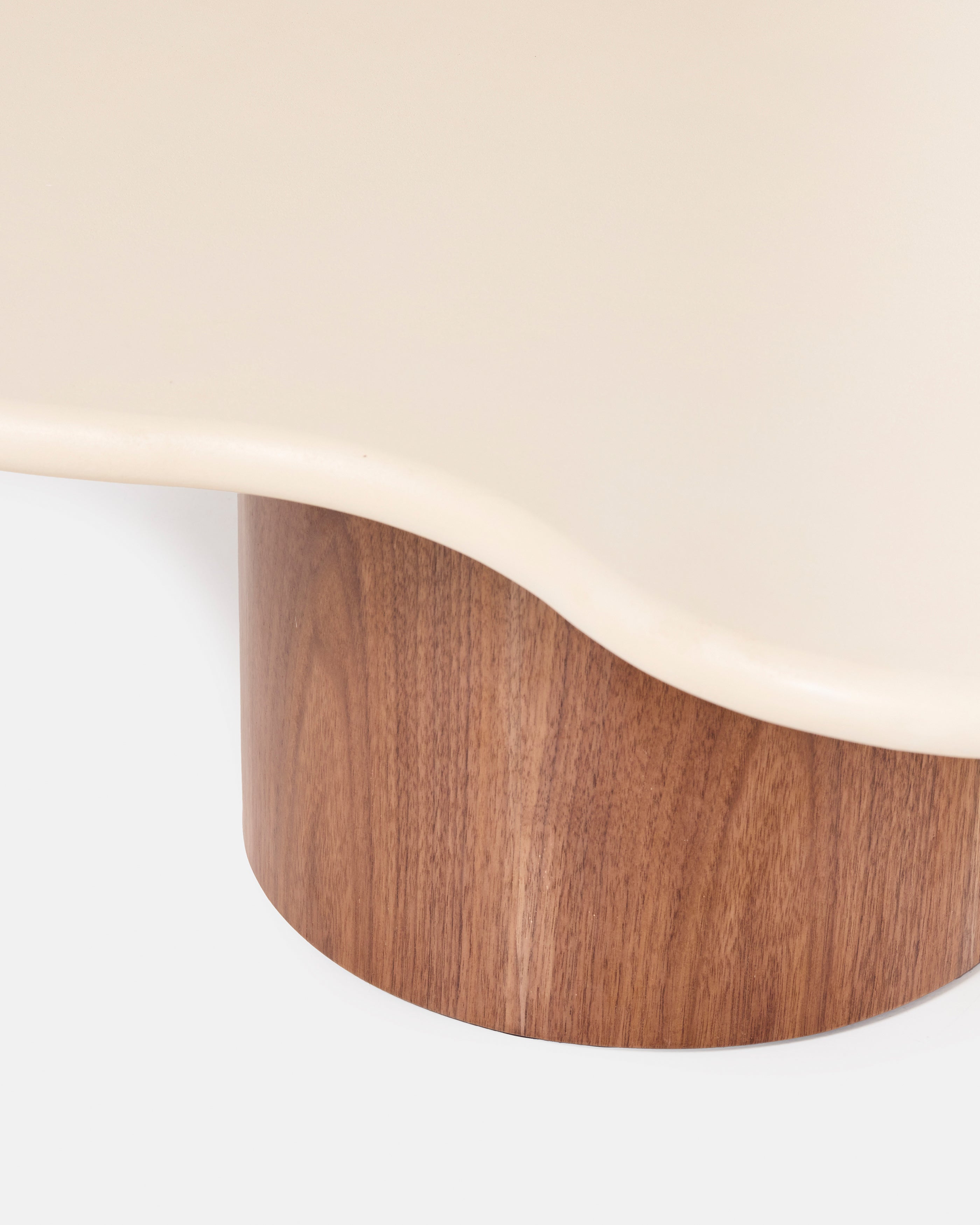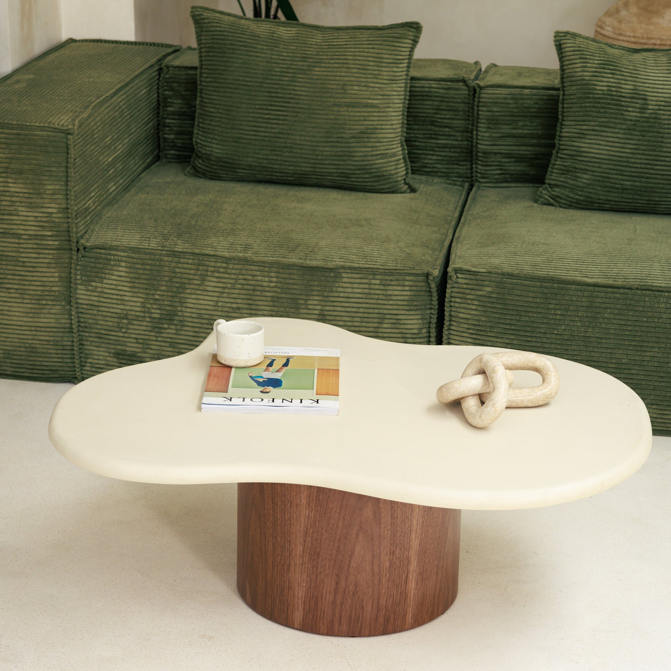 Table basse design en béton et pied placage noyer, Riva Coffee incarne une table basse organique et contemporaine idéale pour un salon wabi sabi, japandi ou minimaliste. Son plateau en béton clair aux formes libres associé à un pied cylindrique en placage noyer strié en fait une pièce centrale décorative, à la fois table basse design, table basse en béton, table basse organique et mobilier de salon haut de gamme inspiré des tendances déco actuelles.