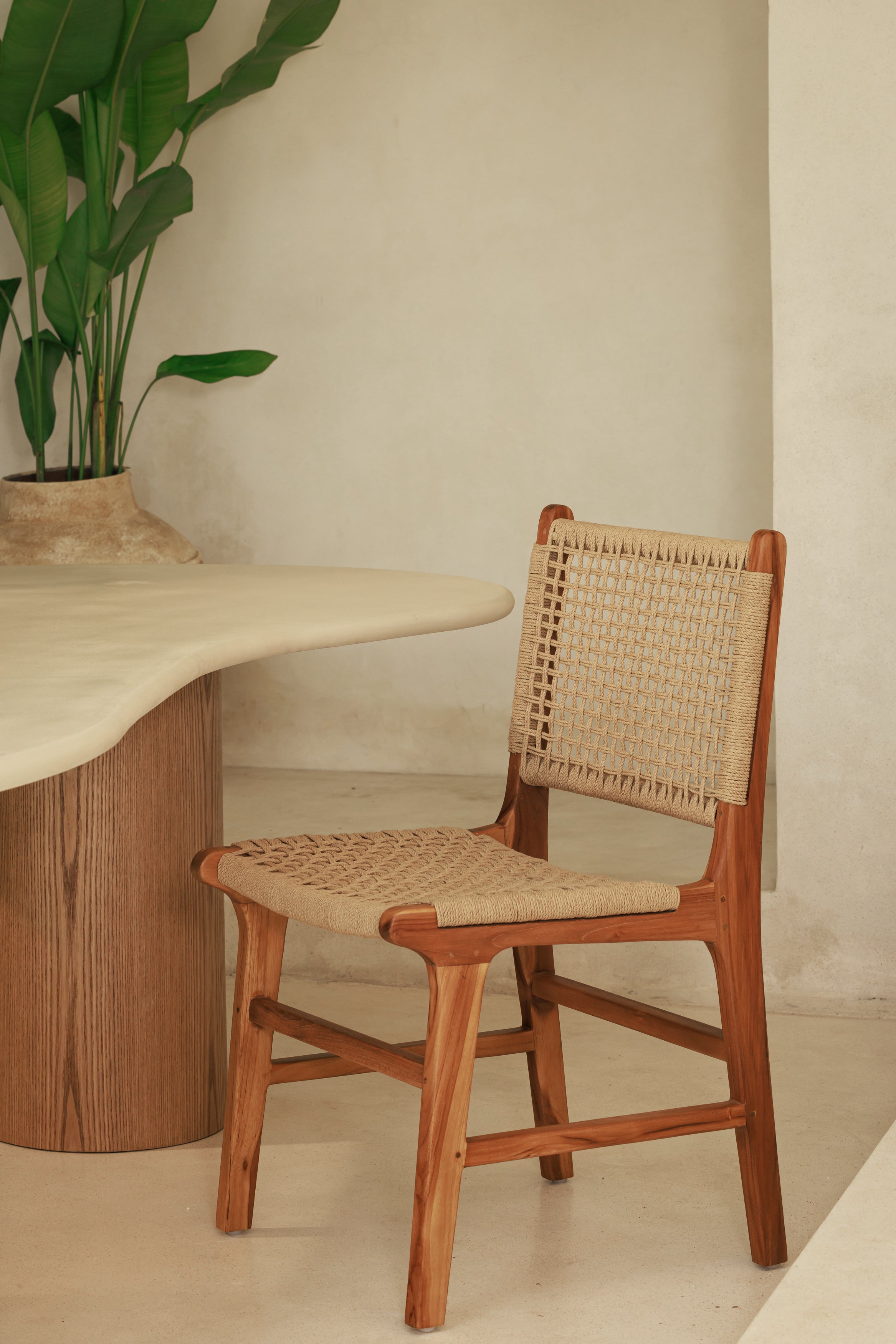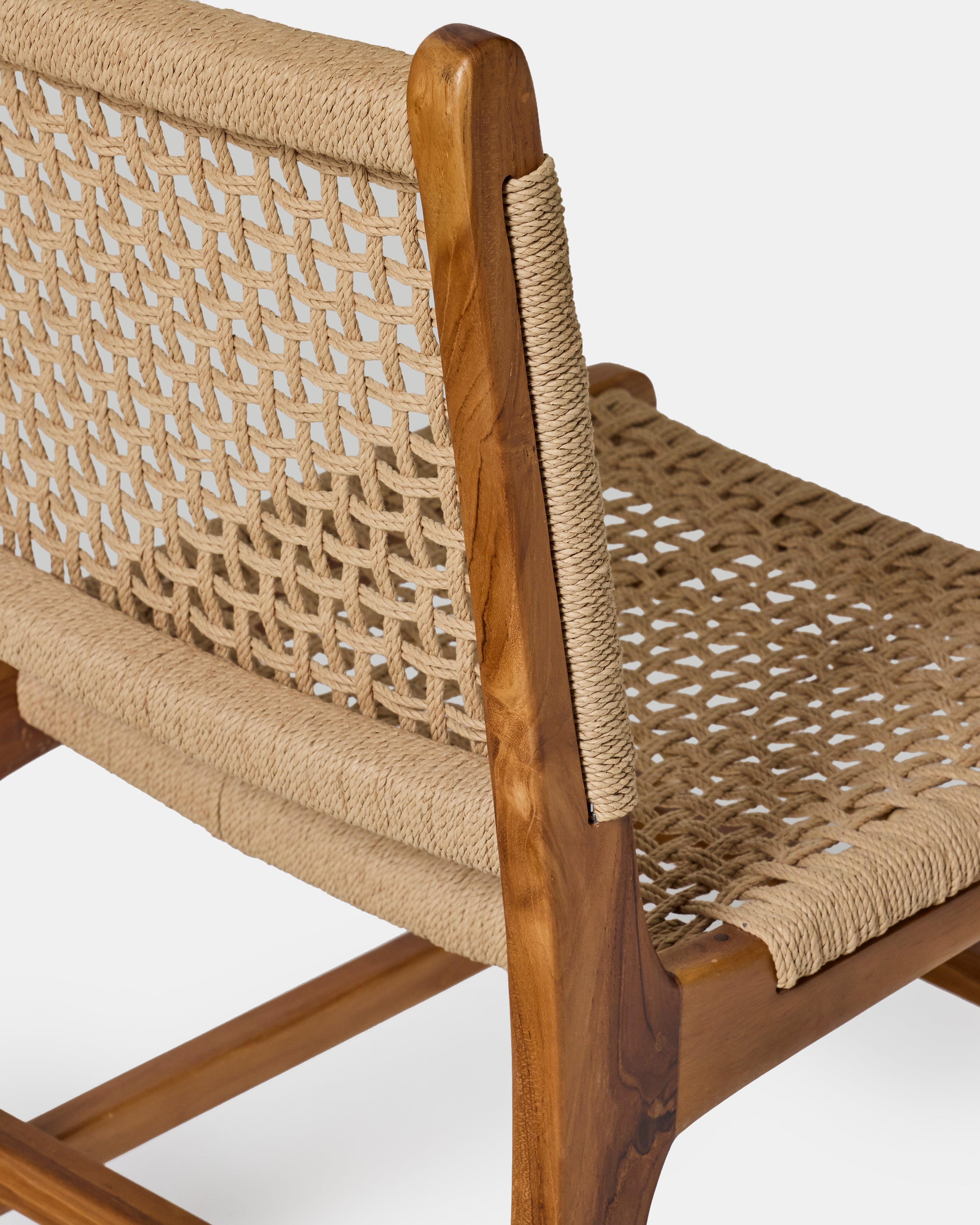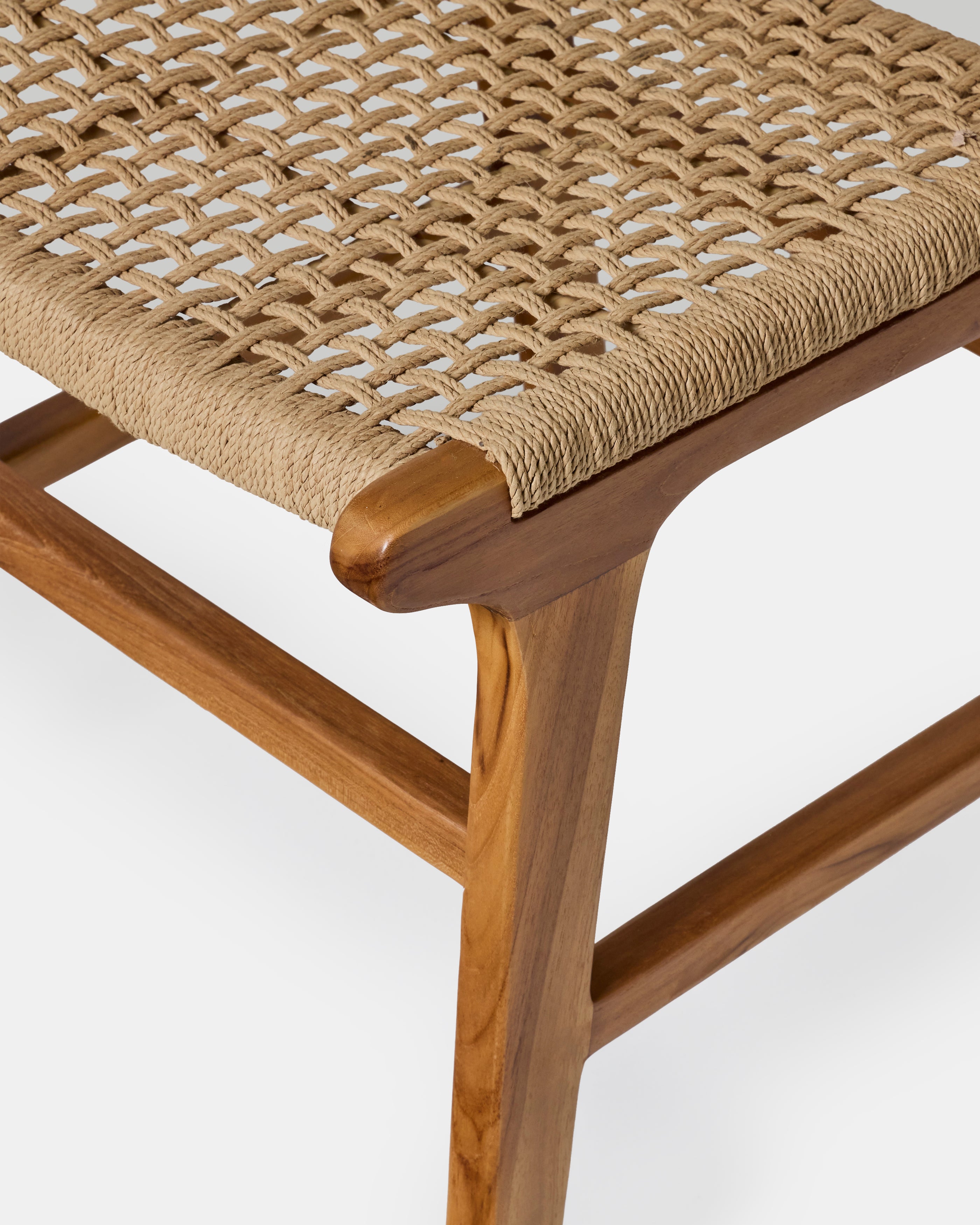 Chaise Roxy en teck naturel et corde tressée, idéale pour une salle à manger, un intérieur bohème chic ou un univers wabi sabi.